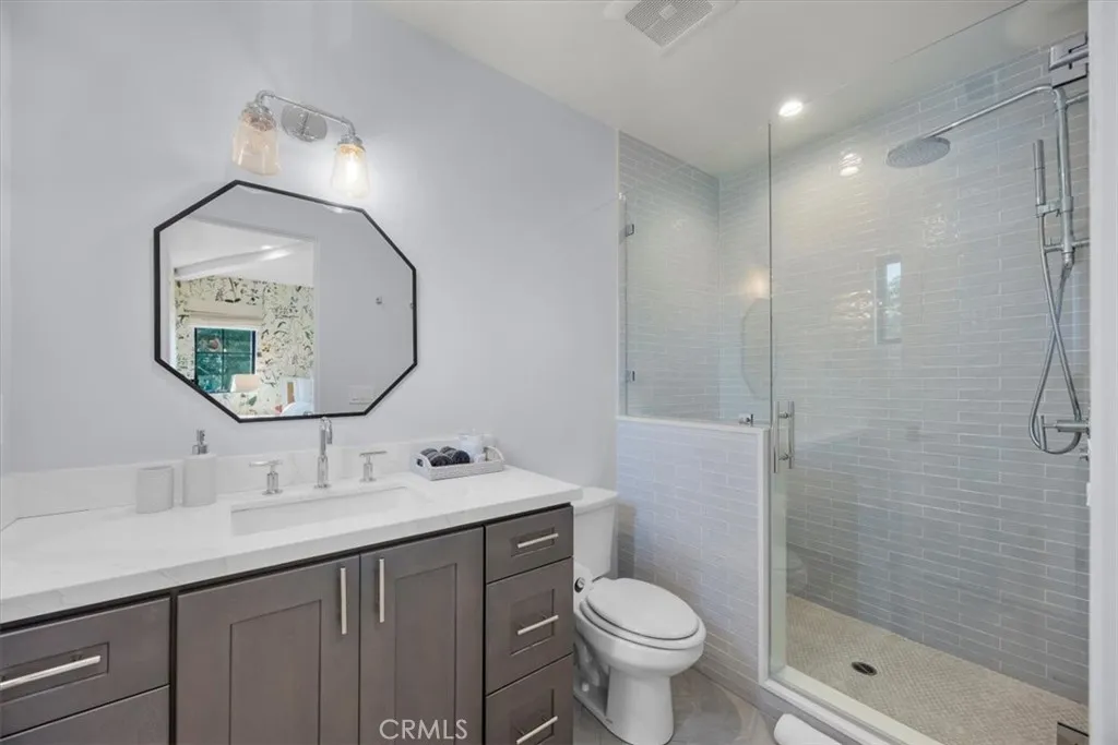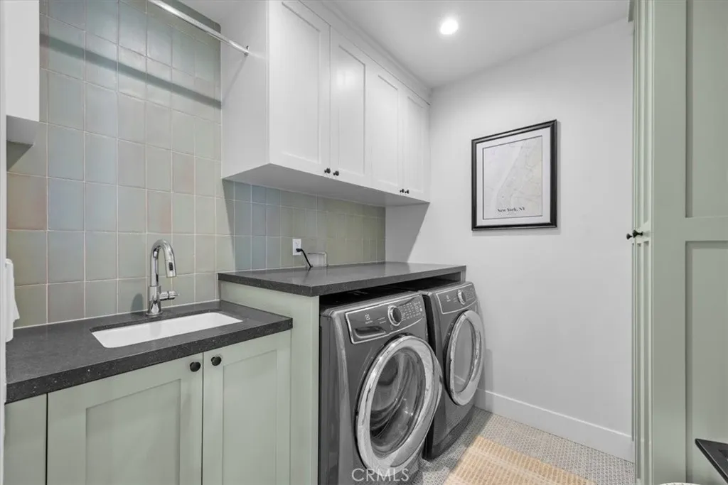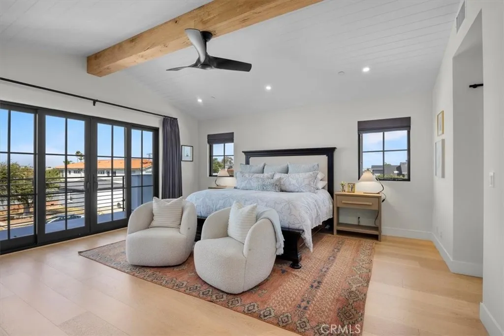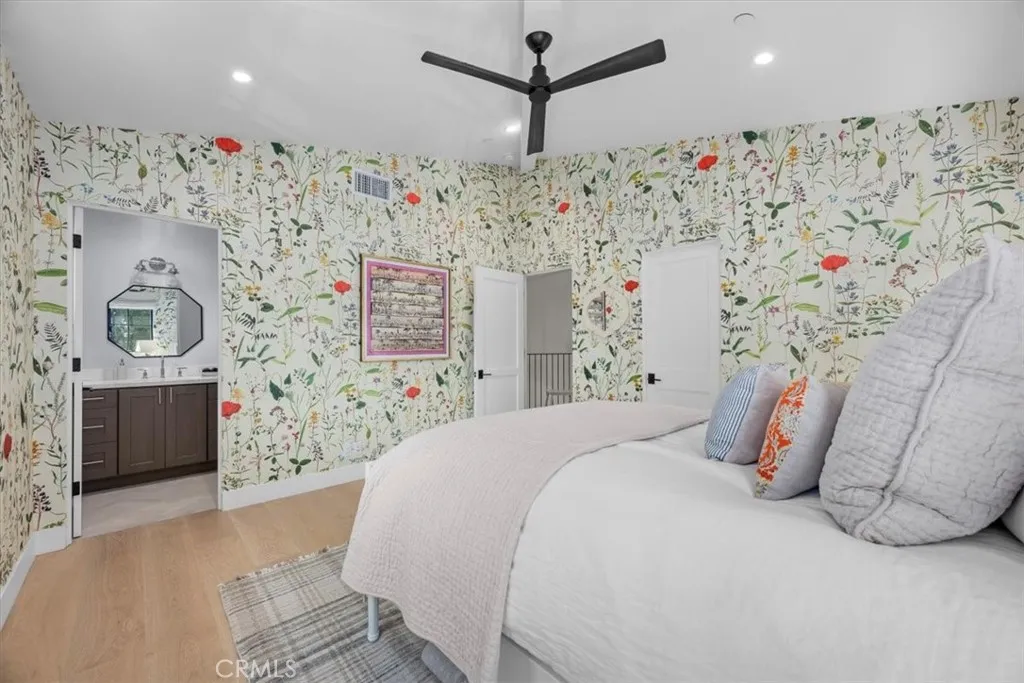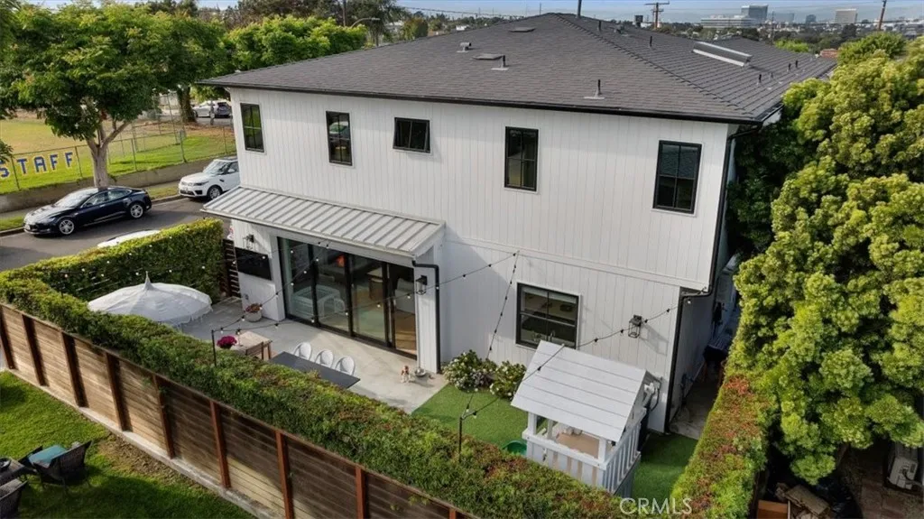 This exceptional five-bedroom, five-bath residence offers a seamless blend of indoor comfort and outdoor sophistication. Designed with timeless craftsmanship and thoughtful detail, the open layout flows effortlessly from welcoming living spaces to a serene backyard retreat. Created in collaboration with a decorator who previously worked closely with Nancy Meyers, the home captures that signature sense of warmth and layered refinementspaces that feel both timeless and effortlessly livable. The family room features reclaimed wood beam ceilings, custom built-ins, and a striking fireplace, opening through concealed stackable sliders to an inviting outdoor lounge with a built-in BBQ, bar counter, and firepit-ready seating area. The professionally landscaped yard includes eco-conscious turf and a spacious play areaideal for entertaining or relaxing in style. The chefs kitchen is both functional and refined, anchored by a generous island with handcrafted cabinetry, floating wood shelving, designer tilework, and stone countertops. A walk-in pantry, beverage bar, and top-tier appliancesincluding a built-in beverage refrigeratorcreate an effortless flow between everyday living and entertaining. A light-filled living room with shiplap accents and a cozy fireplace extends to the covered front porch, while a custom built-in mud area and finished two-car garage add convenience. The main-level guest suite offers private outdoor access, perfect for visitors or a dedicated home office. Upstairs, the primary suite is a tranquil retreat with vaulted reclaimed-wood ceilings, a brick fireplace,