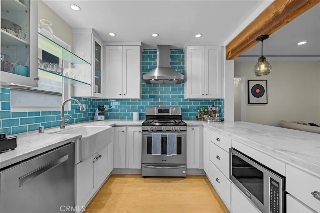 Coastal charm meets modern comfort in this light-filled 3 bed, 2.5 bath home nestled in the heart of the Tree Section of Manhattan Beach. Thoughtfully designed for both everyday living and relaxed entertaining, this home welcomes you with an airy living room featuring vaulted wood-beamed ceilings, rich hardwood floors, and a cozy wood burning fireplace, perfect for cool coastal evenings. The open-concept kitchen is a showstopper, bathed in natural light and accented by marble countertops, bar seating, a farmhouse sink, stainless steel appliances, a wine fridge, and a bold teal tile backsplash. A side door offers easy access to the private backyard, seamlessly connecting indoor and outdoor living. To the right, two generously sized bedrooms share a beautifully renovated full bathroom. To the left, youll find a convenient powder room, a dedicated laundry area with hookups, and the spacious primary suite. French doors open to the side patio, while the spa-like en-suite features a dual sink vanity, stylish tile flooring, and ample closet space. The backyard is an entertainers dream, complete with a custom putting green and room for al fresco dining or weekend BBQs. The home also includes an oversized 2-car garage, offering plenty of storage and space for beach gear, bikes, or a home gym setup. Located moments from award-winning schools, downtown shops and restaurants, and world-class surf, this home offers the best of beachside living.