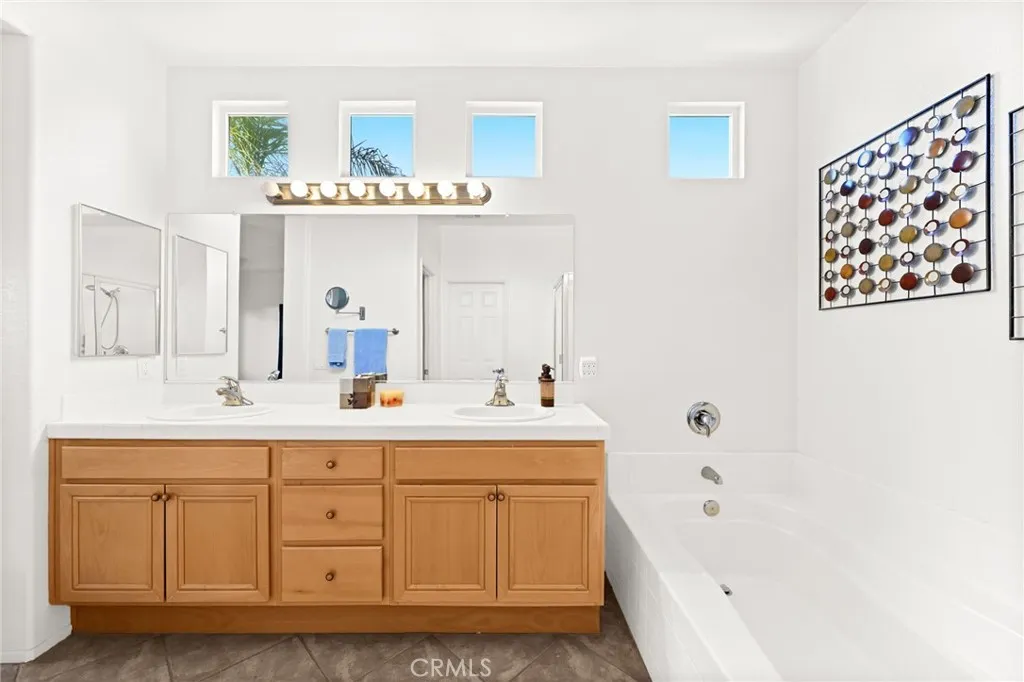 Experience the Messina model in the serene 55 plus Oasis Community. This spacious single-story home offers 2 bedrooms, 2 bathrooms, and a front office within an open layout spanning 1,868 square feet. Inside, you will find beautiful diagonal tile flooring and a well-appointed kitchen featuring granite countertops, a stylish backsplash, and under-cabinet lighting. The kitchen opens to a generous family room that includes a surround sound speaker system, a fireplace, and a slider leading to the backyard with a patio cover and landscaped yard. This model also includes a den that can easily be converted into a third bedroom if needed. The primary bedroom is generously sized and offers a large en suite bathroom with a soaking tub, walk-in shower, and walk-in closet. The oversized two-car garage includes a dedicated golf cart space, which can be used for parking, a workshop, or a hobby area. As a resident of the Oasis Community, you will enjoy access to a wide variety of activities and clubs. The 22,500 square foot clubhouse features a ballroom, exercise facility, billiards room, swimming pool, tennis courts, library, card room, ping pong, shuffleboard, and more. Conveniently located near shopping, dining, and everyday conveniences, this home offers comfort, functionality, and an active lifestyle. Bonus: Low taxes and no Mello Roos.