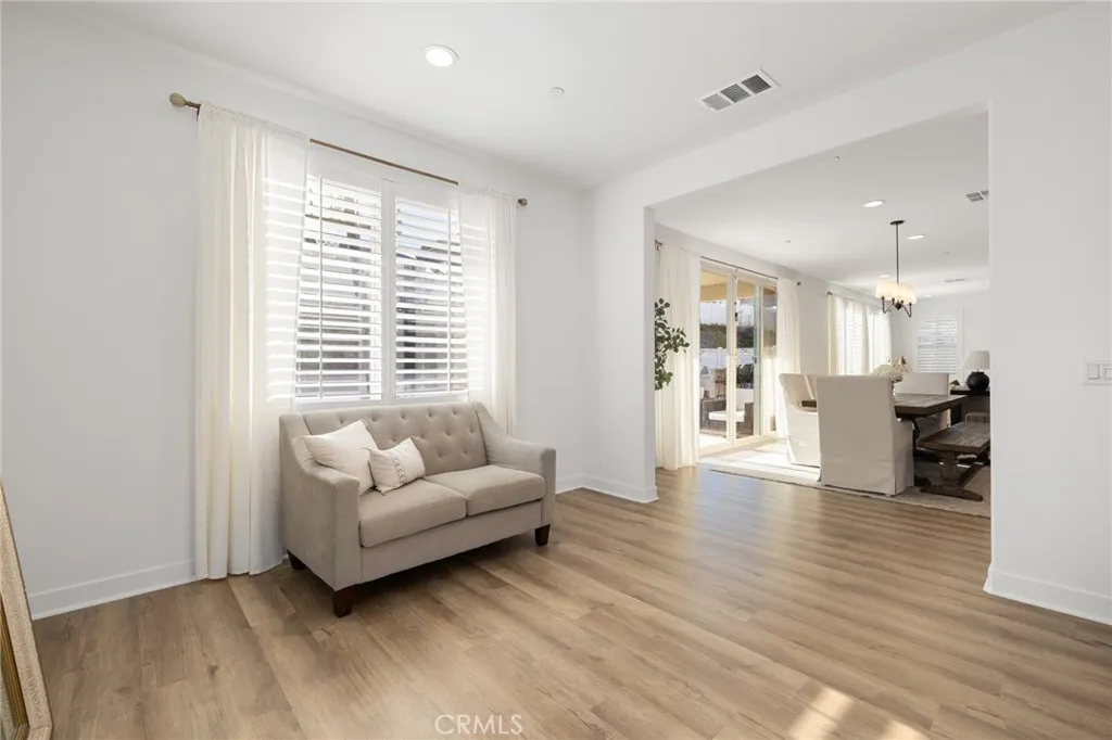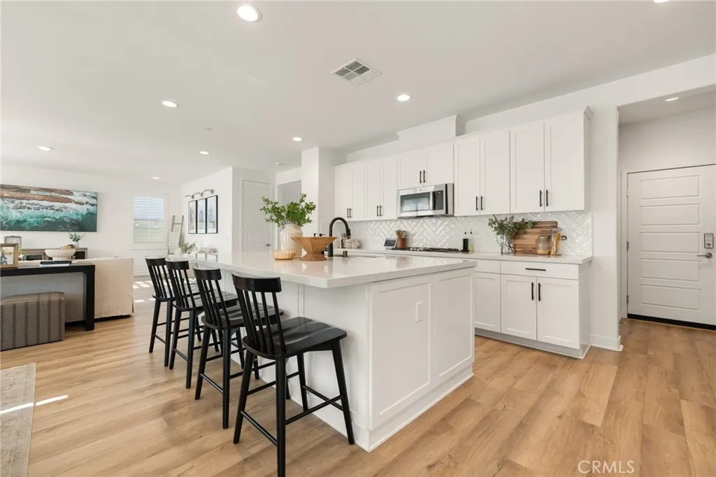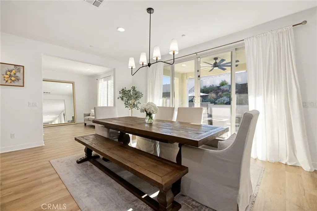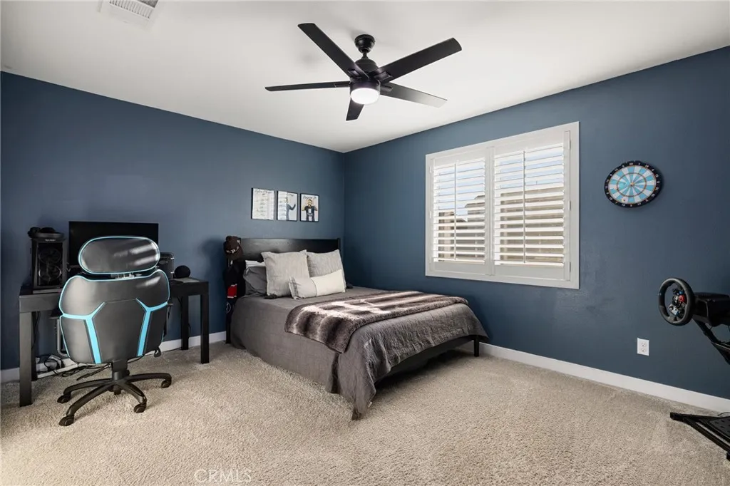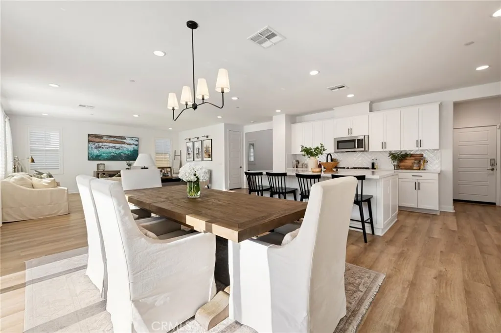 Built in 2022, this pool home blends modern design with timeless elegance, offering 5 bedrooms, 3 baths, and almost 3,400 sqft of living space, crafted for todays luxury lifestyle. This showstopper is located in the highly sought after community of Audie Murphy Ranch in Menifee, on a cul-de-sac with owned solar and a 3-car tandem garage. The properties curb appeal boasts custom concrete stairs, artificial turf, a wide driveway and quaint porch looking to the morning sunrise. As you step inside you are greeted by 30-foot ceilings, a formal foyer, a clean color pallet throughout offering blonde LVP floors, crisp white paint and black finishes. The desirable floorplan features a MAIN FLOOR bedroom with plush carpet and a walk-in closet which is just off the guest bath boasting a single vanity and black framed walk-in shower. The whimsical great room offers tons of natural light and plantation shutters, which are throughout the property. Step through the large dining area youll find a custom black chandelier and 12-foot double glass doors. The chefs kitchen is appointed with quartz counters, herringbone tile backsplash, stainless steel appliances, an extended island, white cabinets offering tons of storage and a custom dry bar across from the large walk-in pantry. The garage offers epoxy floors, and an EV charging station. Also on the main floor is a large flex space perfect for an office, library or 6th bedroom. The grand staircase takes you to the second floor boasting a large loft, built-in cabinets, and oversized laundry room with tons of storage. The three secondary bedroo