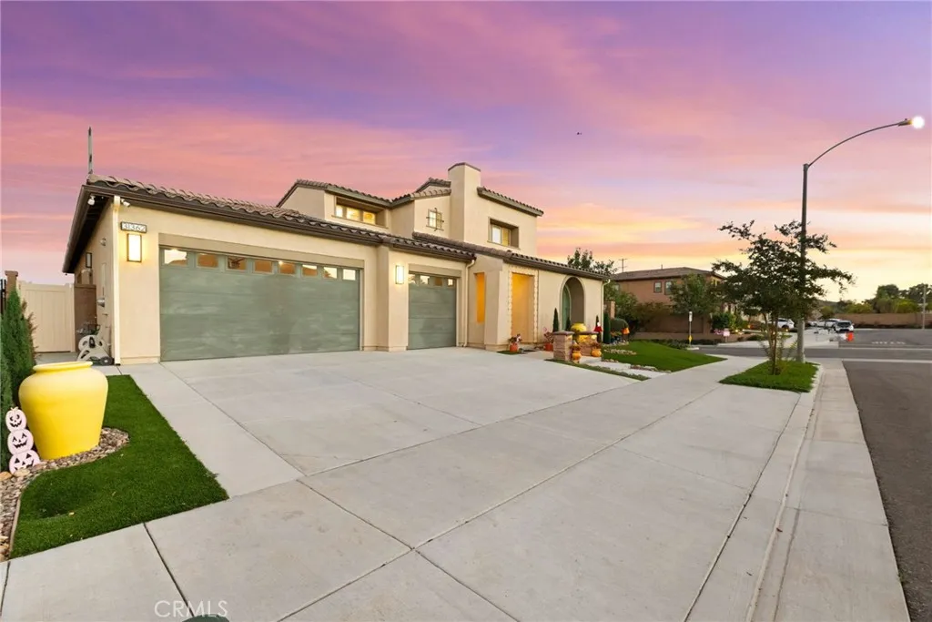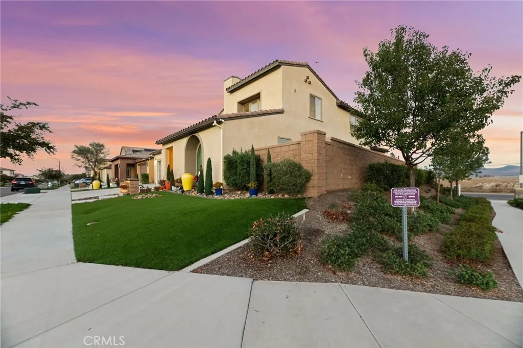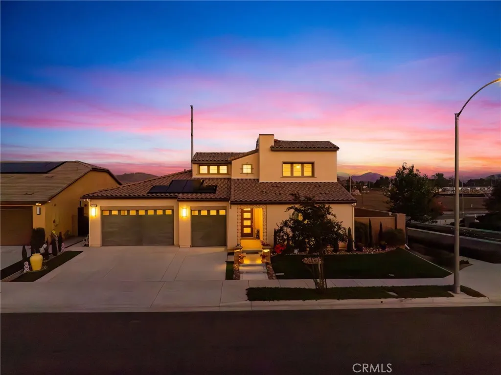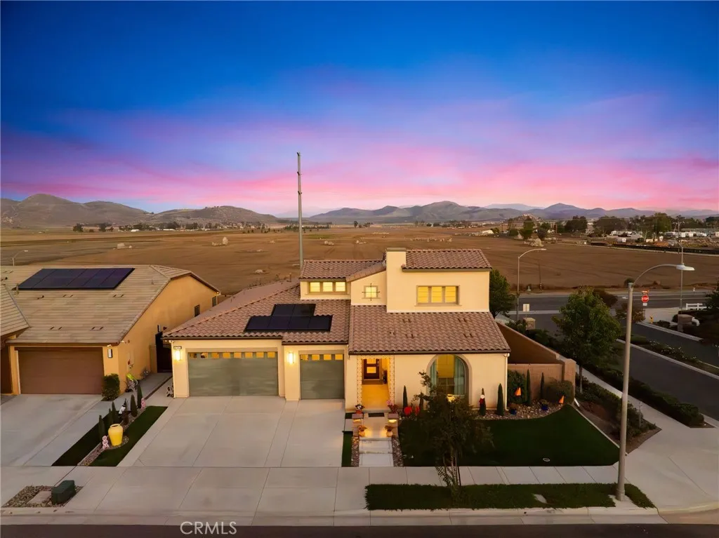 Welcome to this Beautiful, TURN-KEY, Better Than New, Highly Upgraded 4 Bedroom with BONUS Loft, Main Floor Master Bedroom, Modern Single Story Style Home with OWNED SOLAR located in the Prestigious Planned Community of Centennial by Pardee Homes! Perfectly positioned on a premium corner lot with stunning views, this home has no neighboring homes behind and combines timeless elegance with modern comfort. Step inside and be captivated by this unique layout with vaulted ceilings, hardwood floors, and an open-air staircase. The thoughtful floor plan includes three spacious bedrooms conveniently located on the main level and a large loft and guest bedroom on the second level, ideal for flexible living. At the heart of the home lies a chefs kitchen thats both stylish and functionalfeaturing GE appliances, double ovens, dual-tone countertops, and an expansive island perfect for entertaining. The home also offers ample storage and a three-car garage, ensuring space for everything you need. Upstairs, retreat to a private haven complete with a generous loft (potential 5th bedroom) an oversized secondary bedroom, and a full bathroomperfect for guests, teens, or a home office. Your backyard paradise awaits with an extended covered California Room patio, low-maintenance concrete and artificial turf, along with raised planter beds ready for your garden creations. Enjoy the luxury of Paid-Off Solar, energy-efficient upgrades, and a low HOA in one of Southern Californias fastest-growing cities. Conveniently located near top-rated schools, parks, shopping, and freeways, this home offers th