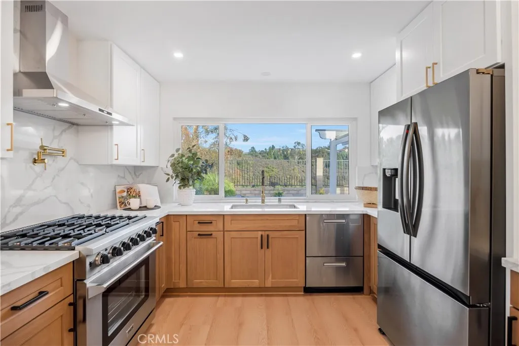 SELLER IS WILLING TO PAY TOWARDS CLOSING COSTS AND/OR INTEREST RATE BUY DOWN. This beautifully renovated single story home sits on a quiet cul de sac in Mission Viejo and perfectly blends modern upgrades with style and functionality. Every detail has been thoughtfully designed, from energy efficient systems to designer finishes, making it a truly move in ready residence. Inside, high end waterproof hybrid laminate flooring flows seamlessly throughout, accented by modern baseboards, fresh paint, updated outlets, switches, hardware, and energy efficient LED recessed lighting. The fully remodeled gourmet kitchen showcases custom white and oak Shaker cabinetry with soft close drawers, quartz countertops with a full height backsplash and waterfall edges, ceiling height cabinets, touchless sink with pot filler, and professional grade appliances including a 36" 6 burner Thor gas range, Thor drawer microwave, Thor wine fridge, GE Profile double drawer dishwasher, Samsung refrigerator, and sleek range hood. An elegant farmhouse chandelier and updated fireplace bring warmth to the family room, while new hallway cabinetry and a high capacity washer dryer with overhead storage add convenience. The primary suite offers a spa like retreat with a walk in shower featuring oversized shampoo niches, double vanities with quartz counters, soft close cabinetry, and upgraded fixtures. All bathrooms have been fully remodeled with modern cabinets, countertops, faucets, mirrors, and low flow toilets. Each bedroom has new flooring, baseboards, paint, and lighting for a fresh, modern feel. Additional