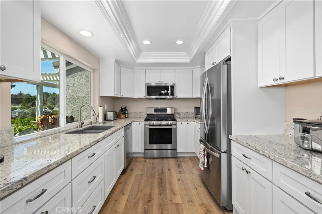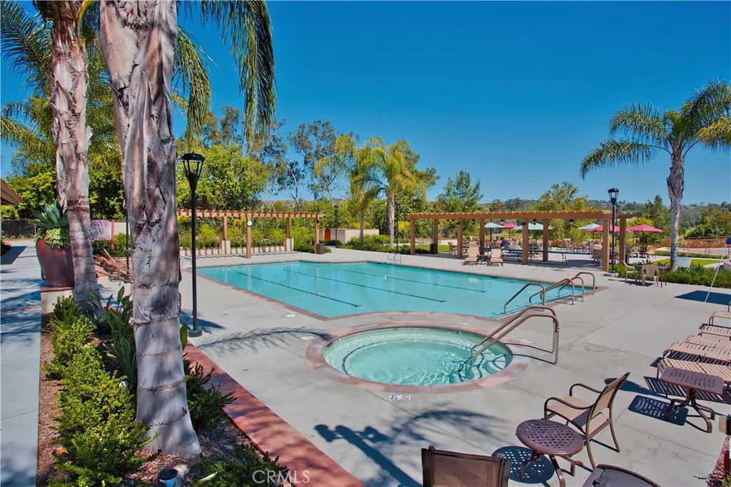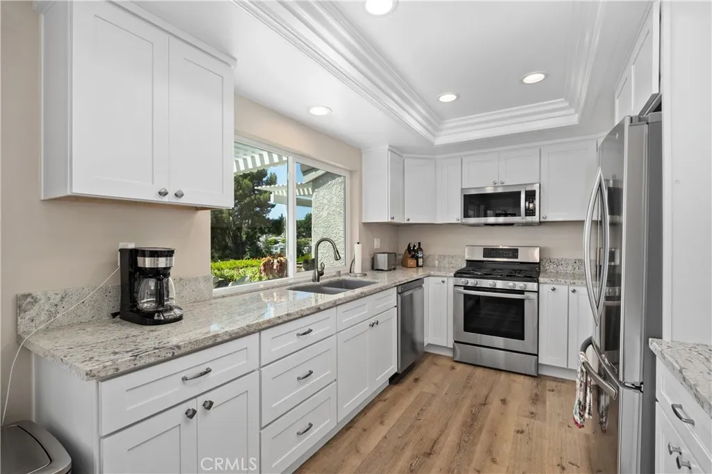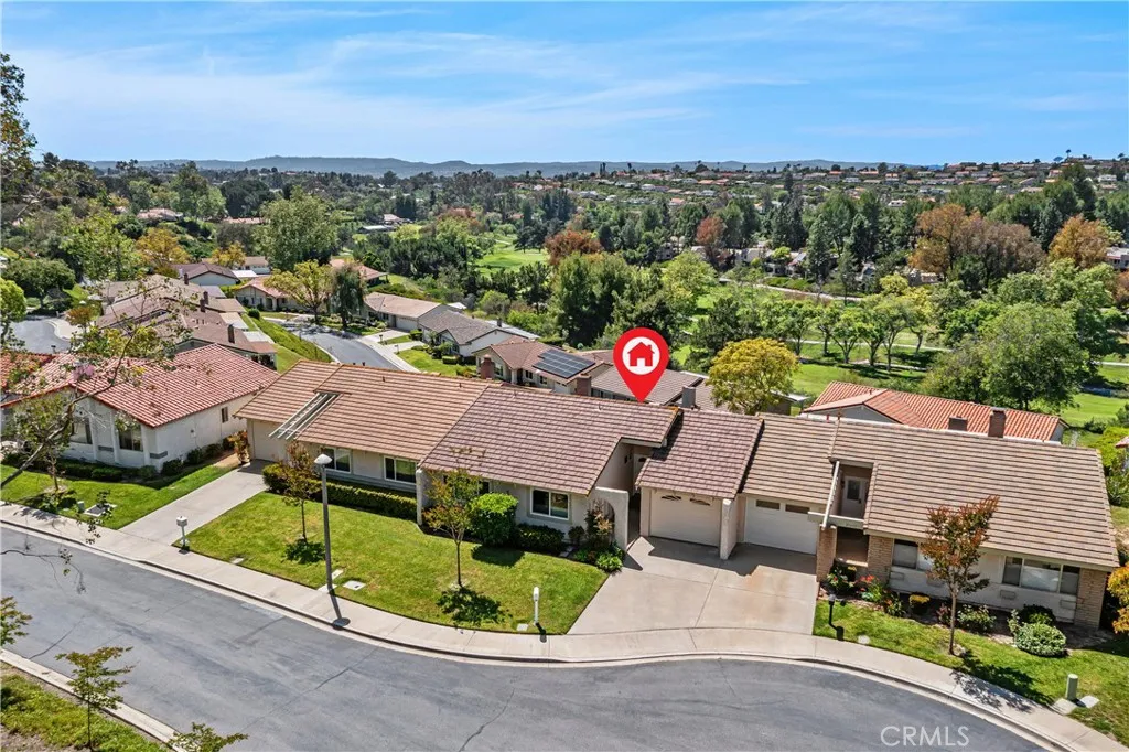 NOW AVAILABLE IN THE GATED 55+ COMMUNITY OF CASTA DEL SOL! This charming single-level residence is ideally situated at the end of a quiet cul-de-sac on a desirable single-loaded street, offering added privacy and PANORAMIC WESTERLY SUNSET VIEWS. Featuring 2 bedrooms, 2 bathrooms, and a direct-access single-car garage, this tastefully upgraded home blends comfort, functionality, and scenic beauty. Interior improvements include dual-pane windows and sliders, waterproof luxury vinyl flooring, completed plumbing re-pipe, scraped and textured ceilings, raised-panel interior doors, ceiling fans, and an updated HVAC system installed with permit. The inviting kitchen offers upgraded cabinetry, granite countertops, and stainless steel appliances. Both bathrooms have been remodeled with updated vanities, stone countertops, designer backsplash accents, and step-in tile showers. The spacious primary suite includes an en-suite bath, mirrored wardrobe doors, and plush carpet flooring, with matching carpet in the secondary bedroom. Additional highlights include a dedicated dining area and a generous living room with vaulted ceiling and raised-hearth gas/wood-burning fireplace. Step outside to a covered full-length rear patio overlooking low-maintenance grounds and breathtaking panoramic sunset views. The home also features a durable concrete tile roof and full Section 1 termite clearance for added peace of mind. Includes coveted Lake Mission Viejo membership, low 1.09% tax rate, No Mello-Roos, and access to all of the outstanding Casta del Sol HOA amenities!