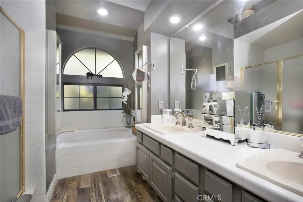 Welcome to luxury living in the prestigious guard-gated community of Canyon Crest Estates. Tucked away on a quiet private cul-de-sac and surrounded by larger executive homes, this beautifully upgraded residence offers an exceptional floorplan featuring three ensuite bedrooms, including two on the main levela rare and highly desirable layout. Step inside to soaring ceilings, elegant finishes, custom wall treatments, and a warm, inviting ambiance. The thoughtfully updated kitchen showcases leathered granite style countertops, soft-close cabinetry, custom lighting, a farmhouse sink with garden window, GE Profile built-ins, abundant prep space, and a convenient corner Lazy Susan. The kitchen flows seamlessly into the spacious family room, complete with an elegant fireplace, ceiling fan, and French doors that open to your private outdoor paradise. The main-level primary suite features mirrored wardrobes, a ceiling fan, and direct access to the backyard. Its ensuite bathroom offers a dual-sink vanity, walk-in shower, and large soaking tubperfect for unwinding at the end of the day. An additional downstairs ensuite bedroom provides comfort and flexibility for guests or multigenerational living. Upstairs, a third ensuite bedroom with a walk-in shower offers privacy and versatility. Outside, discover your own tropical oasisa serene sanctuary with lush landscaping, three cascading waterfall features, koi ponds, and a charming walking bridge. Ideal for relaxing, entertaining, or simply enjoying the peaceful surroundings. Additional highlights include newer roof with upgraded radiant-b