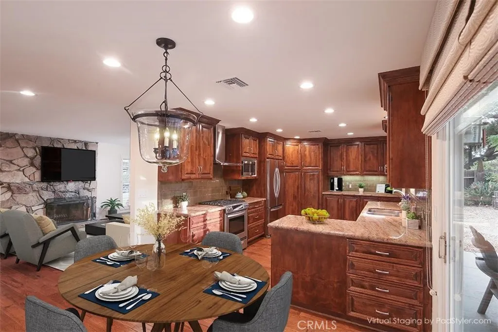 Welcome to this warm and inviting retreat situated on a peaceful cul-de-sac in north Monrovia, well above Foothill Boulevardwhere timeless charm meets modern comfort. First time on the market in over 45 years, this home has been lovingly cared for by its owners, showcasing true pride of ownership and great curb appeal. This beautifully maintained 4-bedroom, 2-bathroom home features high-quality engineered wood flooring throughout the entry, living room, kitchen, and dining area, complemented by plush frieze carpeting in all four bedrooms. Thoughtful upgrades include full copper plumbing, plantation shutters on all bedroom and living room windows, and custom shades on the kitchen windows and dining areas sliding door. Each of the four bedrooms is enhanced with new ceiling fan light fixtures with remote control, adding comfort and convenience throughout. The kitchen is a standout, equipped with high-end stainless steel KitchenAid appliancesincluding the oven/range, range hood, dishwasher, and refrigeratorand enhanced by custom cabinetry with pull-out drawers, soft-close features, and concealed space for the conveniently located laundry machines behind matching cabinet doors. The entryway, dining area, and kitchen feature recessed lighting, creating a bright, contemporary atmosphere. A dual-zone HVAC system provides personalized comfort on both levels, while the freshly painted interior and newer exterior paint add to the homes move-in-ready appeal. The well-designed layout offers a ground-level primary suite, a spacious galley kitchen that flows seamlessly into the dining are