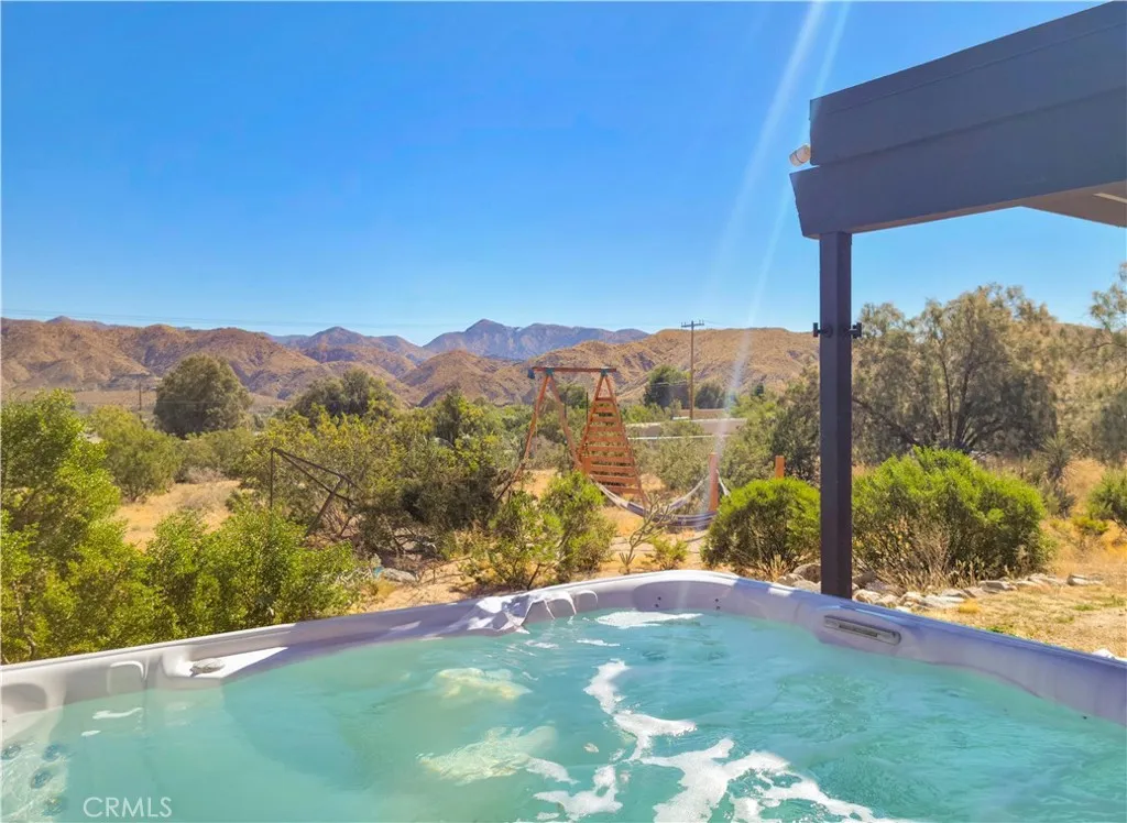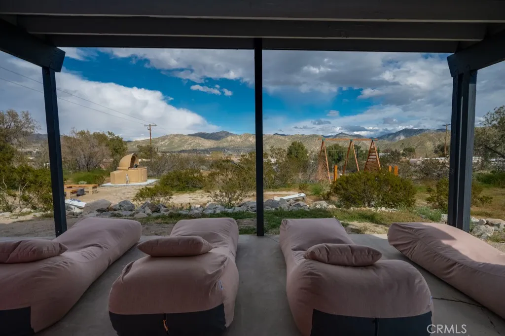 Pink Galaxy holds strong chromatic themes, original art, and is a star grazers dream in a special paradise. Halfway between Joshua Tree and Palm Springs exists a special medium between stars, city, alpine, and an always oasis climate. Magically cooler in summer and warmer in winter than its neighboring areas, large fruit trees grow next to stark Joshua Trees in this special zone of the desert due to its high watertable, subterranean rivers, natural springs, creeks and marshes. This home is a 1961 homestead with a low modern roof line and beamed ceilings, the floor is polished concrete is stained aqua marine in juxtaposition of its pink exterior like an image from Hubble. The Kitchen is socially open to both the living room and dining room separately to left and right. It features under counter appliances and open shelving to preserve head space. The stove and fridge are retro Classic brand in power coated aqua further nodding to the home's mid-century vibe. Island and counters are black marble quartz with waterfall ends, providing extra storage and under counter drawer microwave and dishwasher. There are 2 Large Bedrooms with a third flexible bonus room that is being used as a bedroom, but can be used as an office, den, or yoga room. The living room is centered on an original rock wall and wood stove with entertainment center, perpendicular is a contemporary record player station with high-fi speakers above hangs sveral vintage guitars formed as one-of-a-kind artworks. The dining room has an integrated lighting design consisting of backlit mounted rice hats and a microcrete