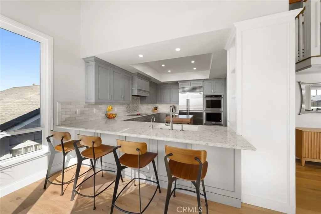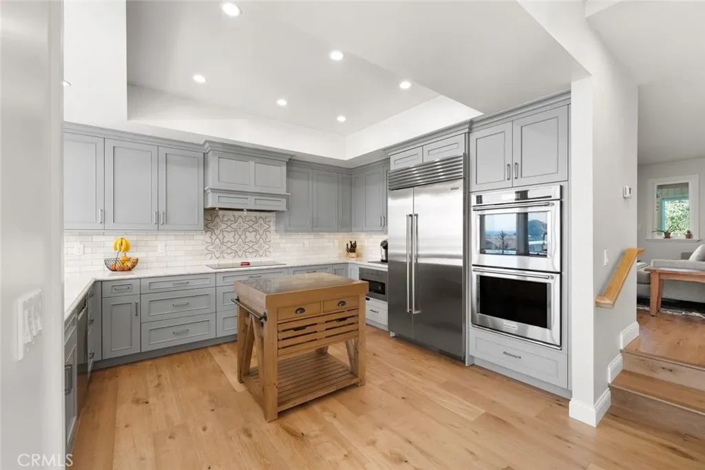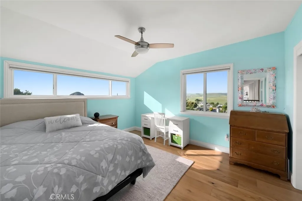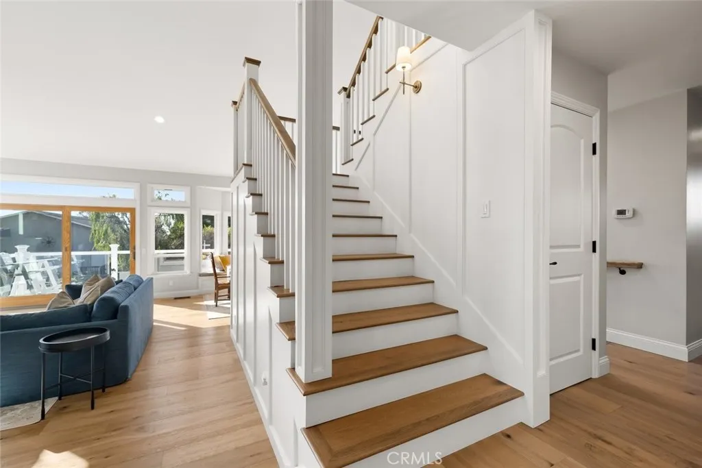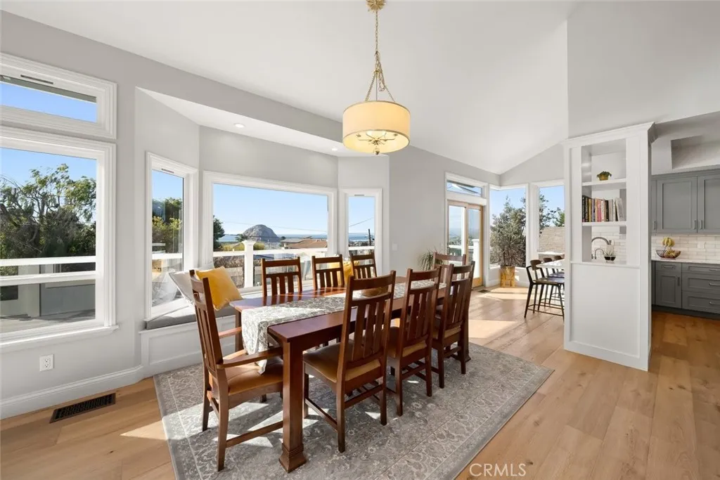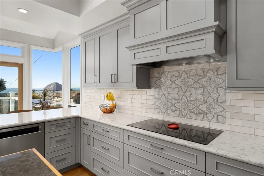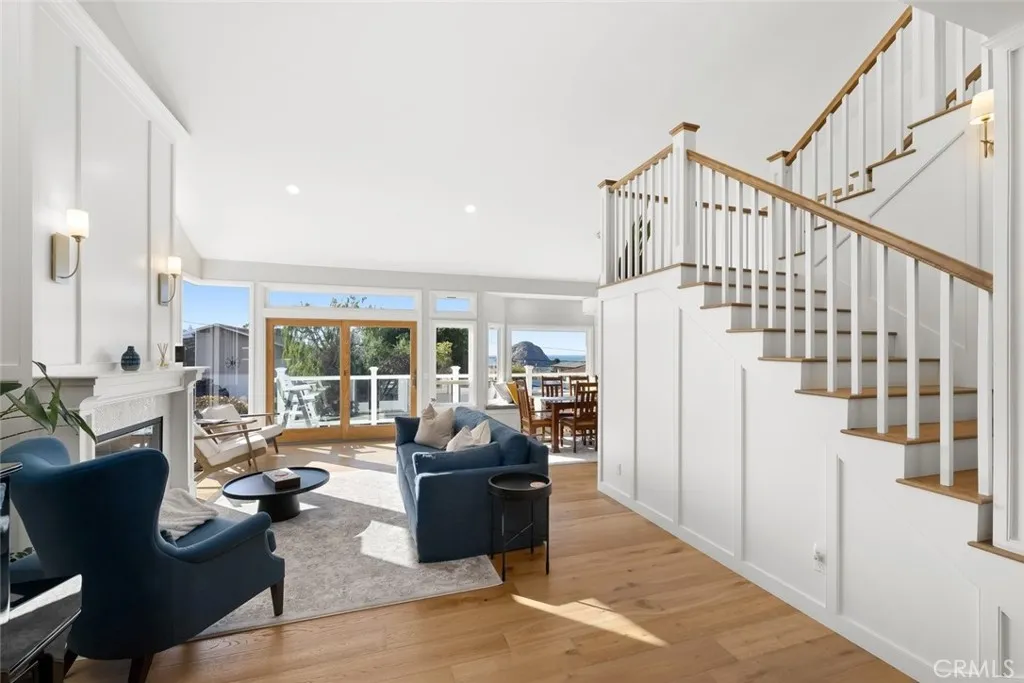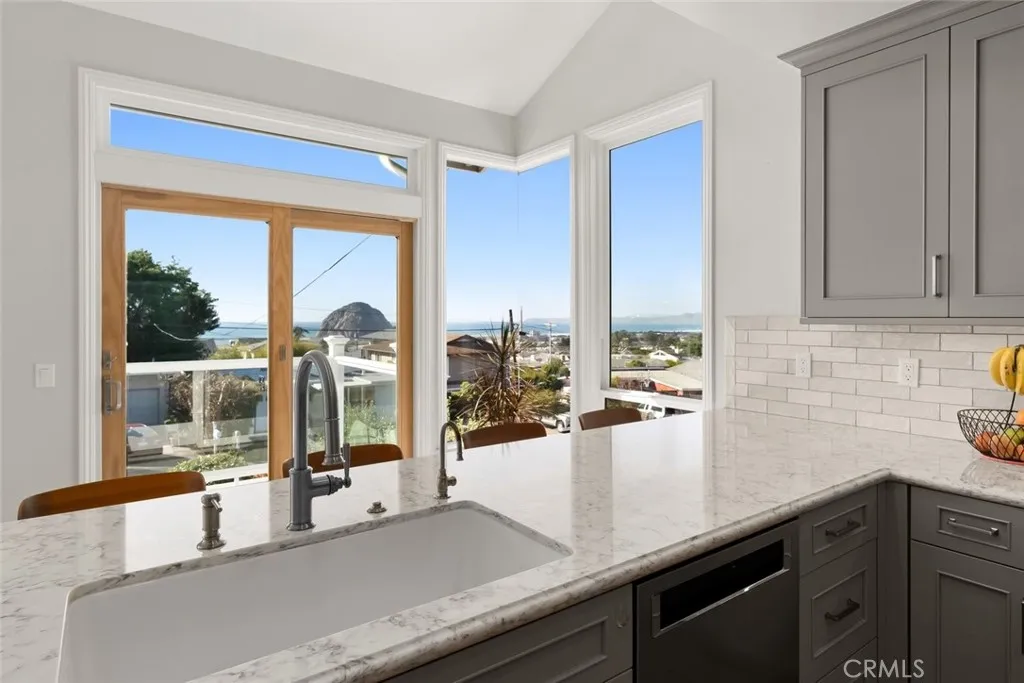 Located in the prestigious Morro Heights neighborhood of Morro Bay, this fully renovated coastal retreat captures iconic, unobstructed views of Morro Rock and the Pacific Ocean. Just minutes from scenic hiking trails, the Morro Bay Golf Course, and the Embarcadero, this move-in-ready home offers an exceptional blend of luxury and location. Thoughtfully reimagined, the 4-bedroom, 2.5-bath residence features new windows, sliders, doors, and updated mechanical systems throughout. The flexible floor plan includes a main-level primary suite and three spacious upstairs bedrooms. A finished three-car garage provides abundant storage, custom cabinetry, and an EV charger. Ocean views elevate everyday living in the chefs kitchen, appointed with custom cabinetry, Viatera countertops, a KitchenAid five-burner induction cooktop, a Sub-Zero refrigerator, and premium appliances. Andersen sliding French wood doors open from the kitchen and dining area to a view deck, creating seamless indoor-outdoor flow. The open-concept living and dining area centers around a custom-tiled fireplace, while expansive glass windows invite natural light and frame the coastal backdrop. A cozy family room with a built-in desk provides an ideal work-from-home space. A sunroom or bonus area adds versatility with direct access to the landscaped backyard. The main-level primary suite features vaulted ceilings, exposed beams, and a sitting area. The spa-inspired bath offers dual Cambria quartz counters, a soaking tub, custom tile shower, and radiant heated floors. Upstairs, three generously sized bedrooms offer lov