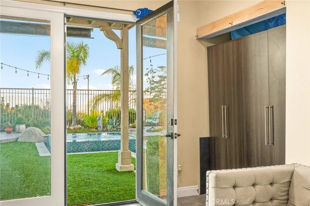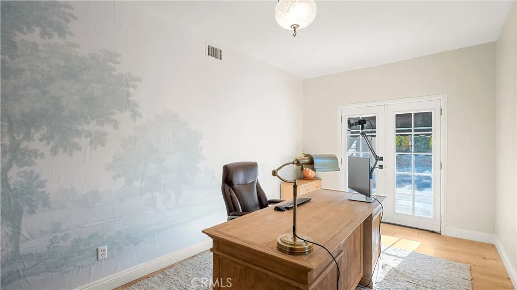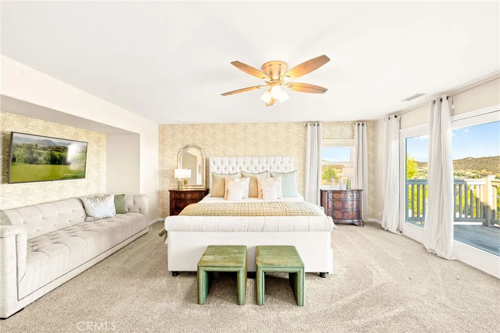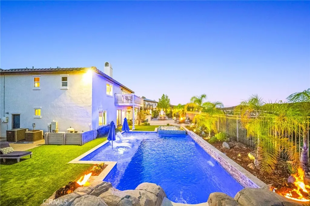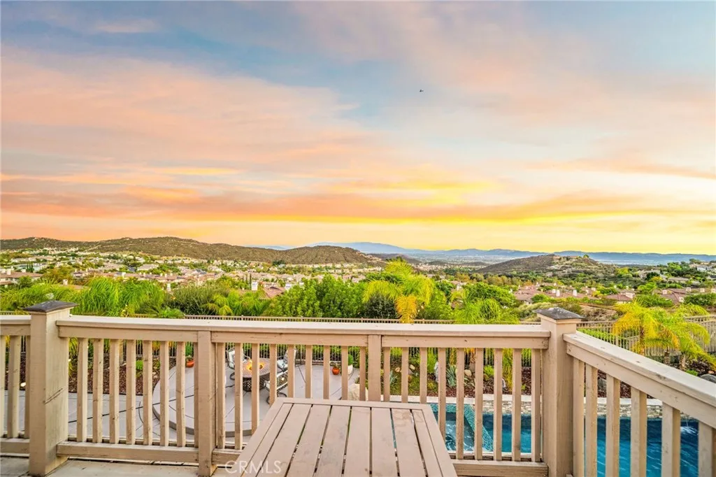 Welcome to this stunning 4,120 sq. ft. bespoke luxury home in the prestigious guard-gated community of Greer Ranch. Thoughtfully designed for both elegance and livability, this residence offers 5 bedrooms, 4.5 baths, plus a dedicated office, all showcasing breathtaking views of the Murrieta and Temecula Valley at the top of Greer Ranch. The open and inviting floor plan features a main-floor mother-in-law suite with its own living area, bedroom, and private bath perfect for guests or multi-generational living. The gourmet kitchen shines with granite countertops, stainless steel appliances, and refinished wood flooring laid in an elegant herringbone pattern, opening seamlessly to the family room and breakfast nook for effortless entertaining. Throughout the home, all flooring has been beautifully redone, enhancing the cohesive, modern feel and complementing every space with refined style. Upstairs, the primary suite serves as a tranquil retreat with sweeping views, a spa-inspired bathroom, and an oversized walk-in closet. Three additional bedrooms, including a private guest suite, offer comfort and flexibility for family and friends. Step outside to your resort-style backyard oasis, where luxury and leisure meet. Enjoy a newer custom osmosis pool and spa with a PebbleTec finish and soft pool lighting, creating the perfect evening ambiance. The outdoor space features a balanced mix of concrete and lush artificial turf, ideal for both entertaining and everyday relaxation while taking in the spectacular valley views. Additional highlights include solar power for efficiency and