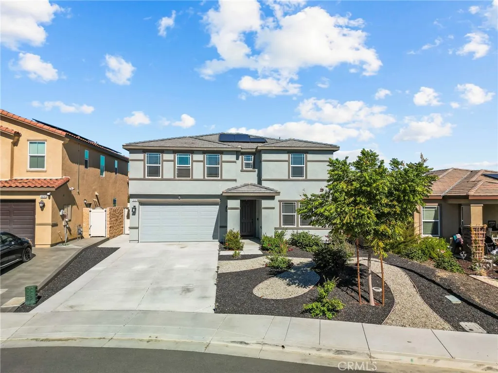 PRICED TO SELL Nestled in a serene cul-de-sac, this stunning 2023-built home offers the perfect blend of luxury and comfort. Boasting 5 spacious bedrooms and 3 full baths within its expansive 2,541 sq ft, this residence is designed for modern living. The heart of the home is the chef's kitchen, complete with elegant quartz countertops and ample space for culinary creations. A convenient downstairs bedroom with a full bath offers flexibility for guests or multi-generational living. Upstairs, a versatile loft provides additional living space, perfect for a home office or entertainment area. Enjoy energy savings with paid solar panels, while relishing the low-maintenance front and backyard, ideal for busy lifestyles. Located in a desirable school district, this home is also just moments away from shopping, offering both convenience and tranquility. With a lower tax rate and no HOA fees, this property presents an exceptional opportunity to own a dream home in a prime location. Don't miss your chance to experience the epitome of Southern California living! 3D Tour along with floor plan is available under 360 tab