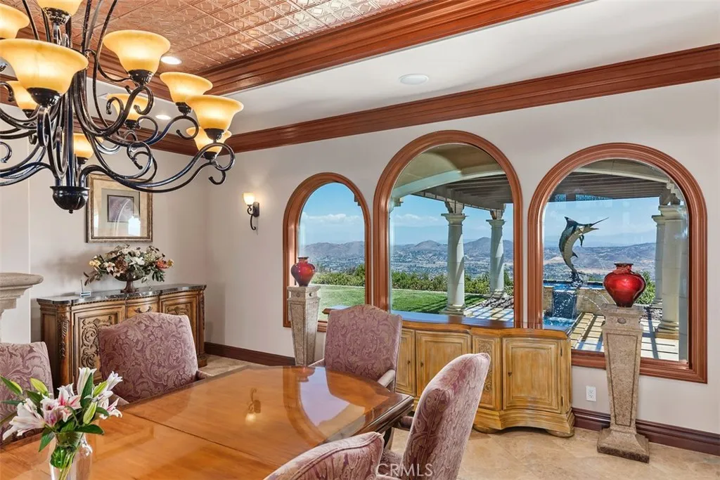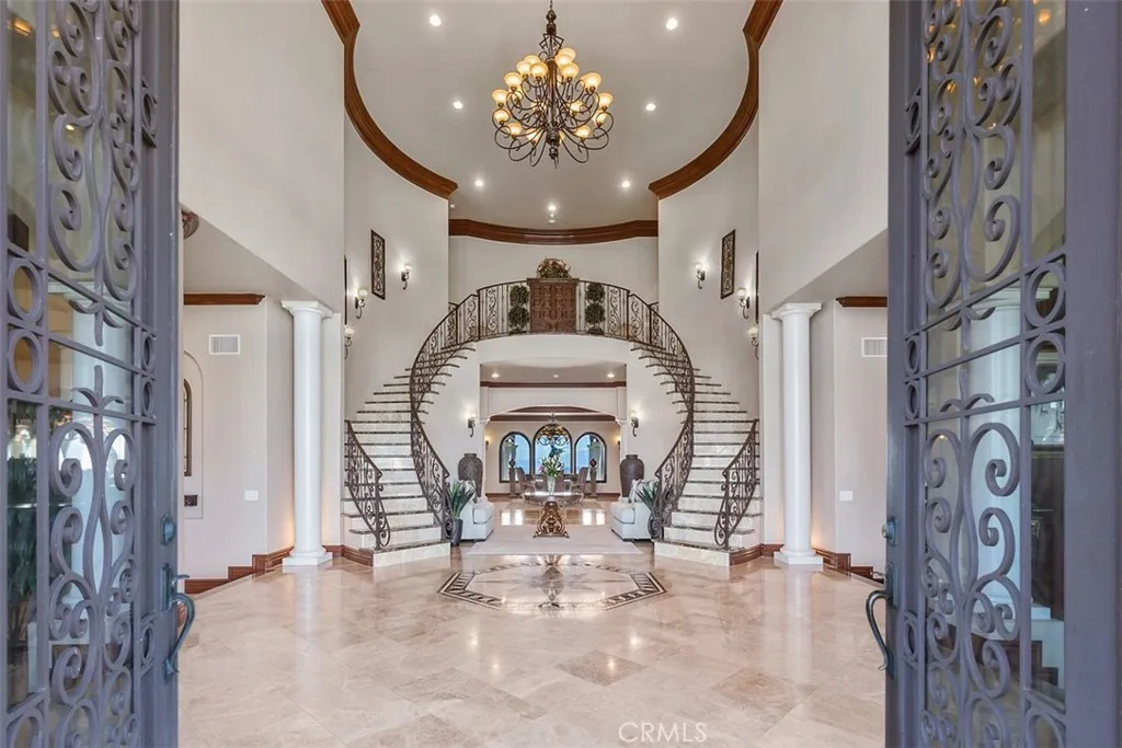 Welcome to Villa Dolce Vista. Commandingly positioned atop 20.39 ACRES at the north point of the EQUESTRIAN COMMUNITY of La Cresta, this Italian inspired masterpiece offers luxury amenities appreciated by the most discerning buyers. Impressive private GATED COMPOUND offers uninterrupted panoramic VIEWS of mountains, city lights, and the Temecula Valley. Encompassing nearly 14,000 SF, the resplendent home includes 5 EN-SUITE BEDROOMS, 8 BATHROOMS, a grand foyer with DUAL STAIRCASES and 24 ceiling, elegant wood paneled STUDY, FORMAL DINING ROOM with fireplace and expansive city light view. Incredible CHEFS KITCHEN includes a 20 granite topped island, COPPER CEILING and LEDGER STONE WALLS. Extraordinary PRIMARY SUITE offers a FIREPLACE, BALCONY with staggering city light views, OPPULANT BATH with dual water closets, vanity areas, marble spa showers, and Jacuzzi tub. Massive GAME ROOM with full wet bar and access to the outdoor travertine deck with FOUNTAINS, INFINITY EDGE JEWEL SCAPE POOL AND SPA and two full outdoor BBQ kitchens. EIGHT CAR GARAGE with built in cabinetry. This SMART HOME is equipped with $155,000 in electronics that provides you with touch screen devices throughout the home. For extended family, a 1,777 SF SINGLE STORY 2 BEDROOM, 2 BATH BUNGALOW with two- 2 car attached garages. Energy efficient with a 47 KW 136 PANEL SOLAR SYSTEM powering both the main home and casita. 53x40 RV GARAGE totaling 2,120 SF for storage of two 45 motorhomes plus all the toys. INCOME PRODUCING HAAS AVOCADO GROVE with automatic fertilization system and WELL watered with two 5000 gall