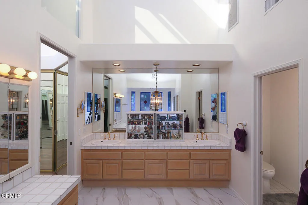 Welcome to this one-of-a-kind custom estate nestled within the prestigious, 24-hour gated and guarded Bear Creek Community -- a premier enclave built around a championship PGA-tryout golf course.Situated on an expansive 1.5-lot parcel, this sprawling single-level ranch-style home blends privacy, luxury, and effortless entertaining. A circular driveway leads to the stately entry and an oversized private patio featuring a 'swim-in-place' pool and jacuzzi -- perfect for relaxation or exercise with serene golf course views.Inside, the remodeled chef's kitchen is a culinary dream, boasting high-end appliances, a built-in china cabinet, and a generous walk-in pantry illuminated by natural skylights. The home's design encourages seamless entertaining with three wet bars, a spacious indoor BBQ room, and a massive game room complete with pool table, TV lounge, and a second master suite featuring its own sauna.The main primary suite is a true retreat, offering dual walk-in closets, a large dressing area, a sunken soaking tub, and private patio access overlooking the course. Two additional guest bedrooms provide comfort for family and visitors alike.Additional highlights include: Four-car garage with new carpet and built in cabinetry Dedicated golf cart garage Office/safe room with built-in cabinetry Lush, low-maintenance landscaping with premium artificial turfExperience the best of resort-style living, privacy, and sophistication -- all within one of Southern California's most exclusive golf communities.