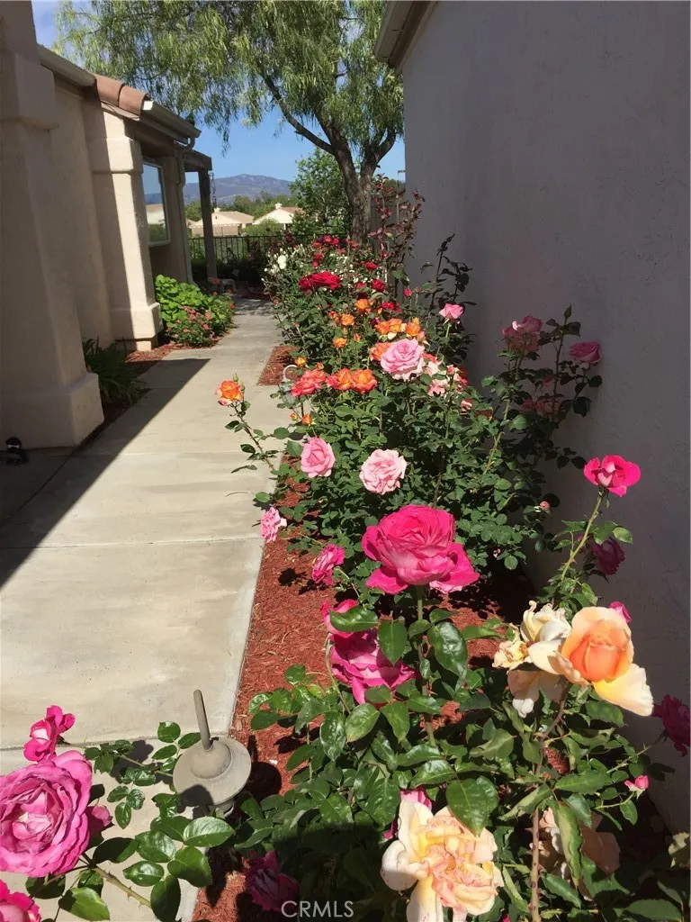 Discover comfortable, low-maintenance living in this charming view home, surrounded by a gorgeous rose garden and enhanced by an Alumawood-covered patio, perfectly located within the highly desirable 55+ gated golf course community of The Colony. This inviting residence features two spacious bedrooms, each offering walk-in closets, along with solid-surface flooring that adds both style and practicality. The bright kitchen is highlighted by a bay window with a cozy dining nook, ideal for enjoying serene garden and mountain views. Step into your private backyard and take in the beautiful vistas, including a clear view of Saddleback Mountain, creating a peaceful backdrop for outdoor relaxation. Life at The Colony is vibrant and fulfilling, offering an impressive list of activities and clubs such as Chorus, Book Club, Garden Club, Wine Club, Strummers, Karaoke, Hand and Footers, and Watercolor Club. Residents also enjoy craft fairs, bingo, singles dinners, bocce ball, golf, swimming, a library, an exercise room, and so much more. The HOA covers front-yard and common-area maintenance, allowing you to simply enjoy the lifestyle. Conveniently close to shopping, healthcare, and easy access to the 15 and 215 freeways, this home seamlessly blends comfort, convenience, and resort-style living in one exceptional package.
