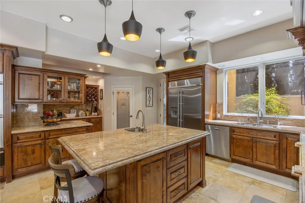 Stunning Custom Estate in Placerita Canyon Swimming Pool, Spa, 3 car garage plus 2 car detached garage (potential ADU or Pool home) and RV Parking with access road!! 5 luxurious bedrooms, 4 full bathrooms and 2 convenient powder bathrooms and bursting with top notch designer finishes! This regal custom estate is nestled in the highly desirable Placerita Canyon community adjacent to Masters College, open space preserve hiking and equestrian trails! The elegant entry is unforgettable with iron adorned glass door, winding staircase, and unforgettable stone tourette which opens first to the stunning home office complete with 2 story ceilings and overlooks the gas fireplace and treelike neighborhood! MAIN FLOOR FULL BEDROOM AND BATHROOM, incredibly thoughtful design and luxurious finishes! At the heart of the home, the chefs kitchen boasts extra thick beveled granite countertops, stainless steel appliancesincluding cooktop, ovens, and dishwasher, Jenn-Air Subzero refrigerator/freezer! Complete with glass accented see through cabinetry, butler's pantry, wet bar, walk in pantry, designer lighting, reverse osmosis filtered water, pot filler at the range and pool views... The kitchen seamlessly opens to the living area, creating a perfect space for large gatherings and cozy, everyday living! Upstairs, you will find tines hardwood flooring across the loft and hallways leading to spacious secondary bedrooms with a Jack-and-Jill bathroom plus a convenient half hall bath and home gym/ 4th upstairs bedroom! The grand primary suite emanates a resort style vibe featuring private balcony ov