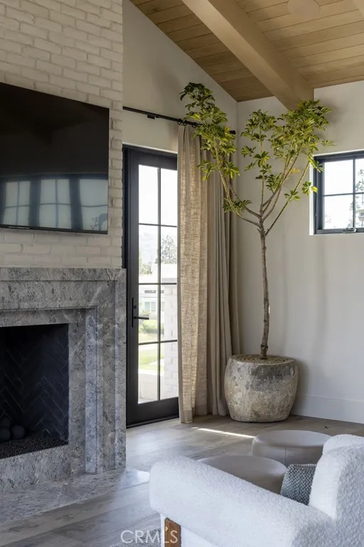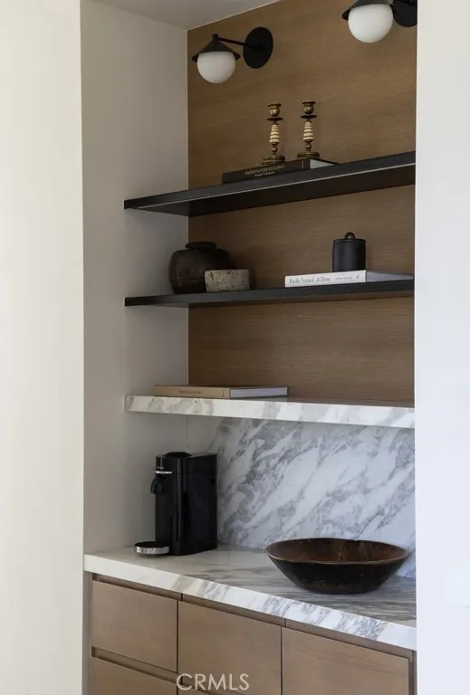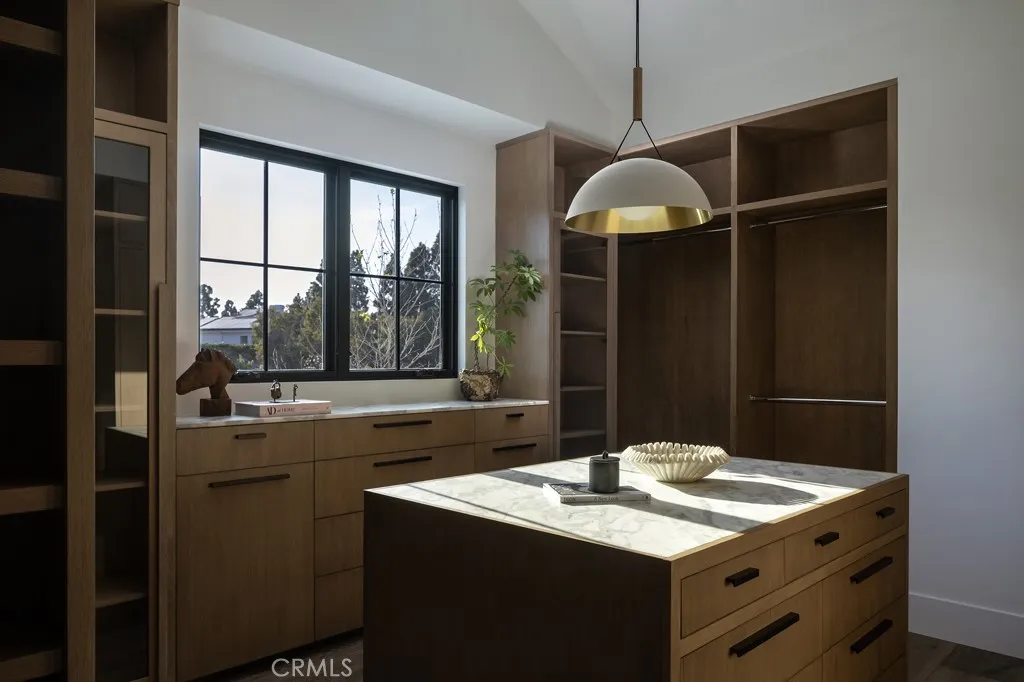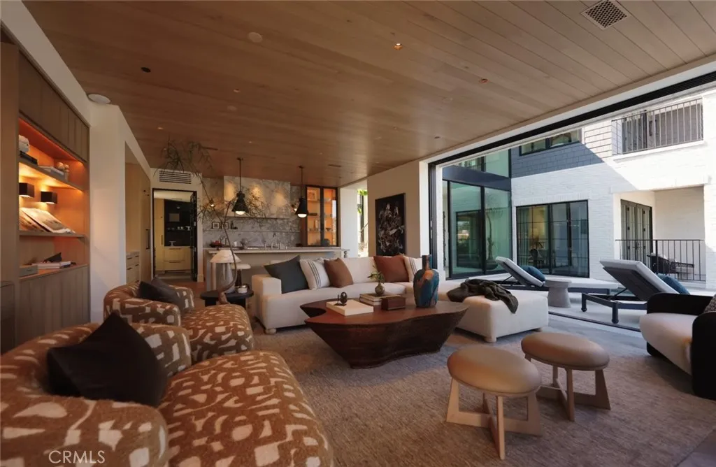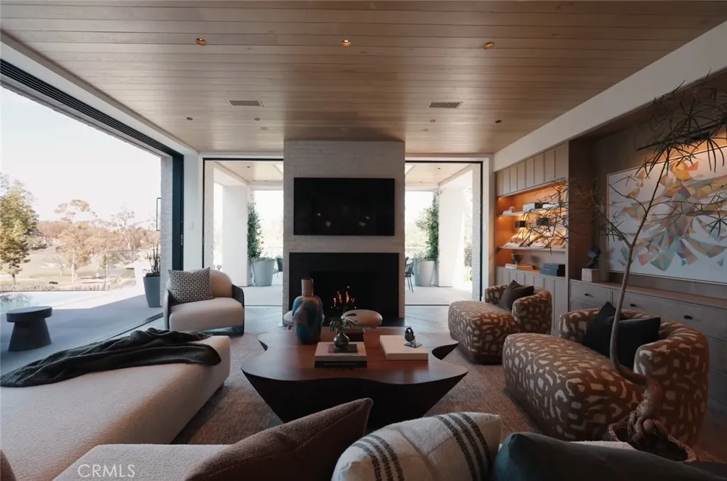 Set within the guard-gated enclave of Big Canyon in Newport Beach, this newly completed residence by JFB Custom Homes, designed by Aust Architects with interiors by Morrison Interiors, reflects a quiet sophistication where natural materials, refined craftsmanship, and thoughtful proportions create a home of enduring serenity. A dramatic double-height entry with approximately 20-foot ceilings introduces the home, where bespoke lighting, rich herringbone wood flooring, and beautifully crafted custom cabinetry establish a quiet sense of luxury. From the foyer, a dramatic sightline extends through the home, across the infinity-edge pool to sweeping vistas of Big Canyon Country Club and the mountains beyond. Interiors are shaped by a palette of warm oak, honed stone, and soft natural textures, creating an atmosphere of effortless harmony throughout. Light filters through carefully framed openings, illuminating spaces that feel generous yet intimately scaled. At the heart of the home, the kitchen serves as both gathering space and sculptural focal point. An elegant stone island anchors the room beneath custom pendant lighting, while warm wood cabinetry and dramatic veined stone create a layered interplay of texture and tone. A fully appointed butlers pantry with its own suite of appliances provides seamless support for both everyday living and entertaining. The great room opens fully through expansive pocketing walls of glass, dissolving the boundary between indoors and out and embracing the essence of Southern California living. Beyond, a dramatic infinity-edge pool and spa over