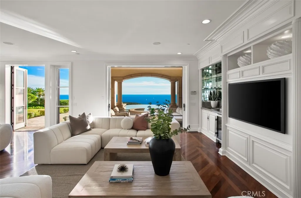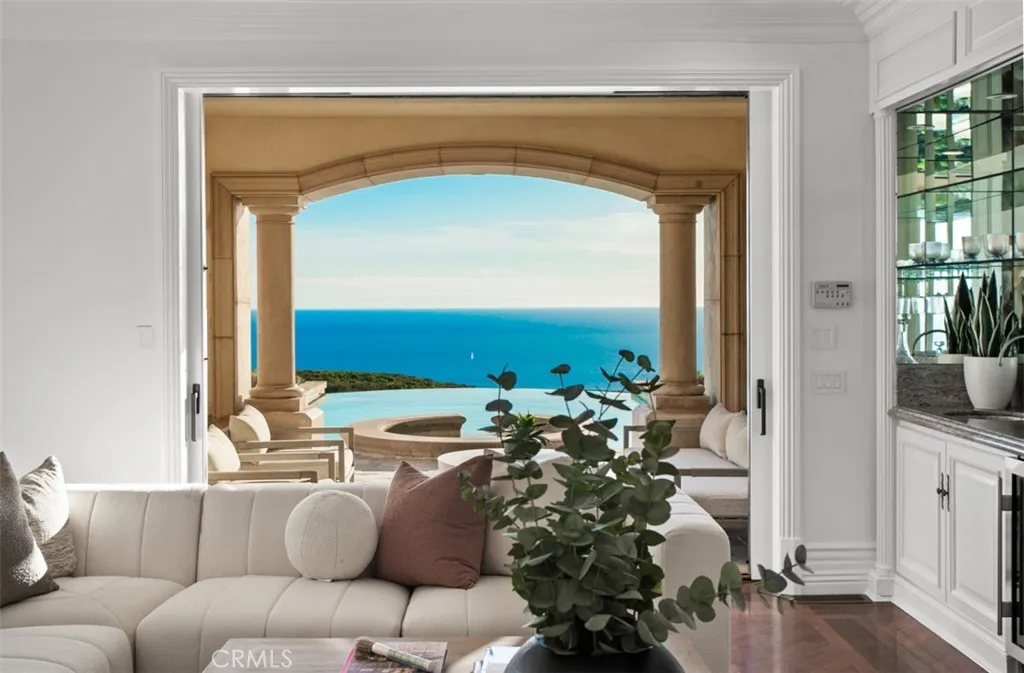 Located within the prestigious guard-gated community of Pelican Crest, this exceptional estate commands uninterrupted views stretching from Catalina Island across the Newport coastline and surrounding greens. Positioned on an expansive 19,000 square-foot corner lot, the property offers a rare sense of elevation and privacy, with manicured, resort-inspired grounds and an infinity-edge pool that visually merges with the Pacific horizon. Spanning approximately 8,900 square feet, the residence features six bedrooms, eight bathrooms, and a six-car subterranean garageideal for collectors or those seeking secure, ample storage. A dramatic domed foyer introduces thoughtfully proportioned interiors, including a richly appointed library, formal living and dining rooms with custom millwork, and a main-level guest suite with its own bath. Designed for both comfortable daily living and elevated entertaining, the family room opens seamlessly to outdoor terraces, welcoming ocean breezes and panoramic views. The kitchen is finished with premium appliances, substantial stone surfaces, an oversized island, and a casual dining areaall oriented toward the coastline. Upstairs, four bedroom suites provide privacy and comfort, three of which capture sweeping ocean views. The primary suite offers a refined retreat with a private balcony, fireplace sitting area, expansive custom closet, and a marble-clad bath with soaking tub and dual vanities. A secondary staircase leads to the lower level, where a climate-controlled wine room and additional guest quarters offer flexibility for extended stays. Res