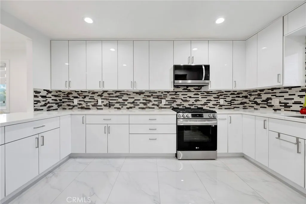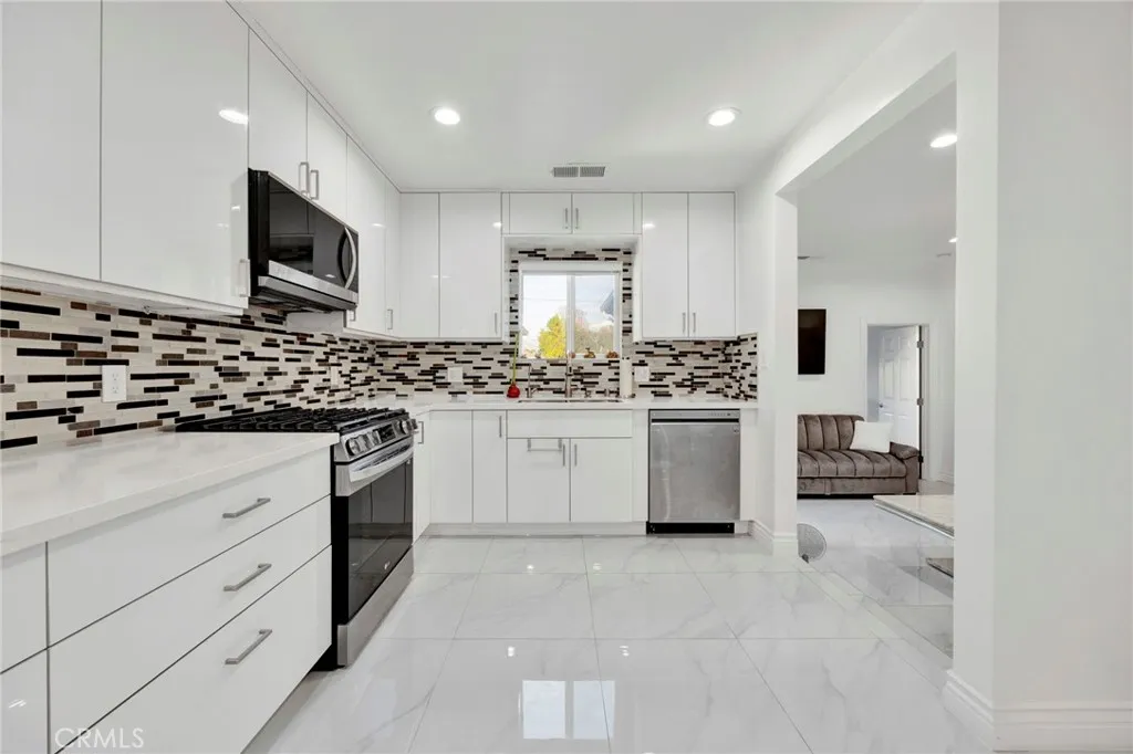 Located in a quiet, highly desirable North Hollywood neighborhood, this breathtaking 4-bedroom, 3-bath pool home offers 1,876 feet of beautifully remodeled living space on a 6,000-square-foot lot, seamlessly blending high-end design with true indooroutdoor living. The home impresses from the start with a gated stamped-concrete driveway, iron front door, upgraded exterior lighting, lush landscaping, and classic stone siding. Inside, a bright open-concept layout showcases all-new designer flooring, recessed lighting, fresh paint, crown and base moldings, window shades, and new dual-pane windows and sliders. The living room features sleek tile floors, built-in ceiling speakers, and flows effortlessly into the dining area and custom chefs kitchen. The kitchen is appointed with glossy white soft-close cabinetry, quartz countertops, mosaic tile backsplash, pantry, updated appliances, abundant counter space, and a peninsula with seating. The spacious family room offers 9+-foot ceilings and a sliding door that opens directly to the backyard. All bedrooms are generously sized with closets. The primary suite is a true private retreat, highlighted by insulated cathedral wood ceilings with an exposed beam, a walk-in closet, and serene backyard views. The spa-inspired ensuite bath features dual vanities, floor-to-ceiling tile, a frameless glass shower, and a smart mirror. The updated guest bath includes marble-look tile floors, a smart mirror, and a convenient stackable washer and dryer. Outdoors, the backyard is designed for year-round enjoyment with a sparkling pool, non-slip sand-fin