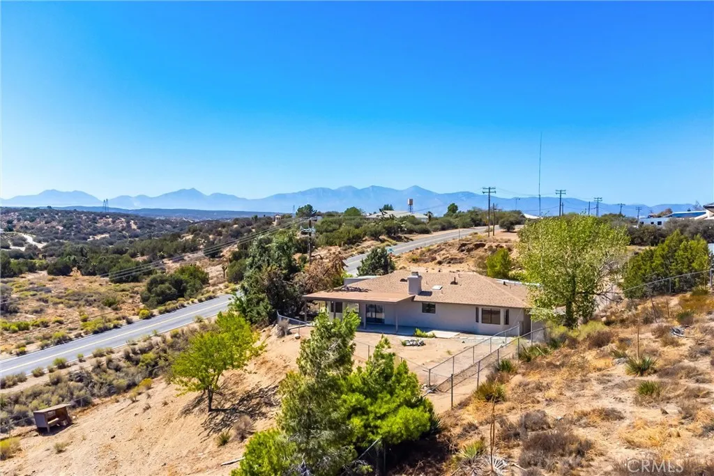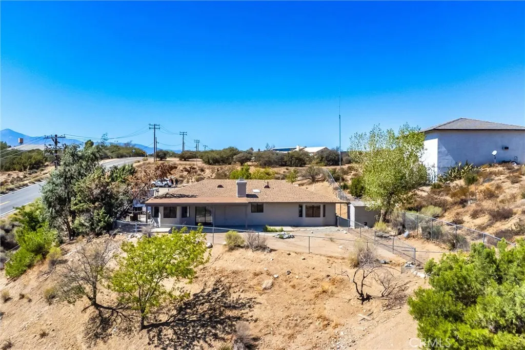 Updated 3-bedroom, 2-bathroom home with attached 2-bedroom, 1-bath ADU on 1.07 acres with hillside and desert views. The main home features laminate wood flooring, recessed lighting, and a remodeled granite kitchen with stainless steel appliances, walk-in pantry, and breakfast nook open to the family room. Family room offers recessed lighting, wood-burning fireplace, and sliding door access to the rear covered patio and fenced yard. Primary suite includes a large walk-in closet, ceiling fan, and remodeled bath with dual granite vanities, tiled walk-in shower, soaking tub, and skylight. Two additional bedrooms feature ceiling fans and share a full bath with granite vanity and shower/tub combo. Attached ADU (converted garage) includes its own separate entrance, kitchen area with sink, spacious living area, two bedrooms with ceiling fans, full bath with tiled walk-in shower, and laundry hookups. The property is fully fenced with a covered front carport, usable lower area with chicken coop, and plenty of open space for future use. Conveniently located with beautiful natural views, this home offers versatile living and move-in-ready updates.