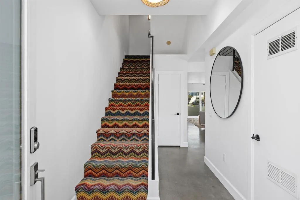 Located near the heart of Downtown Oceanside, this end-unit residence offers a sophisticated blend of modern design and coastal city living. Bathed in natural light and framed by striking star-lit views. This home showcases high-end finishes throughout and delivers a truly turnkey, move-in-ready experience. The kitchen and bathrooms showcase custom cabinetry, complemented by leathered granite countertops, while fully tiled vanity walls in the bathrooms add durability and elevated design. Concrete and tile flooring enhance the contemporary aesthetic while offering effortless maintenance, perfect for beachside living. A first-floor bedroom and bathroom provide ADA accessibility. The second level features a stunning primary suite with a spacious walk-in shower and two generous walk-in closets, an additional bedroom with an en-suite bathroom, and an oversized bonus room with a private balcony, ideal for an office, creative retreat, or fourth bedroom. The private rooftop terrace serves as the Star, offering sweeping 360-degree views of the ocean, mountains, and city lights. One of only two end units offering spacious living, turnkey condition, and expansive views, this residence truly stands apart. Designed for a city-style, on-the-go coastal lifestyle, this home offers convenient access to nearby beaches, bike trails, the train station, acclaimed dining, artisan coffee shops, local wineries and breweries, fitness studios, the Star Theater, cultural venues, the Oceanside Harbor, weekly farmers and sunset markets, shopping, and more. ViewPointe amenities include secure gated unde