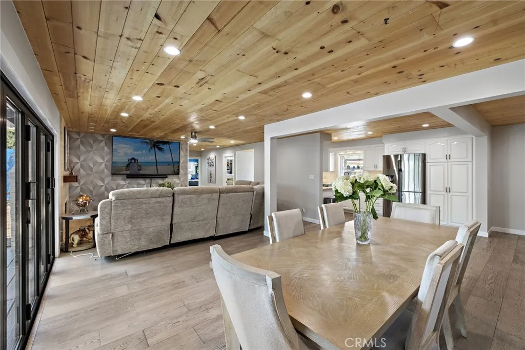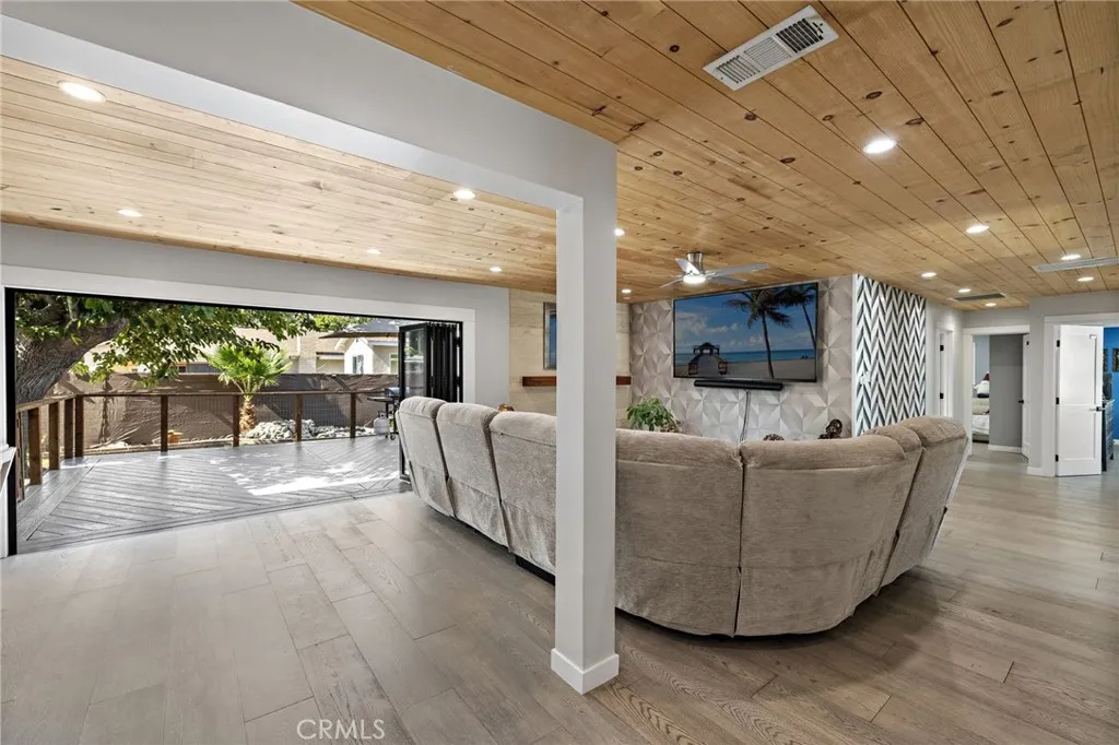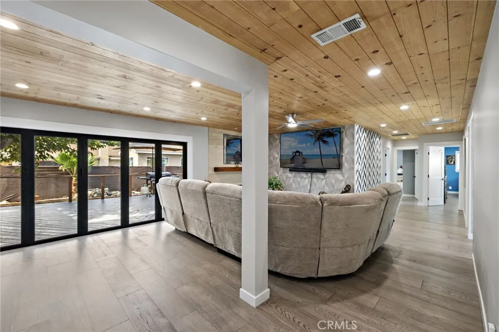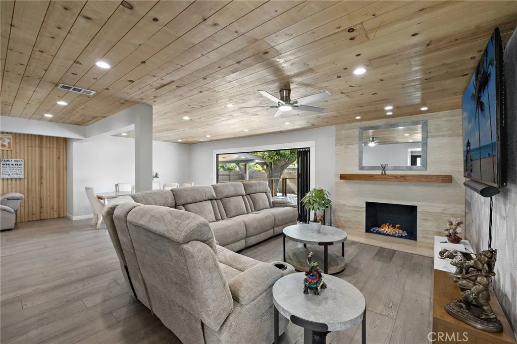 Beautiful single level ranch style home on a quiet cul-de-sac. This 3 bedroom, 2 bathroom home has the ability to easily add a 4th ensuite bedroom/bathroom (call for details). So many updates and luxuries throughout the home including bifolding doors from the great room to the backyard and new wood floors throughout. With the oversized driveway, a two car garage plus a workshop area and an additional 400 sq ft of storage above, the space is versatile for families, additional bedroom and bath, RV parking, etc. The kitchen features stainless steel appliances, 5 burner gas stove, double oven, and granite countertops. The dining room is open to the living room with a beautiful stone fireplace and a raised back deck overlooking the expansive yard. This open concept floor plan extends to the outdoors with the bifolding doors bringing the outside in. The private, large backyard features a covered brick patio for dining, a dog run and large lawn. Freshly painted on the interior and exterior, a new tankless water heater, state of the art bathroom, Milgard windows, whole house fan, fully owned solar panels are among the many features. Located close to Arena Sports Park, Super Range Golf, Chapman University, and within Villa Park High School zoning.