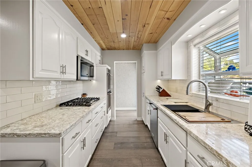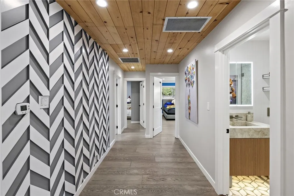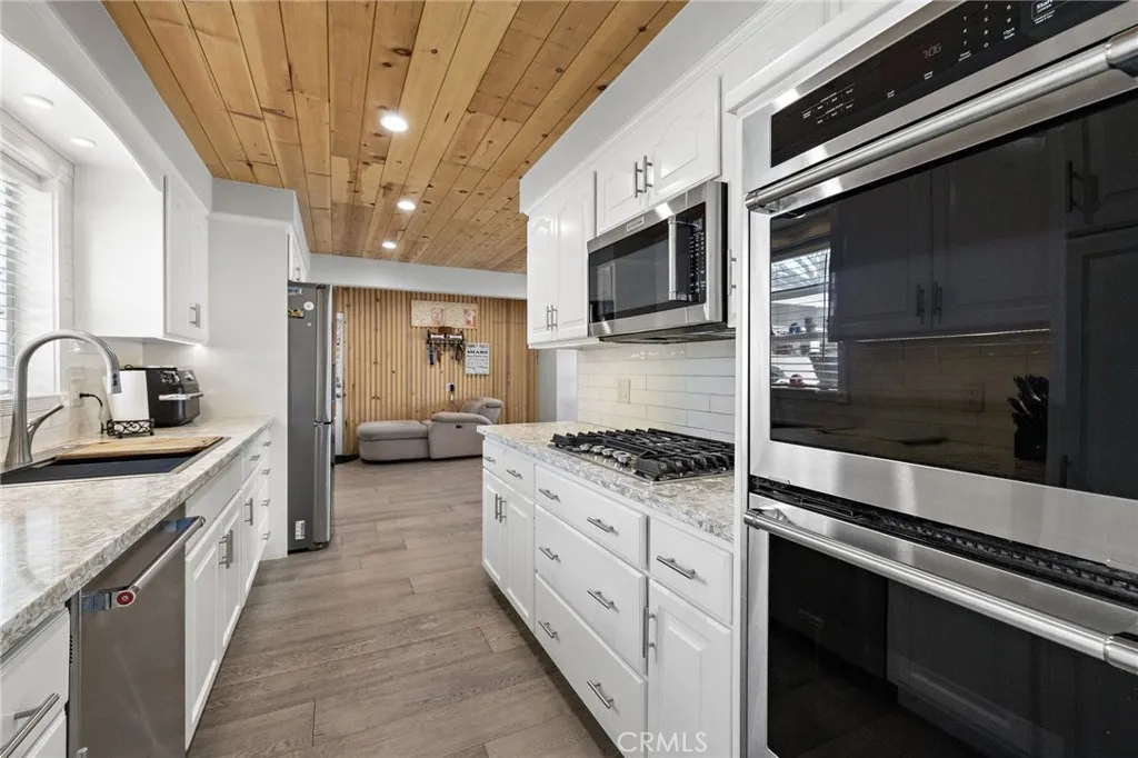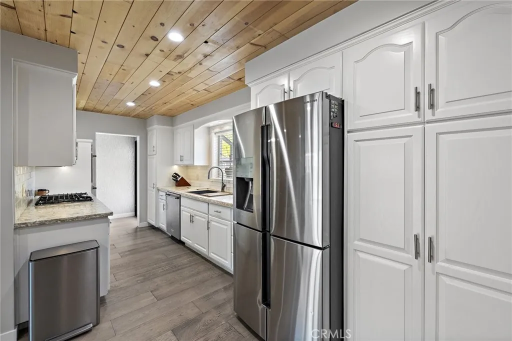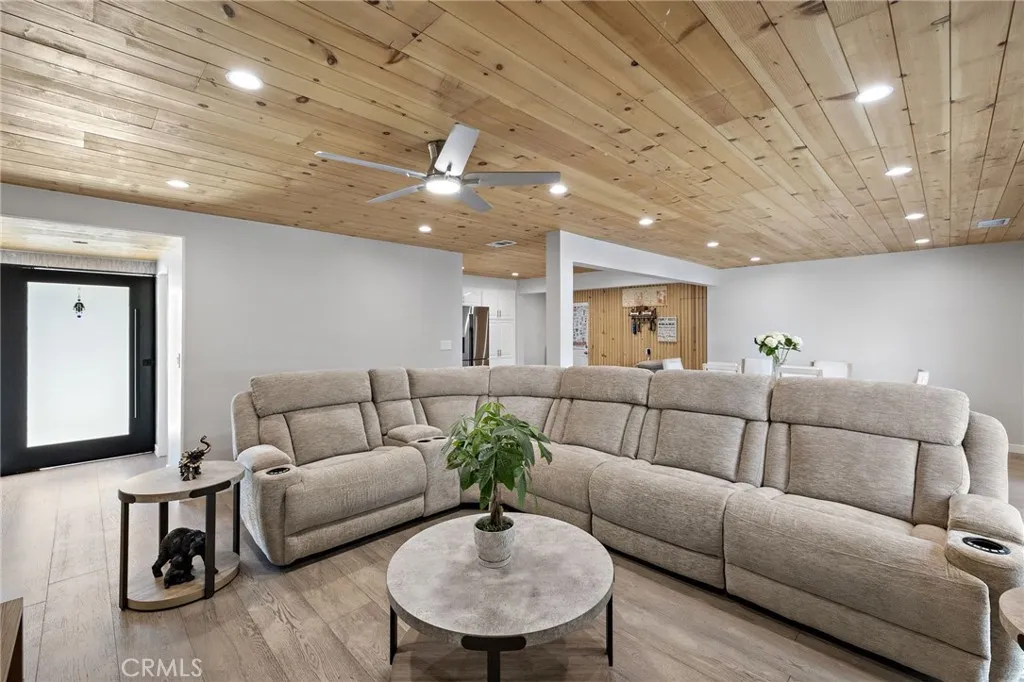 Beautiful single level ranch style home on a quiet cul-de-sac. This 3 bedroom, 2 bathroom home has the ability to easily add a 4th ensuite bedroom/bathroom (call for details). So many updates and luxuries throughout the home including bifolding doors from the great room to the backyard and new wood floors throughout. With the oversized driveway, a two car garage plus a workshop area and an additional 400 sq ft of storage above, the space is versatile for families, additional bedroom and bath, RV parking, etc. The kitchen features stainless steel appliances, 5 burner gas stove, double oven, and granite countertops. The dining room is open to the living room with a beautiful stone fireplace and a raised back deck overlooking the expansive yard. This open concept floor plan extends to the outdoors with the bifolding doors bringing the outside in. The private, large backyard features a covered brick patio for dining, a dog run and large lawn. Freshly painted on the interior and exterior, a new tankless water heater, state of the art bathroom, Milgard windows, whole house fan, fully owned solar panels are among the many features. Located close to Arena Sports Park, Super Range Golf, Chapman University, and within Villa Park High School zoning.