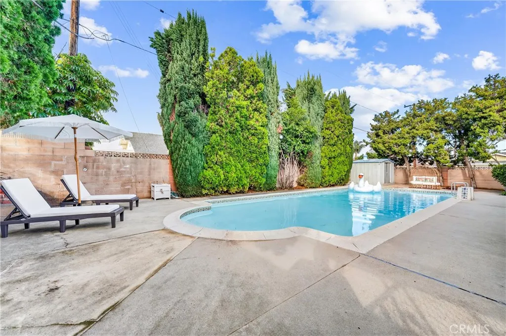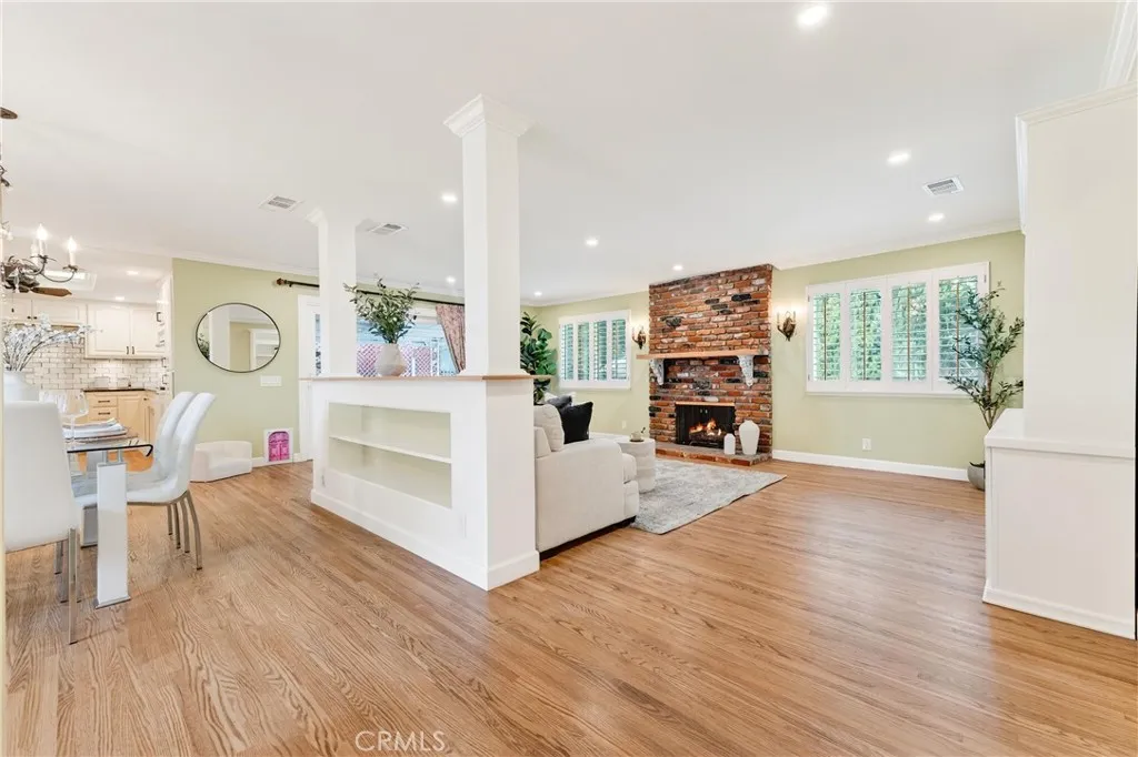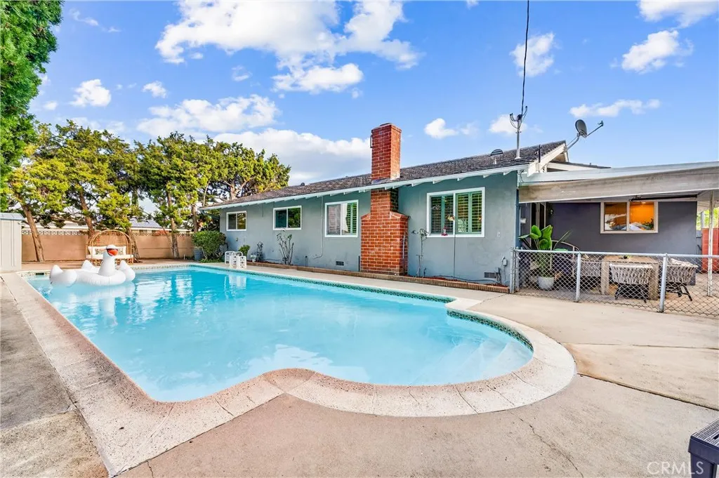 Welcome Home to this beautifully remodeled TURN KEY home in north Orange! This 3-bedroom, 2- full bath home boasts oak hardwood floors throughout, open floorplan living space, and a spacious back yard with sparkling swimming pool just waiting for summertime parties! This homes interior is all on one level with no steps. The updated kitchen features a dual oven and gas cooktop, as well as ample cabinet and pantry storage including pull-out shelving. Bright recessed ceiling lighting and under-cabinet accent lighting show off the antiqued subway tiles and dark quartz countertops. The refrigerator nook is directly plumbed. The breakfast bar separates the kitchen from the adjacent dining room, which has ample space for a large dining table as well as built-in shelving to show off your favorite cookbooks or dishes. The spacious living area features a large custom-built entertainment unit as well as convenient in-floor power outlets. The cozy fireplace has been maintained with its original brick charm, updated with a modern mantle. Plantation-style shutters cover the large, sunny windows that overlook the pool and back yard. A large sliding door opens to the spacious covered patio and then out to the pool deck, with plenty of space for lounging in the sun or splashing in the pool. Perfect for entertaining, or just enjoying a beautiful Southern California afternoon all year long! The primary bedroom features two reach-in closets with cedarwood flooring, and the spa-like primary ensuite has been beautifully updated with modern plumbing fixtures. The walk-in shower features a beautif