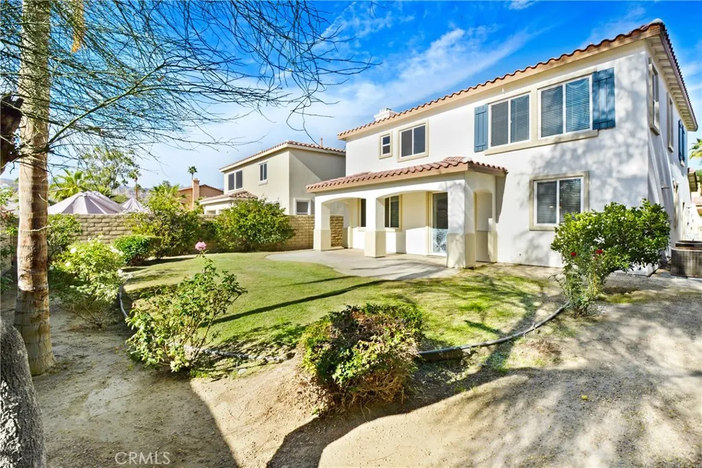 Executive former model home, this lot does not have a home behind it adding to privacy, 3 bdrm 3 baths, open floor plan, large master suite, mountain views, large landscaped backyard. Large kitchen family room combo, gourmet kitchen has granite counters, large island facing the family room, separate laundry room off kitchen. 2 car direct access garage. Gated community with lovely pool area, located close to everything Palm Desert fabulous!