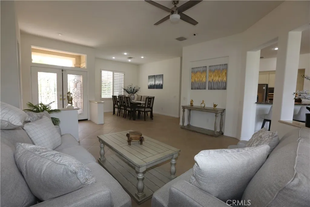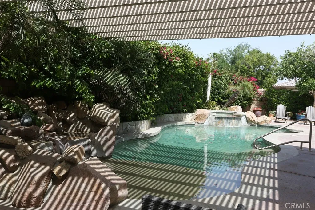 Welcome to 77724 Justin Court, a stunning single-level residence in the gated Whitehawk community of Palm Desert. This 4-bedroom, 2-bath, 2,601 sq ft home sits on a private corner lot and showcases resort-style living inside and out. Step through double doors into a bright open floor plan with soaring ceilings, plantation shutters, and a spacious great room centered around a custom stone gas fireplace. The gourmet kitchen features granite countertops, stainless-steel appliances, double convection ovens, a warming drawer, and extended cabinetry with pull-out shelvingperfect for entertaining. Enjoy year-round relaxation in your tropical backyard oasis with a PebbleTec pool, spa, and rock waterfall, framed by mature palms, fruit trees, and a covered patio with misting system and mounted TV. Upgrades include owned solar panels, newer HVAC and ductwork, epoxy-finished garage with workshop and golf-cart space, and full interior/exterior audio and security systems. Whitehawk offers low HOA dues, gated entry, and a prime central location near shopping, dining, golf, and the El Paseo district. 4 Bedrooms | 2 Bathrooms | Approx. 2,601 sq ft | Built 1998 | Lot ~8,276 sq ft | 3-Car Garage | Low HOA | Gated Community with Pool & Spa