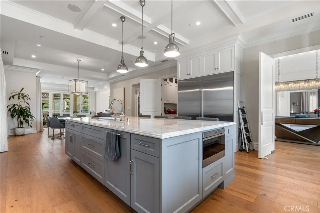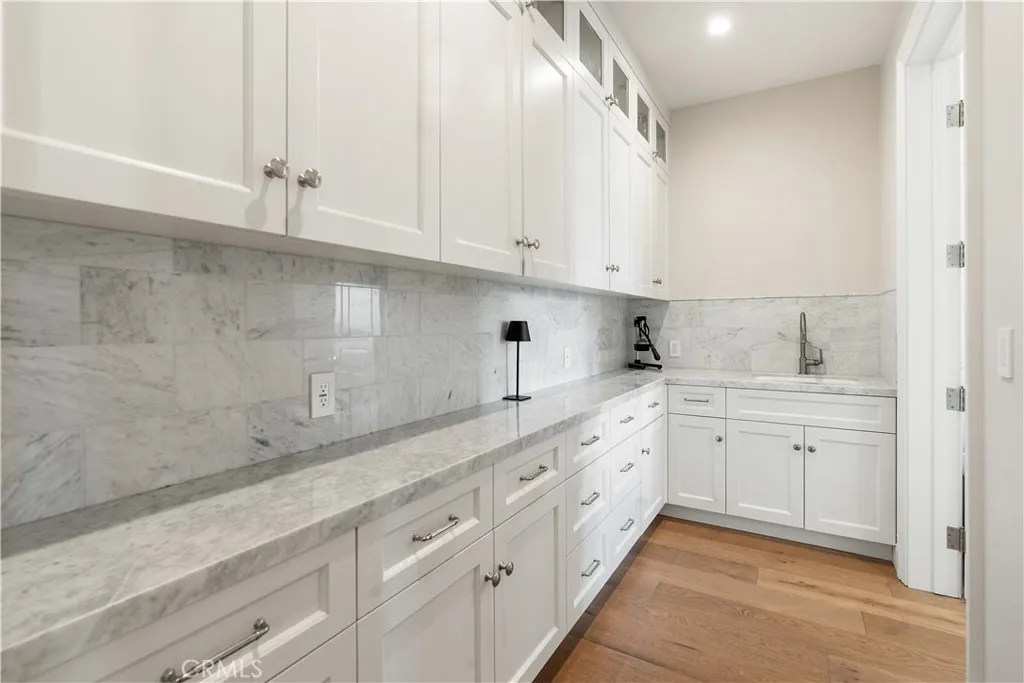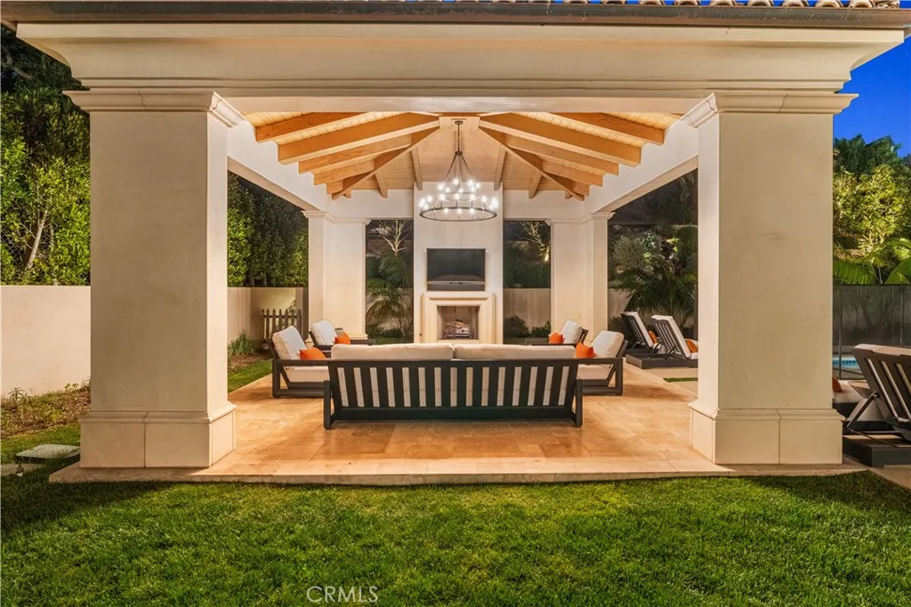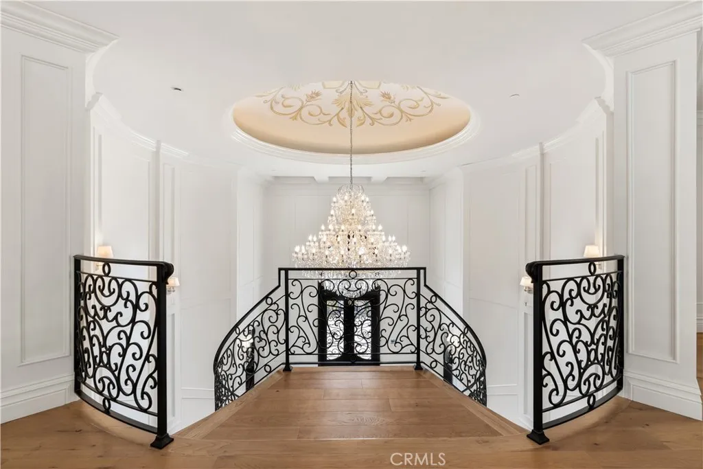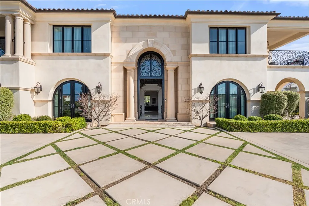 Welcome to 1816 Paseo Del Mar, a stunning custom-built Tuscan-inspired villa with modern elegance, situated on over a half-acre lot on one of the most prestigious streets in Palos Verdes Estatesdirectly across from the cliffs for unparalleled coastal proximity. This newer construction (built 2019) offers panoramic ocean views from the second floor and select upstairs areas, while the main level and backyard focus on resort-style privacy and entertaining. Enter through grand double doors into a dramatic two-story foyer featuring a massive crystal chandelier and dual sweeping staircases with custom wrought iron detailing. The open floor plan flows into a spacious living room with extra-tall ceilings and a grand fireplace, adjacent to a wet bar and temperature-controlled glass wine cellar. The gourmet chef's kitchen is equipped with high-end Wolf and Sub-Zero appliances and a large island topped in imported Carrara marble. The main level includes a guest bedroom with en-suite bath, a private office with attached bath, a total of 4 bathrooms, and an exceptional home theater perfect for entertaining or family movie nights. Upstairs, accessible by three staircases or an elevator, wide hallways overlook the grand living area below. The luxurious primary suite features a fireplace, automated window coverings for abundant natural light, a covered balcony ideal for sunset viewing, a spa-inspired bath with soaking tub, dual-head walk-in shower, custom cabinetry, Carrara marble inlaid floors, and his-and-hers vanities. The expansive walk-in closet includes custom built-ins and dual cen