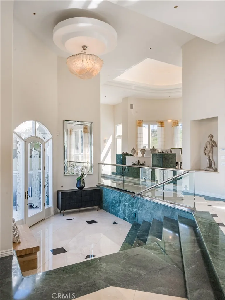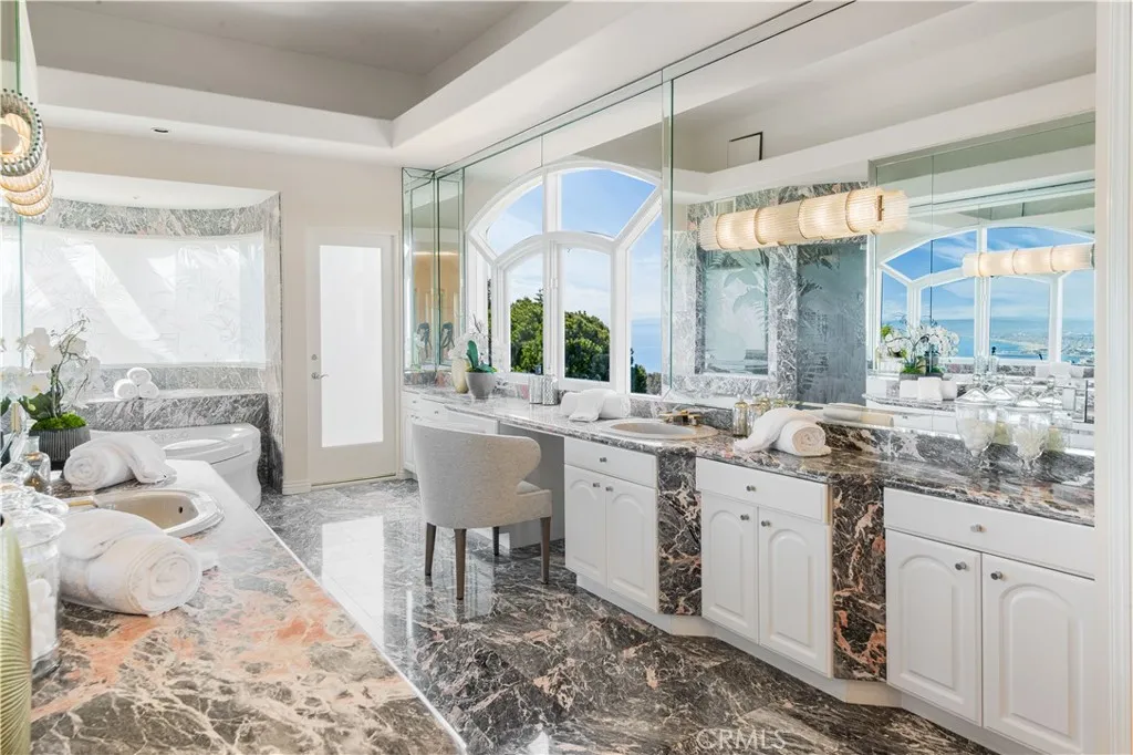 SWEEPING QUEENS NECKLACE VIEW, TENNIS COURT ESTATE- Perched atop a serene cul-de-sac in the esteemed enclave of Palos Verdes Estates, this exceptional gated estate offers a rare fusion of luxury, privacy, and unmatched vistas. From its commanding vantage point, this residence presents the stunning Queen's Necklace view and overlooks the verdant fairways of the Palos Verdes Golf Course. Upon entering through the private gates and ascending the driveway, you're welcomed into a realm of sophistication. Step inside the expansive interior, where vaulted ceilings and walls of large glass windows accentuate the breathtaking view. The immense living room and formal dining area create an ideal setting for formal entertaining, with seamless access to multiple decks and balconies for the mesmerizing coastal panorama. At the heart of the home lies the contemporary kitchen and adjacent family dining room, perfect for family gathering in the sweeping vistas. A circular designed wet bar by the family room provides additional spaces for entertainment. A luxurious primary suite offers a sitting area with a fireplace and breathtaking view. A spacious office/ library provide the comfort for inspiration and contemplation. Retreat to the lower level, where a home media center and game table await, providing endless opportunities for leisure and recreation. Outside, the property boasts a pool, spa, waterfall, and a northsouth facing tennis court. Expansive decks and balconies afford ample space for lounging and appreciating the beauty of the surroundings. An aesthetic balance of comfort and desi