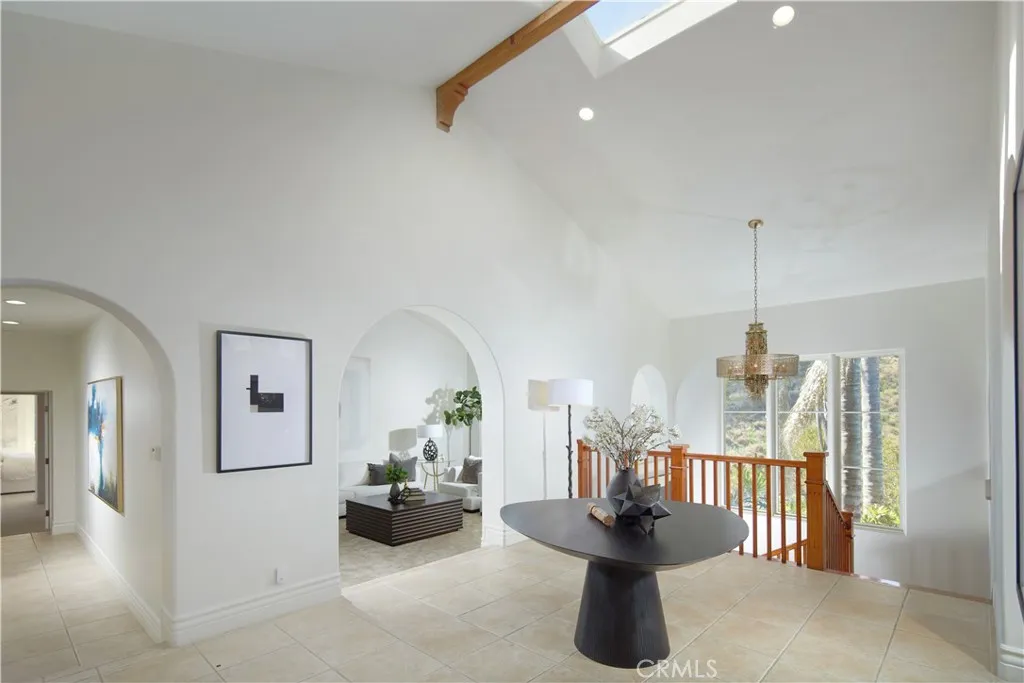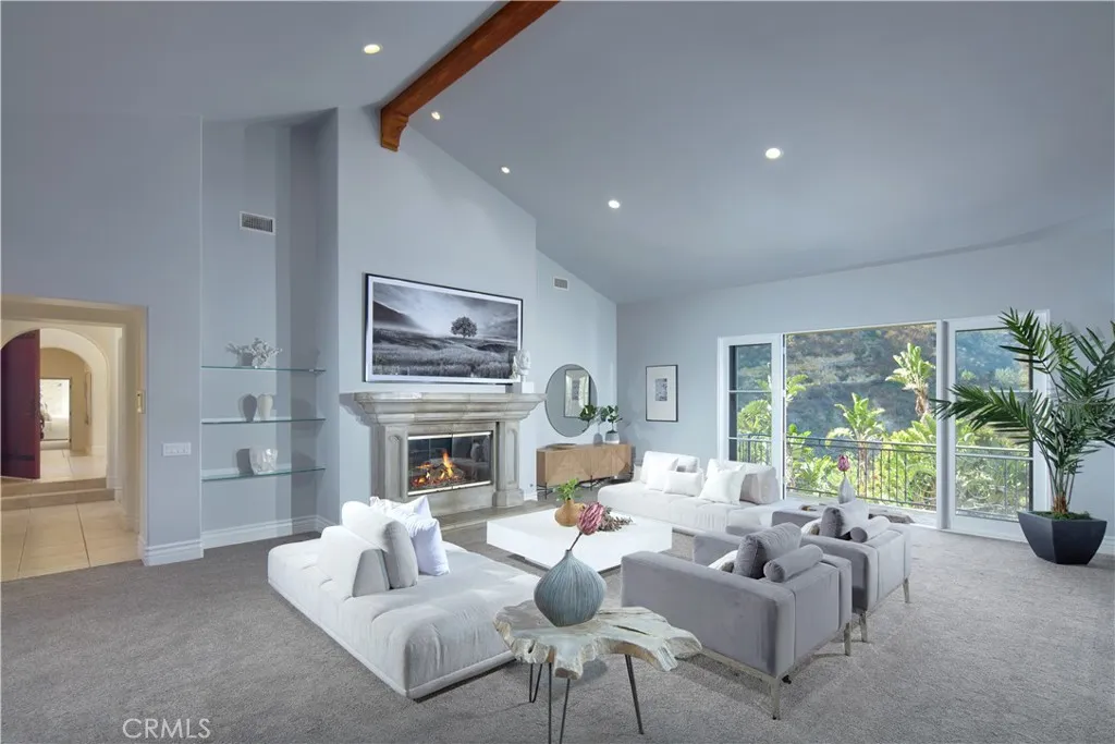 Embraced by rolling hills and mature landscaping on approximately 1.7 acres, this supremely private canyon retreat is one-of-a-kind, offering a spacious 6-bedroom, 4.5-bathroom main residence with an attached 3-car garage, plus a separate, roughly 3,200 square foot detached workshop/garage that can accommodate up to 10 additional cars and it features a bathroom, loft, and professional car lift. Previously used for a classic car collection, RV, and trailer storage, the opportunities for the expansive detached space are endless, but not limited to car enthusiasts. A future guest house, a lofted office space above your home spa/fitness center, a state-of-the-art workshop, and more, are each options for tailoring the space to your lifestyle. As you move from the impressive grounds to the homes interior, you will find a grand foyer where a skylight, soaring ceilings, and an open floor plan invite you into multiple living and dining areas bathed in natural light. The recently remodeled gourmet kitchen features high-end appliances, custom cabinetry, and a large island. Adjacent to the kitchen, a grand fireplace-warmed living area offers awe-inspiring canyon and downtown Los Angeles city lights views, and opens to a covered patio to enjoy alfresco dining with a built-in barbecue. Completing the main level is a large formal dining room, a secondary living room with a fireplace and balcony, a half bath, and the grand primary suite. This primary suite boasts a private balcony with stunning vistas, two spacious walk-in closets, and a two-way glass fireplace to the bathroom with a soaki