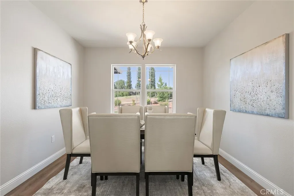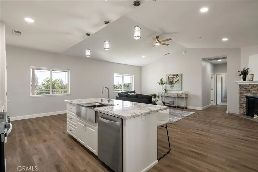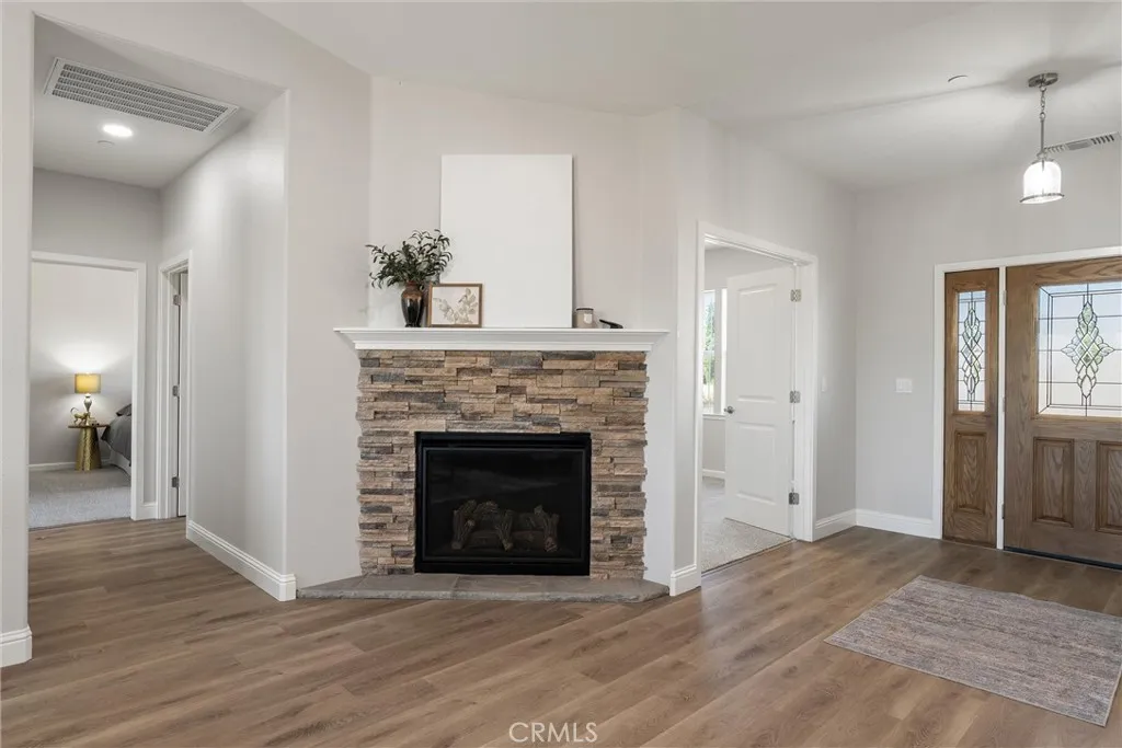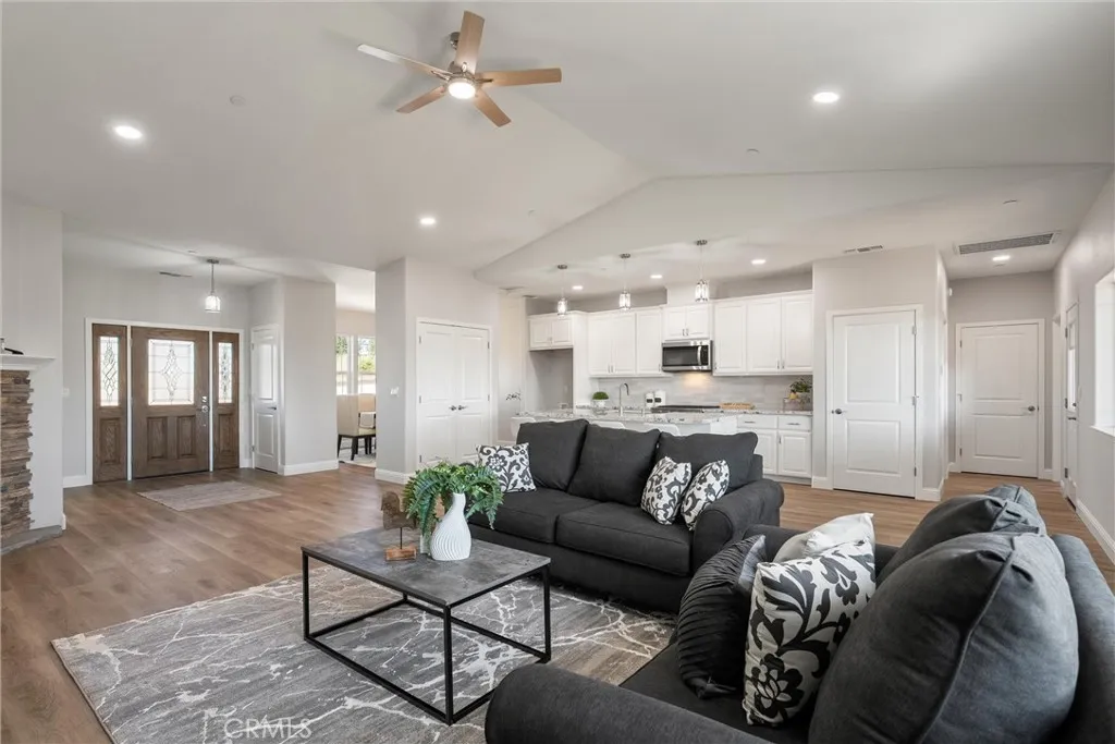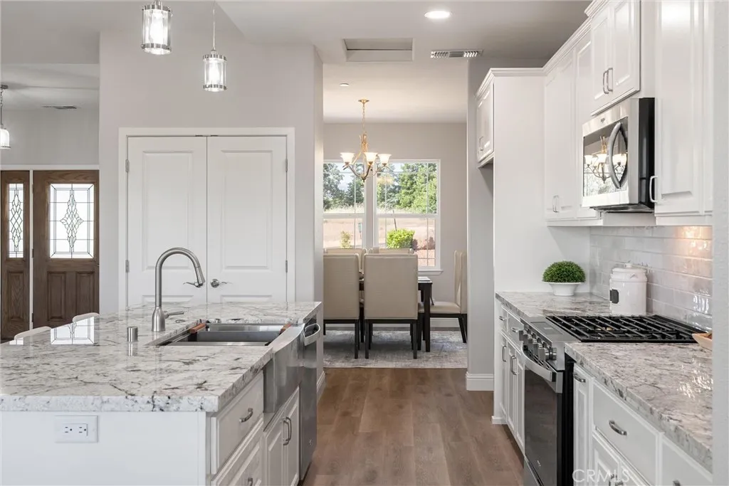 Dont miss this newly constructed home located in a desirable neighborhood not far from Lake Oroville. -This lovely home features 2,197 sf of living space with 3 bedrooms PLUS den/office AND a formal dining room. Other notable features include an open-floor plan with SPLIT BDRM design, luxury vinyl plank flooring with carpeted bedrooms, vaulted ceilings and perfect location for outdoor activities. -Making meals with family and/or friends is a breeze in the spacious open kitchen featuring granite countertops, huge island breakfast bar, multi-function farmhouse sink, 2 PANTRIES, loads of cabinet storage, soft-closing hardware, pull out cabinet drawers, dishwasher, garbage disposal, microwave and gas oven/stove. -The spacious ENSUITE PRIMARY bedroom features a walk-in closet, bathroom with separate tiled shower, a large 3 x 6 soaking tub, double sinks with quartz countertops, a vanity and a private water closet with storage cabinets. Both guest bedrooms, located opposite the primary bedroom, feature walk-in closets, ceiling fans, carpet & custom lighting, dedicated bathrooms with one having an ENSUITE GUEST BATH. -The laundry room, with garage entry, features storage cabinets, gas OR electric dryer hook-ups and folding counter with granite surface. A utility sink is located in the garage next to the laundry room which makes for easy cleanup before entering the home. There is plenty of parking in the huge 3-car (25'x 32') garage with 8' doors and space for a work bench or extra storage. -Outdoor entertainment can be enjoyed on the covered redwood deck patio over-looking the back