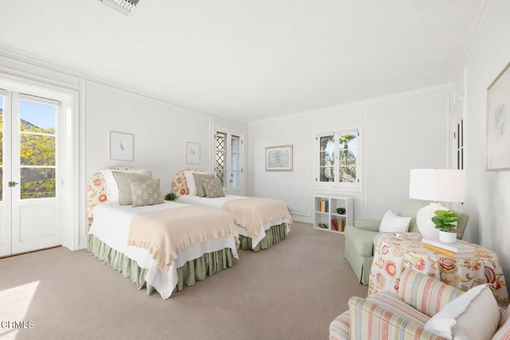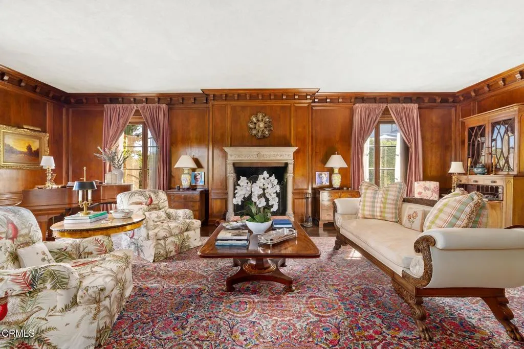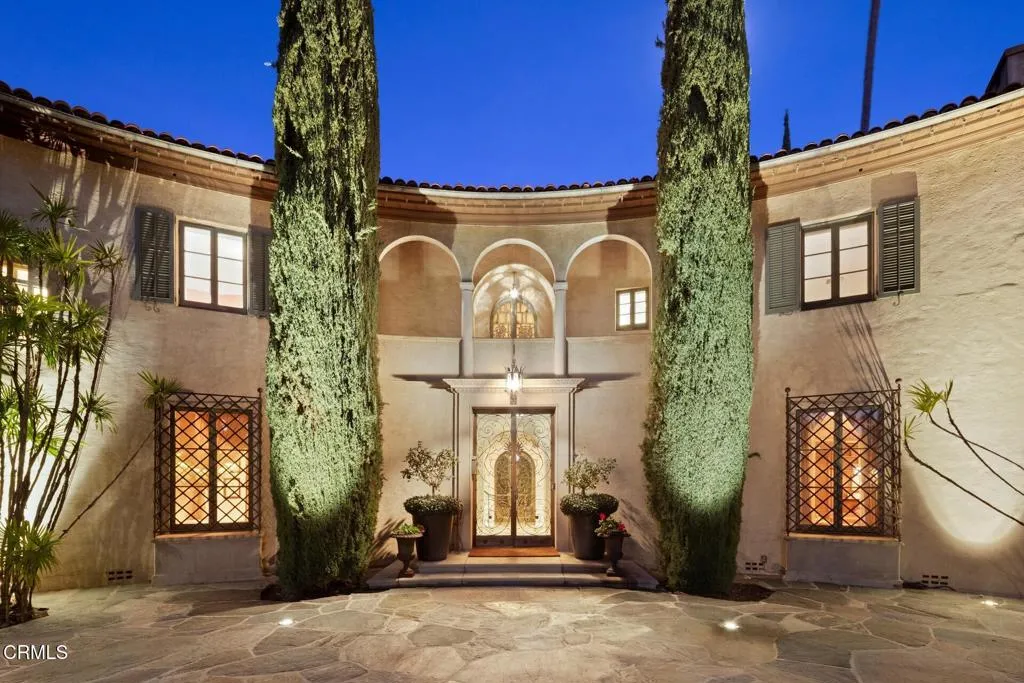 ---Wallace Neff Estate on over 1 Acre in the Langham/Oak Knoll District---Designed in 1928 by noted architect Wallace Neff, and described as an 'Extremely Dignified Spanish Revival,' this exceptional estate is located in Pasadena's prestigious Langham district and set on approximately one acre of landscaped, terraced grounds. Commissioned by Adolphus and Lilly Anheuser Busch, for their granddaughter, Mrs. Sidney Berg, the property reflects classic architectural detail combined with thoughtful modern updates. A dramatic two-story oval entry hall features black-and-white Belgian marble floors, original ironwork, and an antique chandelier believed to be original to the home. Formal living and dining rooms, along with a Honduran mahogany-paneled library, offer generous scale, 12-foot ceilings, and direct access to gardens, terraces, and pool. The residence includes six bedrooms, most with en-suite baths, including a primary suite with dual marble bathrooms and dressing areas. Additional features include a butler's pantry, utility elevator, and a circular motor court with three-car garage. The home has been extensively updated over time under the direction of architect David Serrurier, including a renovated kitchen with Carrara marble counters, Wolf range, and Sub-Zero appliances; updated bathrooms; reconfigured living spaces; and improvements and upgrades to major systems. Grounds are designed for privacy and entertaining with multiple terraces, mature cypress trees, rose gardens, citrus plantings, and outdoor living areas. Amenities include a built-in BBQ kitchen, outdoor fire