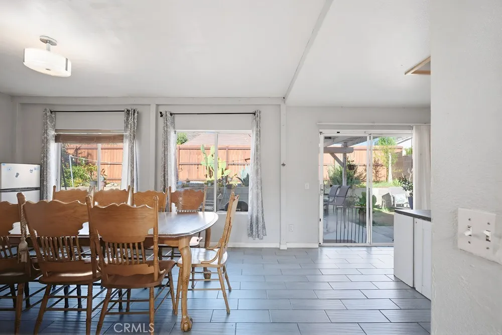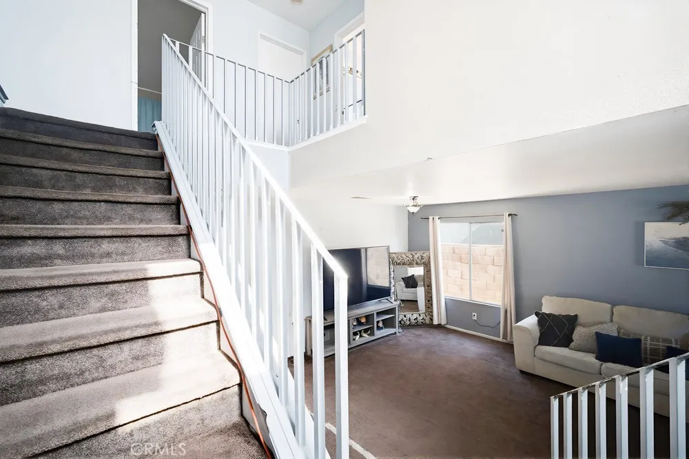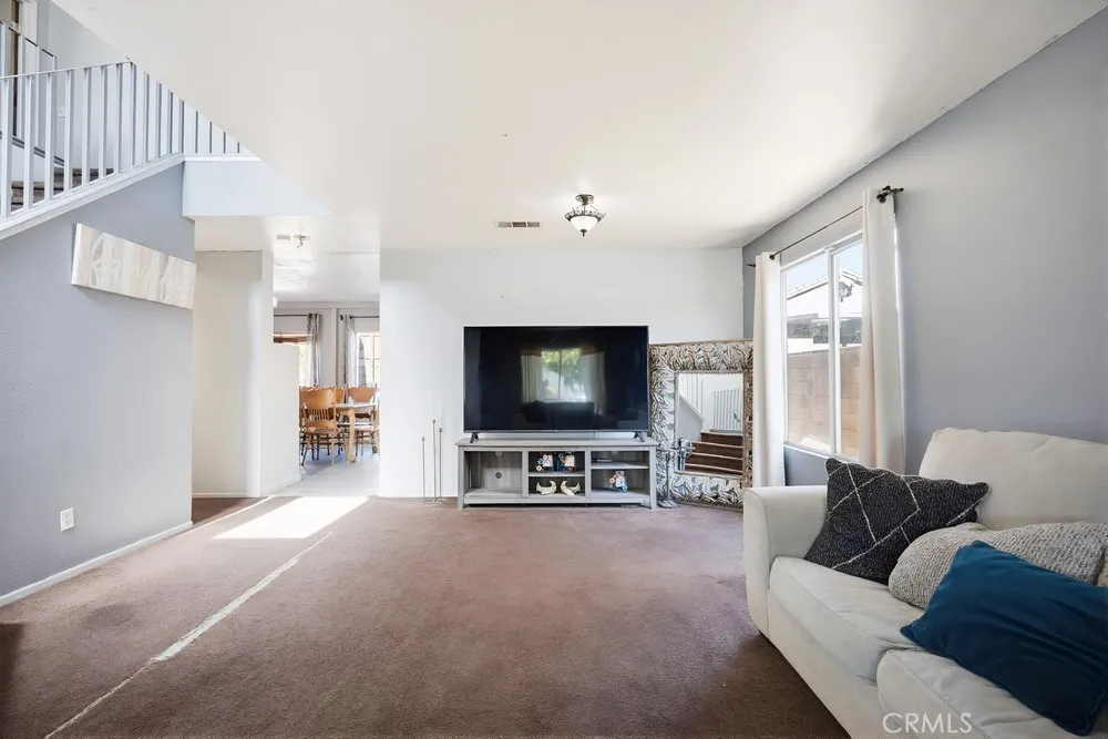 Located on a peaceful, tree-lined street, this Perris home sits in a serene neighborhood surrounded by mature landscaping and natural charm. The front exterior features lush greenery, a spacious driveway leading to a two-car garage, and a small front porch accented by a large window beside the entry. Inside, a welcoming foyer greets you with high ceilings that open to the upper level, setting a bright and airy tone. The staircase is positioned straight ahead, wrapping around with a classic banister. To the right, the living room offers a comfortable gathering space with multiple windows allowing soft natural light to fill the room. Off the living area, a short hallway leads to the laundry room, a half bath, and garage access for added convenience. Beyond the living area, the floor plan opens to a combined kitchen and dining spaceideal for everyday living and entertaining alike. The area is framed by large windows and a sliding glass door that leads to the backyard. Outside, enjoy a tranquil, garden-like setting with a small patio, lush landscaping, and plenty of room for relaxation or entertaining. Upstairs are 4 bedrooms, including a thoughtfully added fifth room that offers extra versatility for a guest room, home office, or play space. The primary suite features an en-suite bathroom with dual sinks, while another full bathroom conveniently serves the remaining bedrooms. Altogether, this home combines functionality and charm, offering comfortable living spaces inside and a peaceful, nature-filled backyard retreat outside.