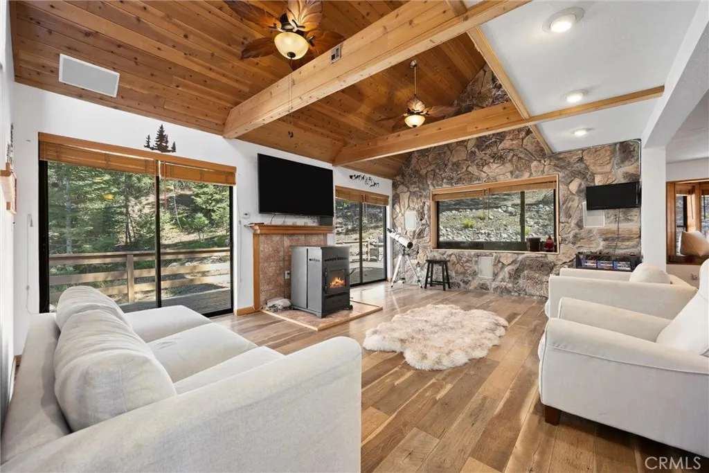 Breathtaking Mountain Retreat Spacious, Serene, and Truly One of a Kind! Words cant fully capture the beauty and scale of this exceptional turnkey home, which offers far more than its listed square footage suggests (official records show 3 bedrooms, but it has 5). Nestled beside a tranquil stream and surrounded by majestic pines and white fir trees, this fully furnished mountain sanctuary is the perfect blend of quality, comfort, and location. The main level features a spacious living room with soaring vaulted wood ceilings and a cozy pellet stove, a bright dining area with charming bay window seating, and an upscale, well-appointed kitchen. Youll also find two inviting guest bedrooms, a full bath with a luxurious whirlpool tub, and a sun-filled solarium that leads out to a newly finished wraparound deckideal for entertaining or simply soaking in the serene forest views. A fenced dog run adds convenience for pet owners. The lower level includes a fully finished basement (approx. 815 sq. ft. not included in the listed square footage), offers remarkable versatility. Currently configured with a large bedroom being used as an entertainment and billiard room. Additional features include a relaxing indoor sauna room, half bath, laundry area, oversized garage, and a workshop. High-value extras such as a Yamaha Rhino and trailer may also be included in the sale. Upstairs, discover a peaceful office space with stunning views and Starlink internet, along with a spectacular master suite with a separate shower and jetted tub that opens onto a private deck overlooking the expansive Nat