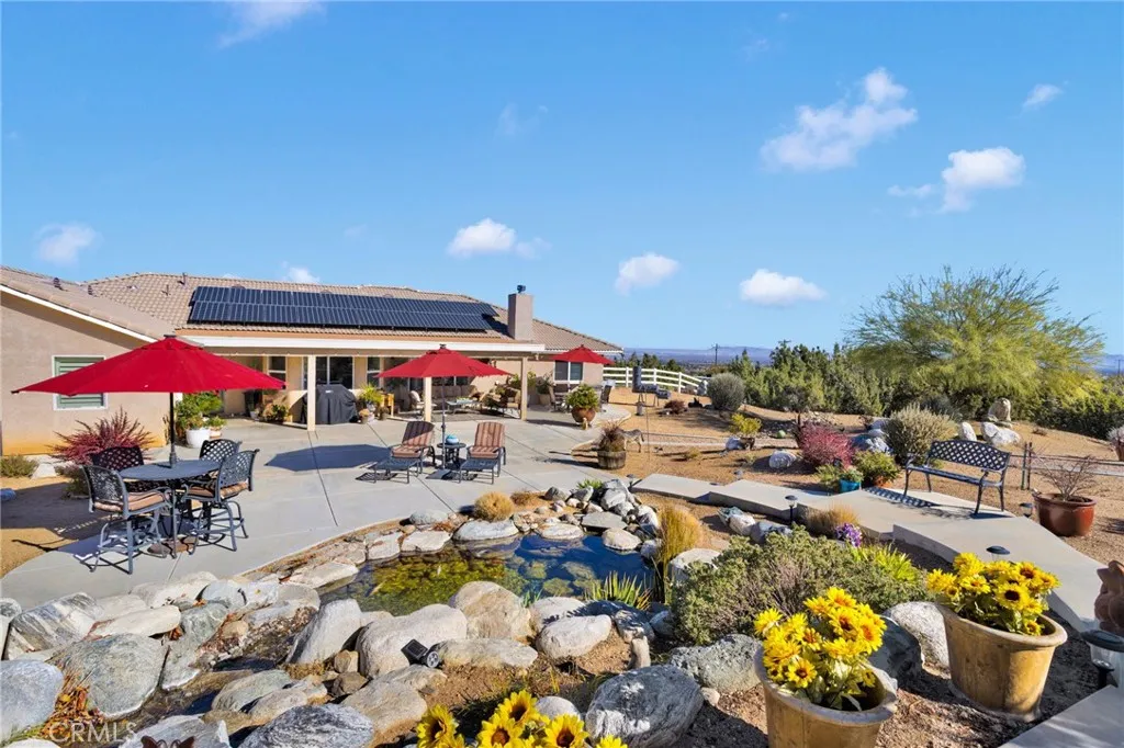 Exquisite Pinon Hills Oasis on Paved Road A Rare Offering! Experience luxury desert living in this one-of-a-kind Pinon Hills estate, perfectly situated on a paved road and spanning 2.5 acres of pristine, usable land. Meticulously maintained by its original owner, this immaculate residence radiates pride of ownership and truly shows like new. Equestrian and hobby enthusiasts will appreciate the well-appointed horse arena and barn, adding to the estates rare versatility and appeal. Step inside to discover a refined interior featuring three spacious bedrooms, two elegant bathrooms, a formal dining room, and a generously sized indoor laundry room. Designed for both comfort and style, the home offers seamless flow and exceptional attention to detail throughout. The three-car garage provides ample storage and convenience, while the expansive grounds redefine outdoor living. The professionally landscaped backyard is a private sanctuarycomplete with a tranquil waterfall and koi pond, lush greenery, and a large covered patio ideal for entertaining. From here, take in the breathtaking desert sunsets that make this property truly unforgettable. The generously sized solar system helps to keep the electric costs down year around. Located just moments from Highway 138 for an effortless commute and a short drive to Mountain High Ski Resort, this residence offers the perfect balance of serenity and accessibility. A property of this caliber is seldom availablethis is your opportunity to own a private desert retreat where sophistication meets natural beauty.