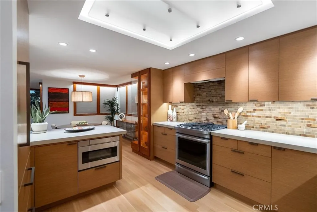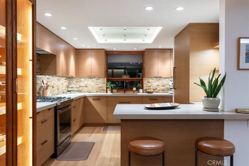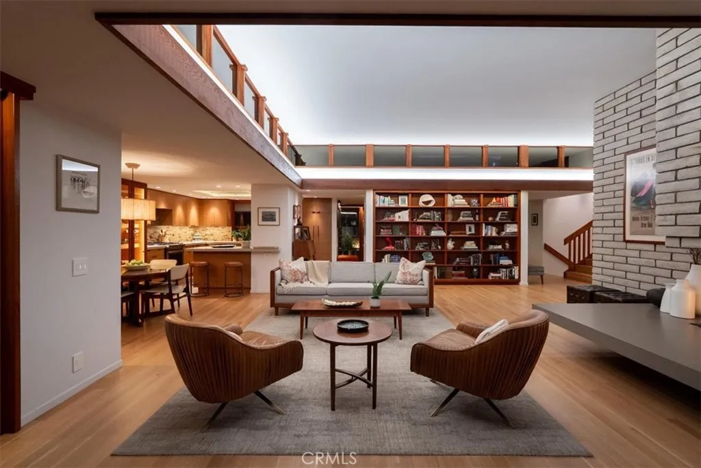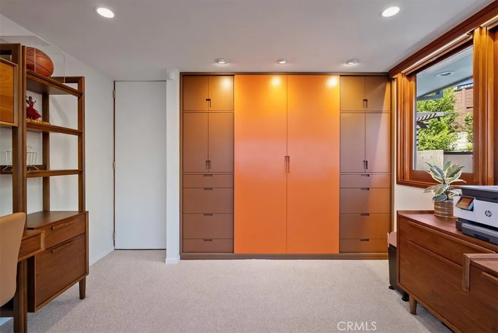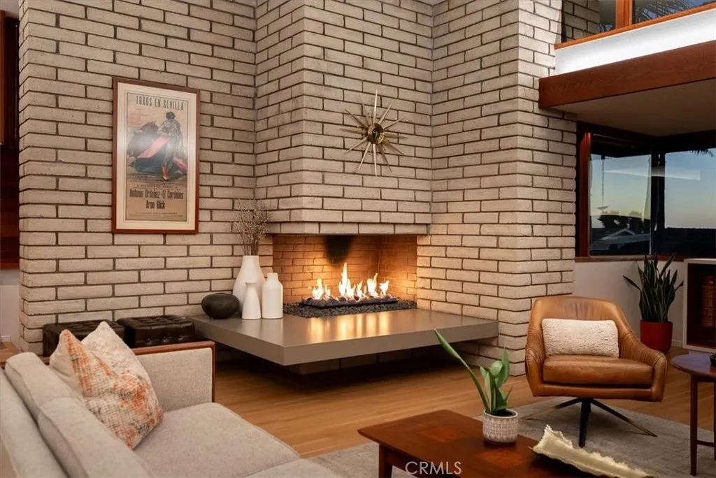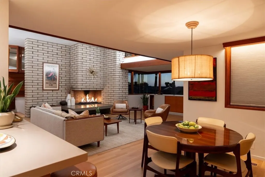 With sweeping ocean views, this masterfully curated Mid-Century Revival home in the coveted Sunset Palisades of Shell Beach, blends original architecture and elevated design. Thoughtfully renovated over the last decade, every element of this 3-bedroom, 2-bath residence has been curated for beauty, comfort, and lasting quality. Step through dramatic 12-foot double doors into a light-filled 2,245 sq ft interior where mid-century design meets sophistication with rift sawn white oak floors, custom grain-matched cabinetry, and clear-cut Cedar and Douglas Fir millwork. Original mitered glass windows frame the coastal horizon from the living space, dining area, and the outdoor terrace. In the living and den areas, bespoke TV lift cabinetry and walnut-veneered built-ins underscore the fusion of aesthetics and technology. The kitchen is a designers dream select white oak grain-matched cabinets, Bosch, JennAir, and Sub-Zero appliances, Wa-kei Waiko Japanese tile, Kessebhmer cabinetry systems, and a skylight with a custom 3form panel that floods the space with ambient light. The primary suite is a sanctuary of serenity showcasing a private balcony with beautiful ocean views, Caseta by Lutron lighting, floating cabinetry in the ensuite with a poured concrete countertop and Hansgrohe fixtures. The secondary suite and guest spaces continue the design language with walnut touches, honed limestone, and subtle under-cabinet lighting. The third bedroom, currently used as an office, features custom cabinetry with Rev-A-Lock file drawers and Formica doors. There is a seamless dialogue between