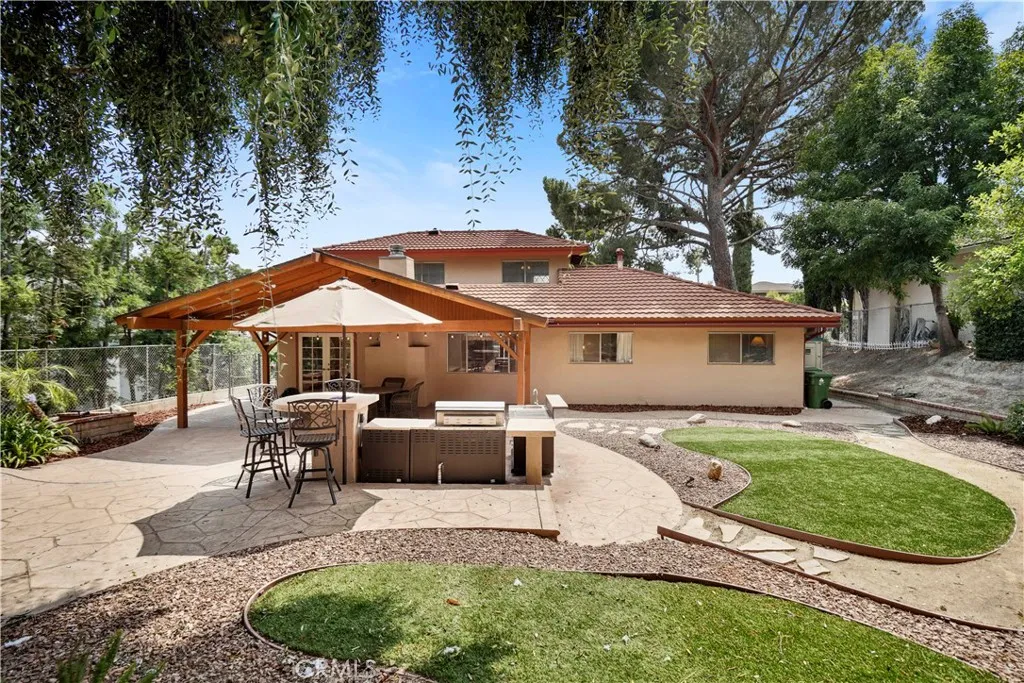 Step into 11300 Dulcet Avenue, a beautifully maintained traditional residence nestled in one of Porter Ranch's most sought-after neighborhoods. This spacious 5-bedroom, 3-bathroom home offers 2,436 square feet of well-designed living space on a generously sized lot, ideal for Buyers that value comfort, privacy & room to grow. As you approach the home, you'll be charmed by its classic curb appeal and serene setting. Step inside to discover a warm & inviting floorplan featuring a formal living room accented with an elegant fireplace that can be enjoyed by the adjoining dining room with French door overlooking the covered patio area & yard. The country-style kitchen captures the heart of the home, complete with ample wood cabinetry, granite counter tops that extends to the breakfast bar area ideal for your morning coffee rituals. The cozy family room is perfect for everyday living or your casual gatherings. Downstairs, you'll find two secondary bedrooms with a hall bathroom as well as the primary bedroom with en-suite bathroom offering direct access to the side yard. Upstairs features two additional bedrooms plus a 3/4 bathroom. Here's the best part, the Great Room, a room that provides incredible flexibility with panoramic views, this room can easily serve as a sixth bedroom, media room, playroom, or a private retreat for multigenerational living. The beautiful, secluded backyard is an entertainer's dream, framed by towering trees that create a peaceful and private atmosphere. Enjoy warm evenings dining "Al Fresco" at the custom bar-be-que island, gathering around the built-i