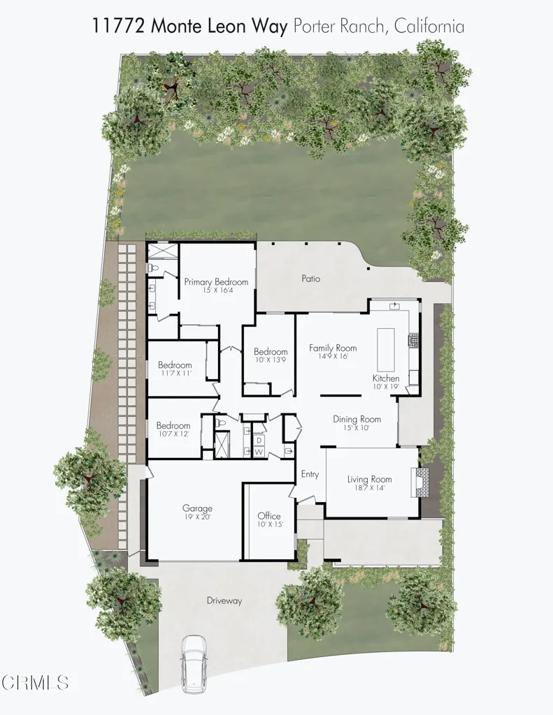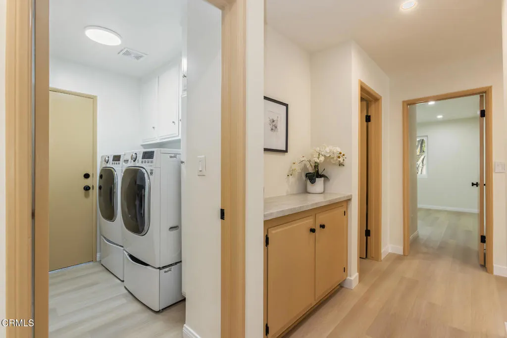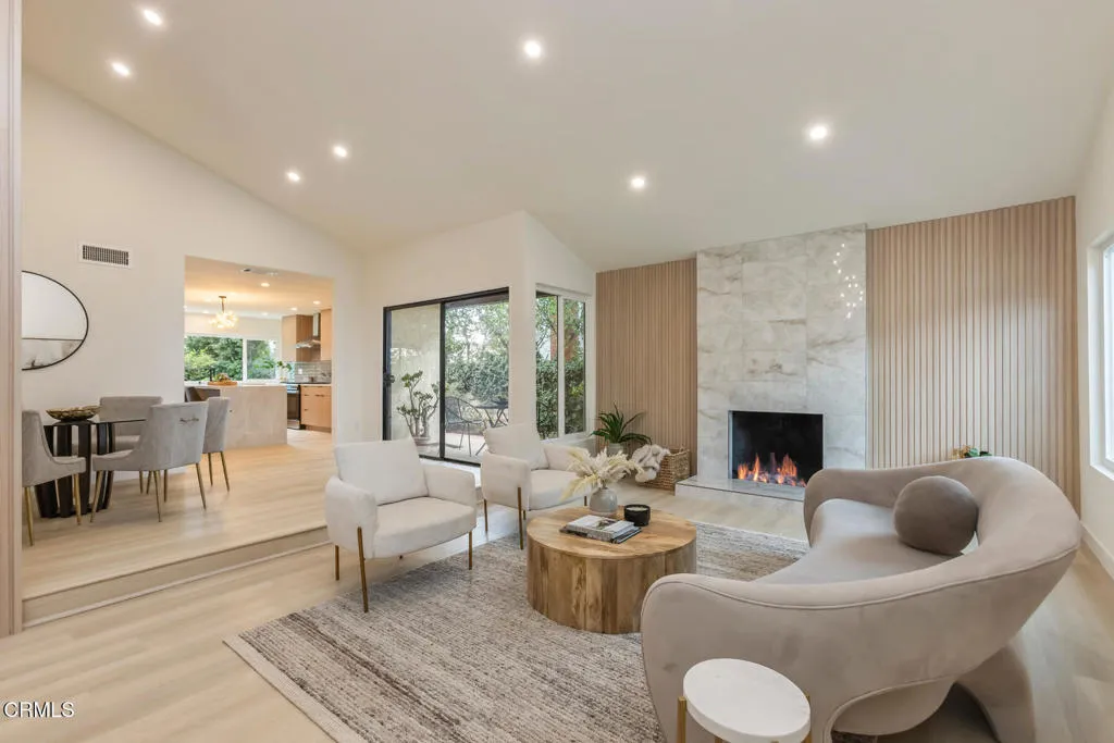 This beautifully reimagined, single-story home, located in one of Porter Ranch's most desirable neighborhoods, has been thoughtfully updated, blending modern luxury with timeless design. Step inside and into the inviting entry foyer, highlighted by high ceilings and natural light. Throughout the home, brand-new water-resistant flooring and fresh interior and exterior paint create a clean, contemporary feel.The main living area is anchored by a renovated fireplace with new tile and paneling, offering a refined focal point for gatherings. At the heart of the home, the fully renovated kitchen showcases brand-new cabinetry, Taj Mahal quartz countertops, a waterfall island accented by a mid-century modern chandelier, and a complete suite of new GE appliances--including refrigerator, range, dishwasher, and hood. The primary suite features high ceilings, a walk-in closet as well as a secondary closet, access to the backyard, and an en-suite bath. Both bathrooms have been completely renovated to include new vanities, fixtures, lighting, shower tiles/doors and more. A bonus room/office provides the ideal work from home space with bookshelves and new lighting. New windows throughout the home enhance natural light and energy efficiency, while all doors have been repainted and upgraded with modern hardware. A brand-new front door and garage door further elevate the home's curb appeal. Additional highlights include a well-appointed laundry room with LG washer and dryer, updated sink, and fixtures, as well as a fully drywalled and painted garage. Outside, enjoy the peaceful setting with