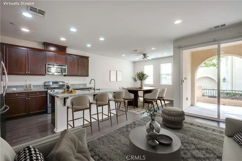 Welcome to 12531 Elevage Dr #58 located in the charming Elevage gated community in Rancho Cucamonga. Beautiful and meticulously well maintained home featuring modern day living at its best offering 1,726 living space, 3 spacious bedrooms, 2.5 baths, loft on the 2nd level, nice open floor plan with a quaint patio off the main entrance and lanai off the primary bedroom on the 2nd level, seamless natural sunlight exposure, tankless water-heater and two-car attached garage with direct access. Modern appeal with granite kitchen countertops, stainless steel appliances including refrigerator and Samsung front loading washer/dryer units, dark finish kitchen cabinets, recessed lighting and distressed wood plank flooring throughout. The home is perfectly situated as an end unit facing West. Conveniently located with close proximity to Victoria Gardens, schools, shopping and several restaurants. Schedule your private viewing today!