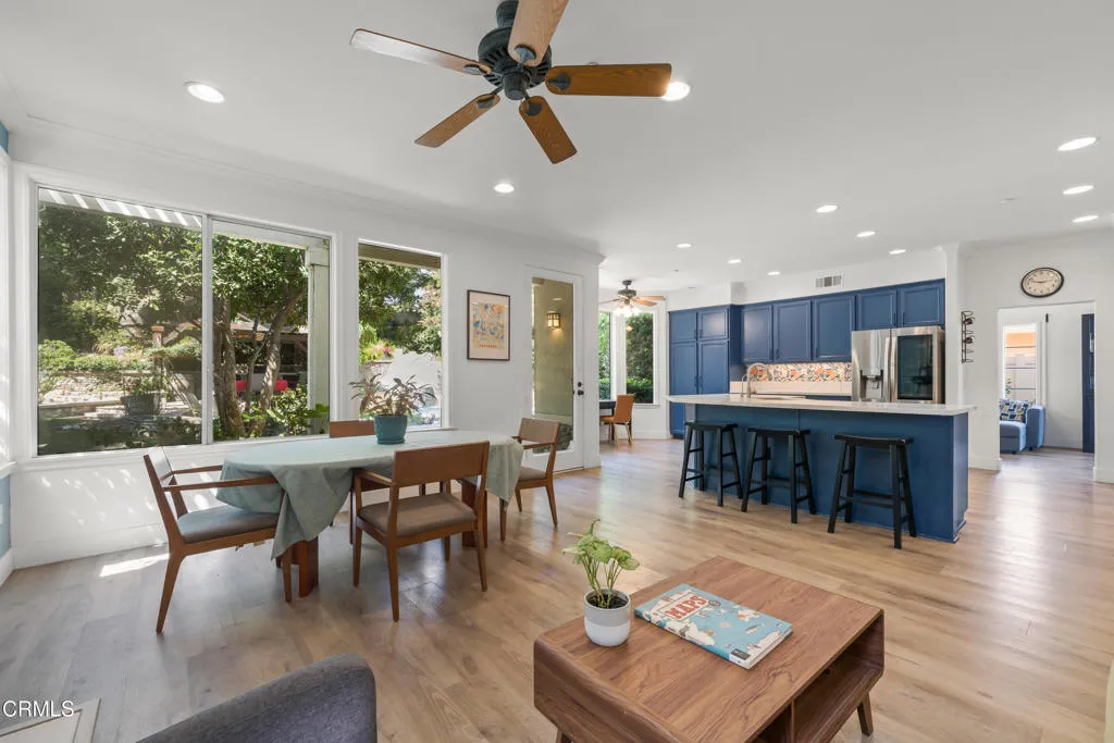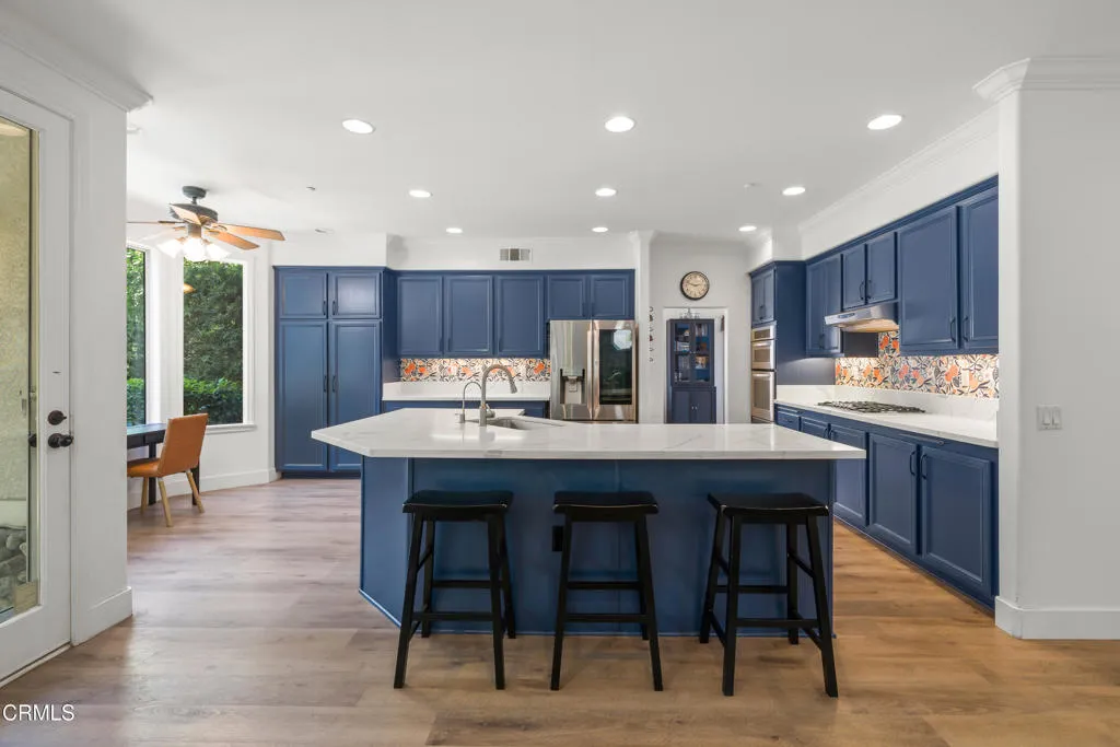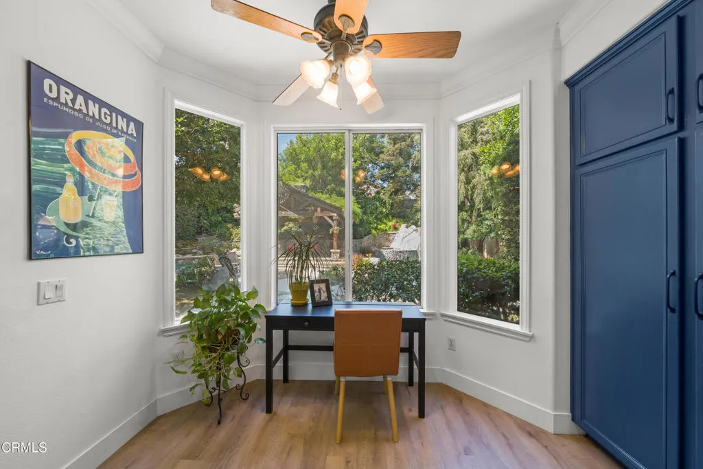 You'll fall in love with this home the minute you walk inside and then you'll scream with delight when you walk outside to the back yard. Enter into a two-story high living room with fireplace, wood floors and windows streaming with light. Flow into the dining area that looks out through French doors onto the back yard. Then into the expansive kitchen with a huge quartz preparation counter/ breakfast bar, Bosch gas cooktop and dishwasher, convection and microwave ovens and, again, a view to the back yard. The kitchen is wide open to the private nook and the family room with its own fireplace, wood flooring and wall of windows. This is where you start imagining all the great times ahead in the brilliantly imagined back yard. The center piece is the pool with a joyous waterfall cascading down from the rocks and from the overflow of the spa. The adjoining cabana with built-in BBQ and refrigerator allows you to get out of the sun and pool and into your lounge chair or hammock. From there you can enjoy the views of the garden area, the luscious trees and the welcoming patio where you're sure to entertain your guests. Back inside, the main floor also contains a guest bedroom with attached bath and direct access to the side patio/RV parking area. You get to the garage through the separate laundry room. It's a 3-car garage with a wall separating the single-car side from the two-car side. The larger side has been converted into a recreation room with its own TV, desk, and cozy sitting area - a great place for teens to hang. This 300 square feet space is not included in the living ar