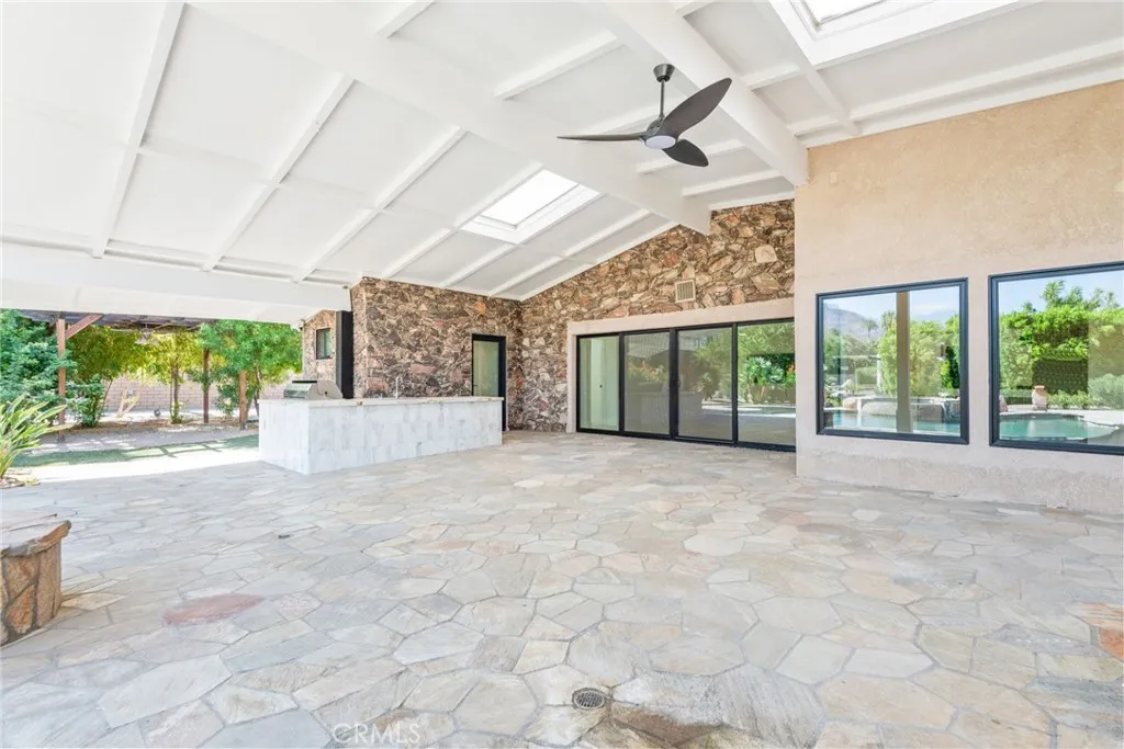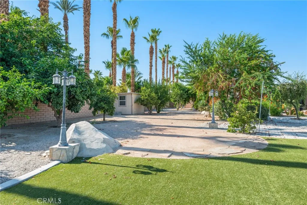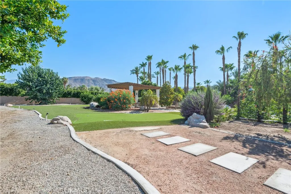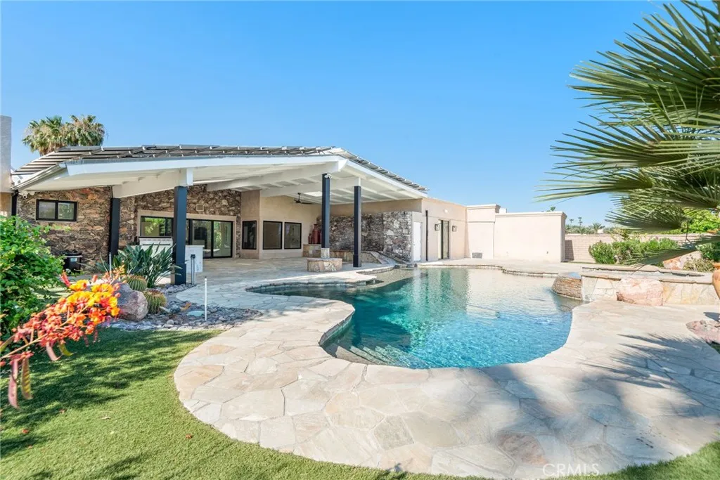 Welcome to your private, fully remodeled oasis in the exclusive Clancy Lane area of Rancho Mirage. This extraordinary 4-bedroom, 4-bathroom estate sits on an oversized 1-acre (40,946 sqft) lot offering the tranquility of a private park with lush landscaping, mature fruit trees, and luxurious finishes throughout. A circular driveway leads to a striking custom pivot front door, setting the stage for the sophisticated design inside. Step into soaring ceilings, an open-concept layout, and abundant natural light enhanced by new modern windows and sliding glass doors. The interior showcases stylish accent walls, large-format porcelain tile flooring, modern aluminum AC registers, all-new recessed LED lighting, and exquisite Restoration Hardware chandeliers. The fully updated three-unit HVAC system, new electrical switches, and chic interior doors and moldings reflect meticulous attention to detail. The gourmet kitchen is a designers dream, featuring Shinoki wood cabinetry, premium quartz countertops, ZLINE Gold Signature Series appliances, a built-in 60-bottle wine cooler, and elegant fixtures. The expansive primary suite offers direct access to the pool and deck, a spa-like bathroom with a soaking tub, oversized shower, dual vanities, and a spacious walk-in closet. Three additional guest bedrooms are positioned on the opposite wing for maximum privacy. Enjoy resort-style outdoor living with a sparkling pool and spa, custom water features, an outdoor kitchen with porcelain and marble tile, built-in seating around a cozy firepit, a putting green, and multiple garden vignettes. The