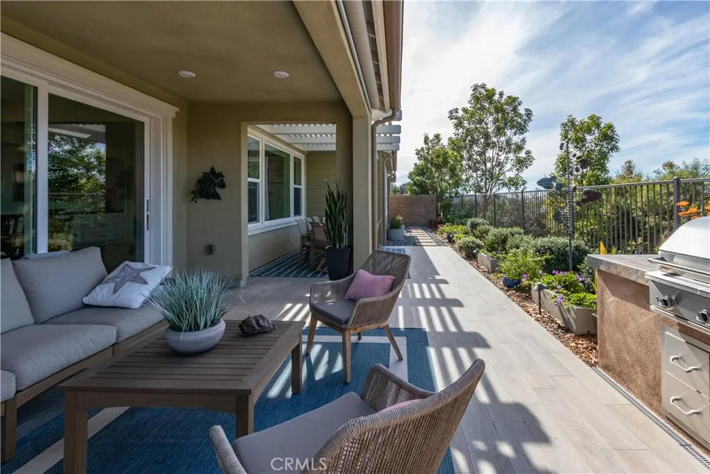 Welcome to 5 Garcilla in the popular 55+ Esencia Community of Rancho Mission Viejo. This spacious one story 1810 square foot detached home is positioned beautifully for outstanding sunset views from the living room, dining room and kitchen. The lot offers expanded room for a large California room, covered patio area, and a built in BBQ. The rear yard is graced with 7 fruit trees, 5 raised vegetable beds and immaculate grounds abounding in flowers.. As you enter the front door and beyond the foyer, you will will be met with a wide open floor plan from living room to dining area to gourmet kitchen. High ceilings with recessed lighting, bright white paint, laminate wood floors and expansive windows bathe this area in natural light. The kitchen is adorned with quartz counters, decorator backsplash, stainless appliances and white shaker cabinets. The primary bedroom boasts a beautiful sunset view, The ensuite bathroom has been upgraded and features 2 walk in closets. One has extensive built-ins, make up area and window. The 2 additional bedrooms are accompanied by 2 bathrooms. There is a separate laundry room. The 2 car direct access garage sports epoxy floors. Enjoy the resort lifestyle and exclusive use of the Gavilan 55+ amenities including The Hilltop Club, The Perch, The Hacienda, The Outlook, BBQ Barn and The Getaway. Enjoy the state of the art fitness center, salt water pool, spa, cabanas, yoga studio, firepit and social lounge.
