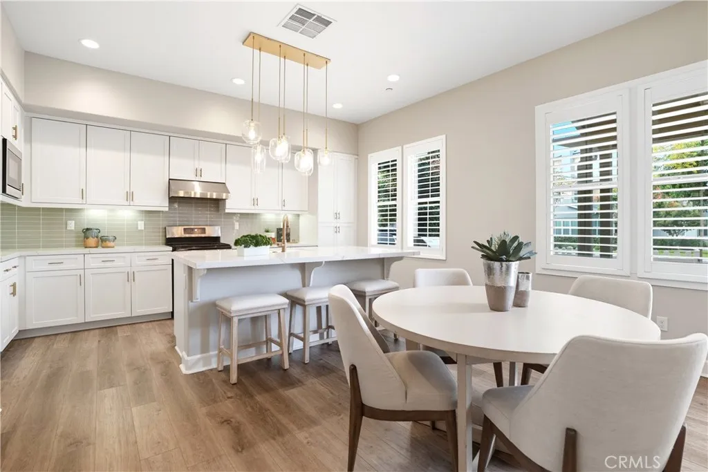 Offered by the original owner, this beautifully upgraded home blends modern design with luxury finishes throughout. From the moment you arrive, you'll be captivated by the spacious front yard, and oversized covered patiocomplete with built-in seating and a cozy firepit, perfect for entertaining or enjoying a quiet evening outdoors. Step inside to discover an open-concept layout featuring elegant vinyl plank flooring, fresh interior paint, plush new carpet, recessed lighting, and upgraded baseboards. The bright and airy living room flows effortlessly into a dining area and a chef-inspired kitchen equipped with stainless steel Energy Star appliances, a gas range with hood and griddle, a self-cleaning convection oven, modern tile backsplash, gorgeous quartz countertops, and a large center island with farmhouse sink and breakfast bar. Upstairs, the luxurious primary suite offers a true retreat with a spacious walk-in closet, beautifully upgraded ensuite bathroom with tiled shower and floor, quartz countertops and dual vanities. Two additional bedrooms, a full guest bathroom with dual sinks, and an upper-level laundry room with added cabinetry provide plenty of space and convenience for daily living. The third-level covered rooftop deck boasts panoramic mountain views and is ideal for BBQs, al fresco diningwith a built-in sink, refrigerator, and counter spaceor simply lounging with a built-in TV setup. Additional home features include touchless keypad entry, custom window coverings including wood shutters and blinds, double pane windows, upgraded light fixtures, downstairs frame