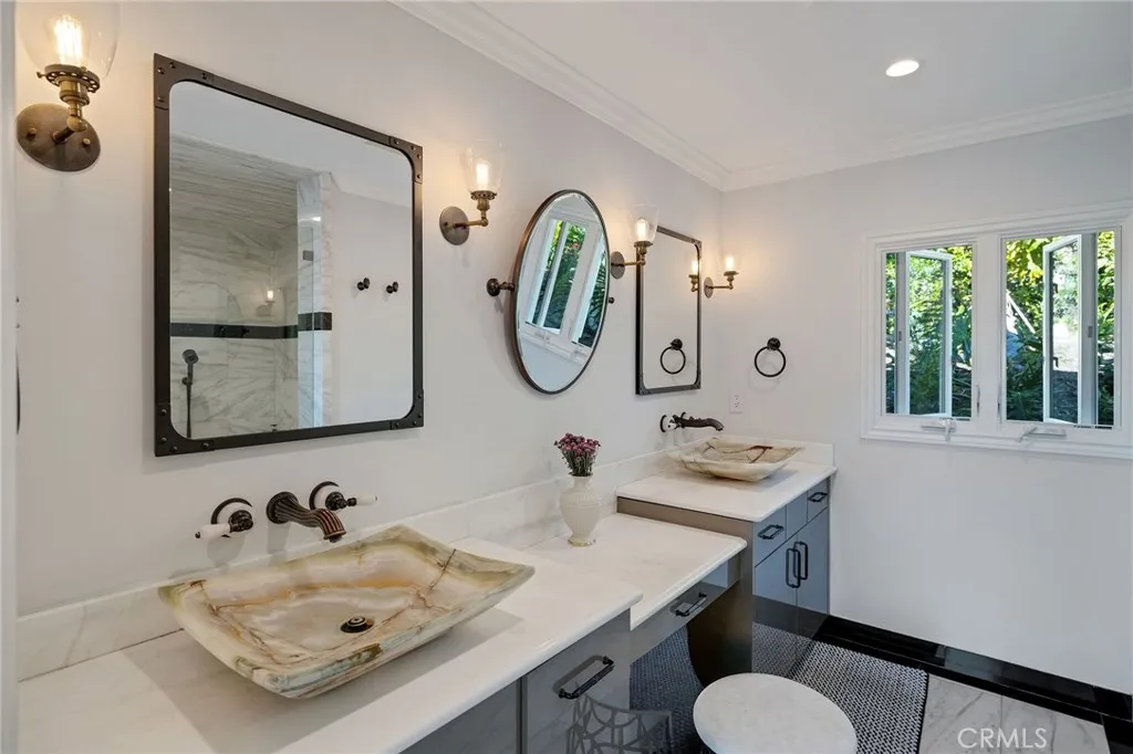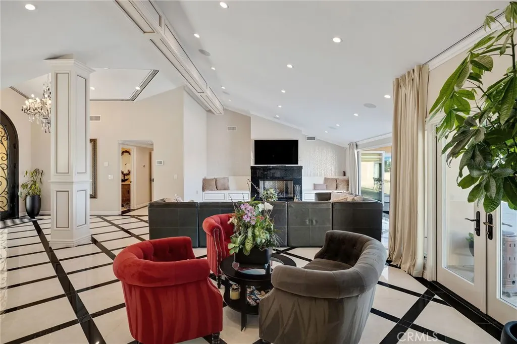 Love at first sight. The circular, stone horseshoe driveway with steps leads you to this thoughtfully curated, extraordinary single level residence with impeccable craftsmanship and breathtaking views, on an over 18,000 square foot lot, set atop on a cul-de-sac in the exclusive and sought after Del Cerro neighborhood of Palos Verdes. As you step inside this remarkable and exquisitely custom-designed home through the grand front doors, you are greeted with a spectacular expansive, open-concept floor plan with soaring ceilings and a wall of windows and bi-fold sliding glass doors, flowing seamlessly, capturing stunning views of city lights and ocean, thoughtfully integrated indoor and outdoor living for effortless entertaining and an uninterrupted serenity. This exceptional floor plan and the sprawling backyard and patio with intricate stonework integrates living, dining and entertaining, a year-round comfort and enjoyment. An impressive signature marble fireplace anchored by two custom hand-painted walls and built-in seating invites extra warmth to the living room. The dining area is adjacent to the elegantly designed bar and an opulent chandelier. A standout feature, a culinary master piece, a tastefully-designed kitchen with twinkling lights, attractive center island and seating, two sub-zero refrigerators, a Wolf stove is ideally situated adjacent to the great room. On the West side, a master bedroom with view, ample closet space and an impressive ensuite bathroom. Three more bedrooms and an attractive bathroom with double sinks and shower and an elaborately designed powd