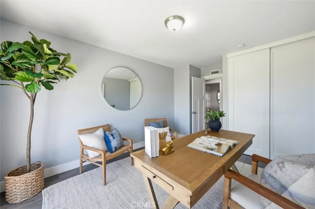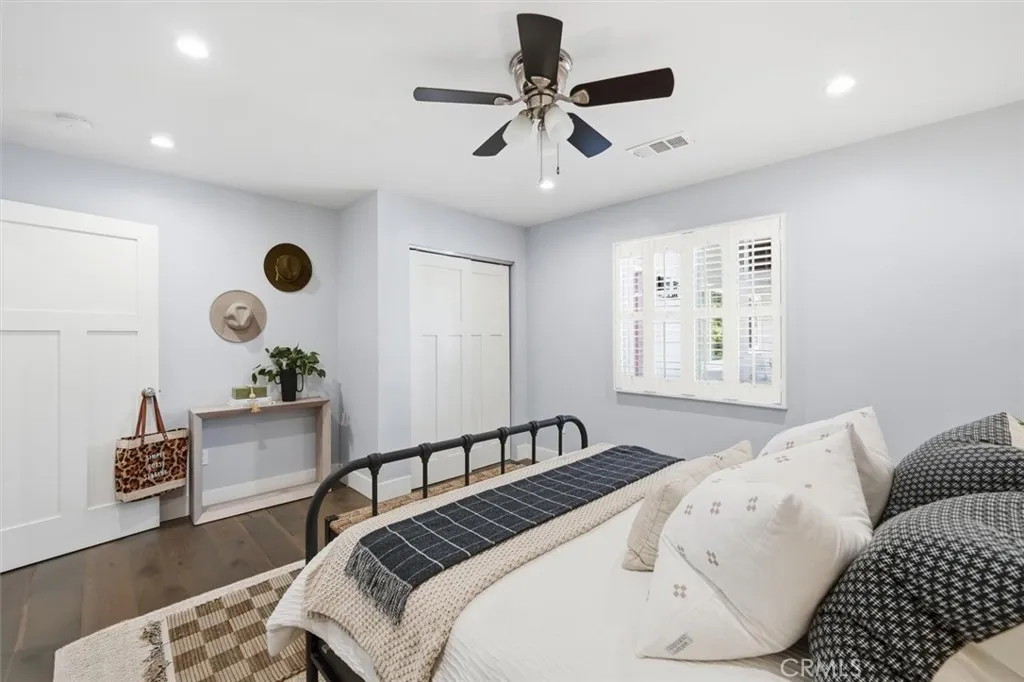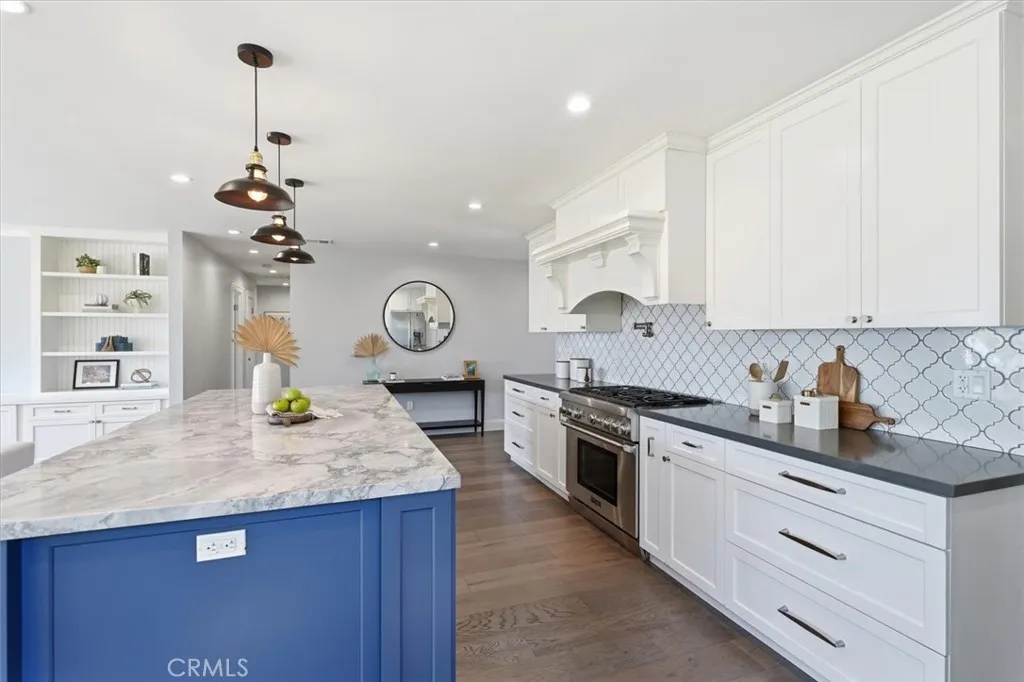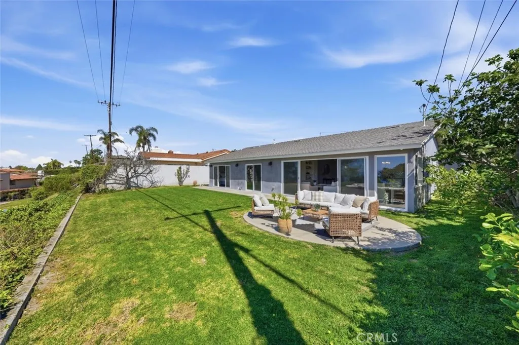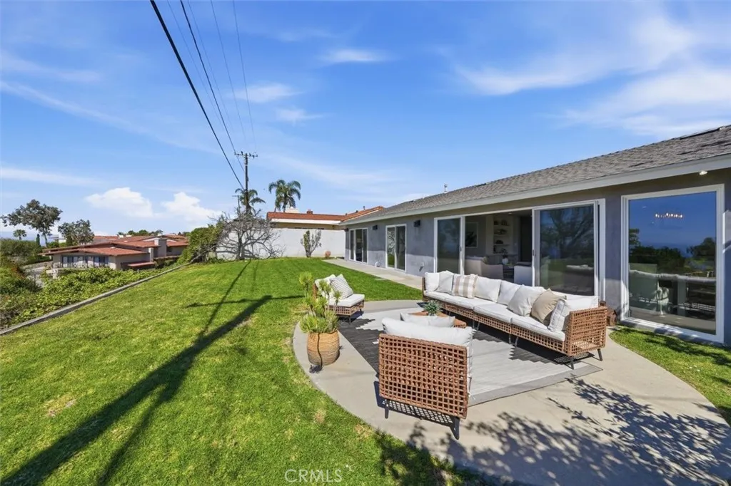 Perched above the Pacific in Rancho Palos Verdes sought after Los Verdes neighborhood, this beautifully renovated home captures sweeping ocean views and the kind of sunsets that define coastal California living. Inside, a bright open layout unfolds across wide plank flooring, with a wall of glass that draws the horizon into the main living spaces and opens to an expansive, flat backyard. The effect is easy and relaxed, with the indoor and outdoor experience blending naturally as light moves through the home throughout the day. At the center of the home, the kitchen is anchored by a sculptural Dolomite stone island, balanced by clean lined cabinetry, a Thermador six burner range, wine fridge, and a generous butlers pantry. The layout opens seamlessly to the living and dining areas, creating one expansive gathering space with uninterrupted sightlines toward the ocean. Five bedrooms provide flexibility for a range of living arrangements. One bedroom and full bath are positioned privately on the opposite side of the home, well suited for guests, extended family, or a quiet work from home space. Four additional bedrooms extend down the main hallway, including two that capture west facing ocean views. The primary suite offers a calm retreat with sliding doors that open to the backyard and sunset views beyond, while the ensuite bath features dual sinks and a spacious walk in shower. The bathrooms throughout the home have been tastefully updated to match the homes fresh coastal palette. Outside, the backyard offers a rare stretch of flat lawn and patio space, ideal for outdoor dini