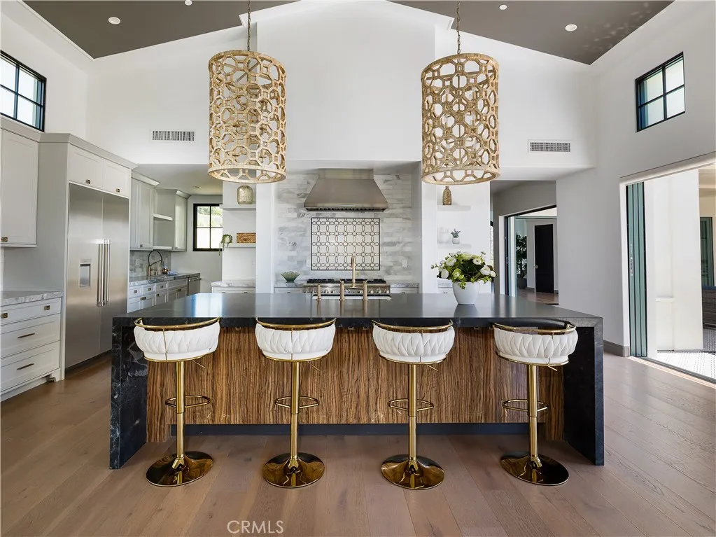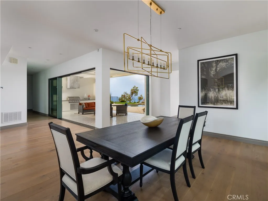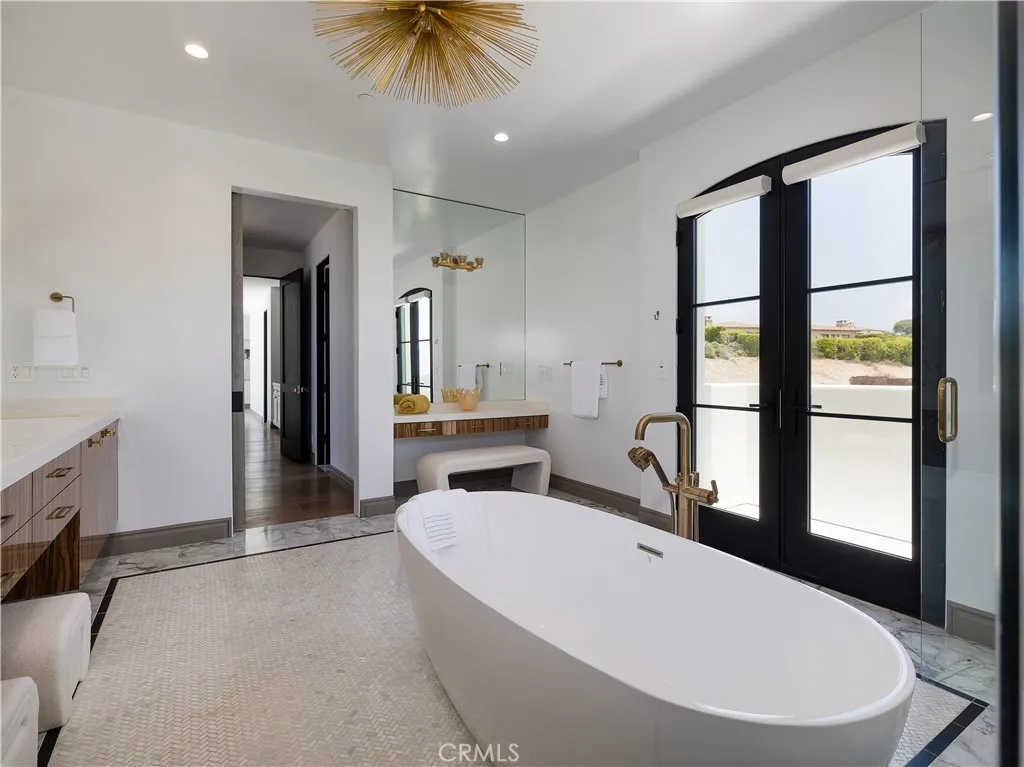Built in 2019, this Spanish-style residence in The Estates at Trump National Golf Course blends modern design with sweeping Pacific and Catalina Island views. Surrounded by nature reserves and an award-winning golf course, the home offers 6 bedrooms, 6.5 bathrooms, and over 6,100 sq. ft. of refined living space. A 12-foot Pinkys wrought iron door opens to a curved marble staircase, glass-enclosed wine display, and expansive dry bar. The chefs kitchen showcases a leathered marble island, Thermador appliances, Italian Macassar Ebony cabinetry, and rose gold Brizo fixtures, complemented by a butlers pantry with built-in coffee station. Four pocket sliders create seamless indoor-outdoor living, connecting to a 375 sq. ft. California room with built-in BBQ. The backyard features a pool, spa, firepit, and detached guest suite ideal as a studio, office, or pool house. Downstairs also includes a guest bedroom with ensuite bath, a powder room, and an additional private room with bath off the pool areaperfect for guests or a home office. The primary suite offers a large walk-in closet, panoramic ocean views, and a spa bath with marble shower and soaking tub. Additional highlights include ensuite guest rooms with balconies, custom lighting, dual-zone HVAC, and a 3-car garage. Residents enjoy Trump National Golf Club privileges, concierge services, and 24/7 security.