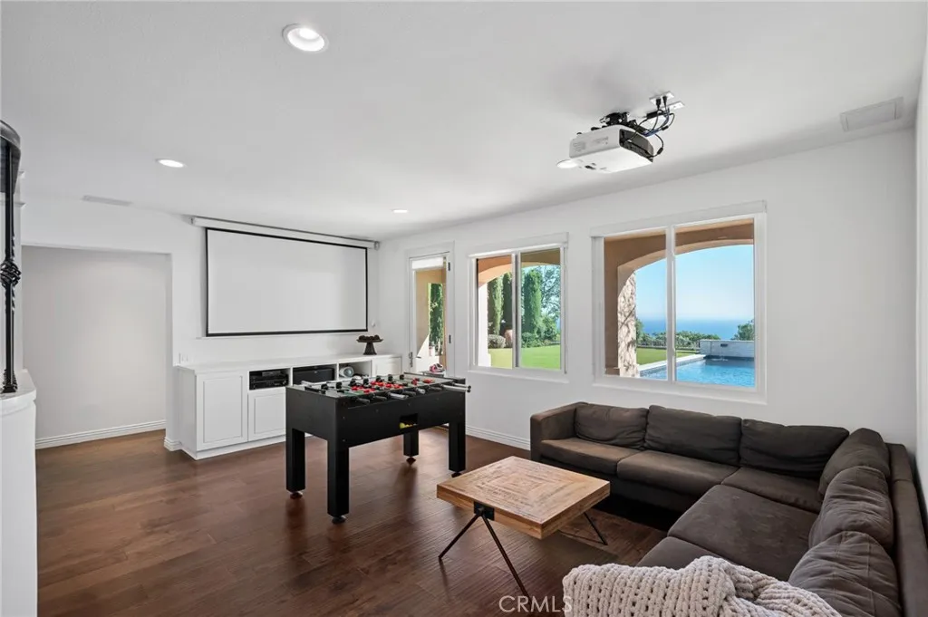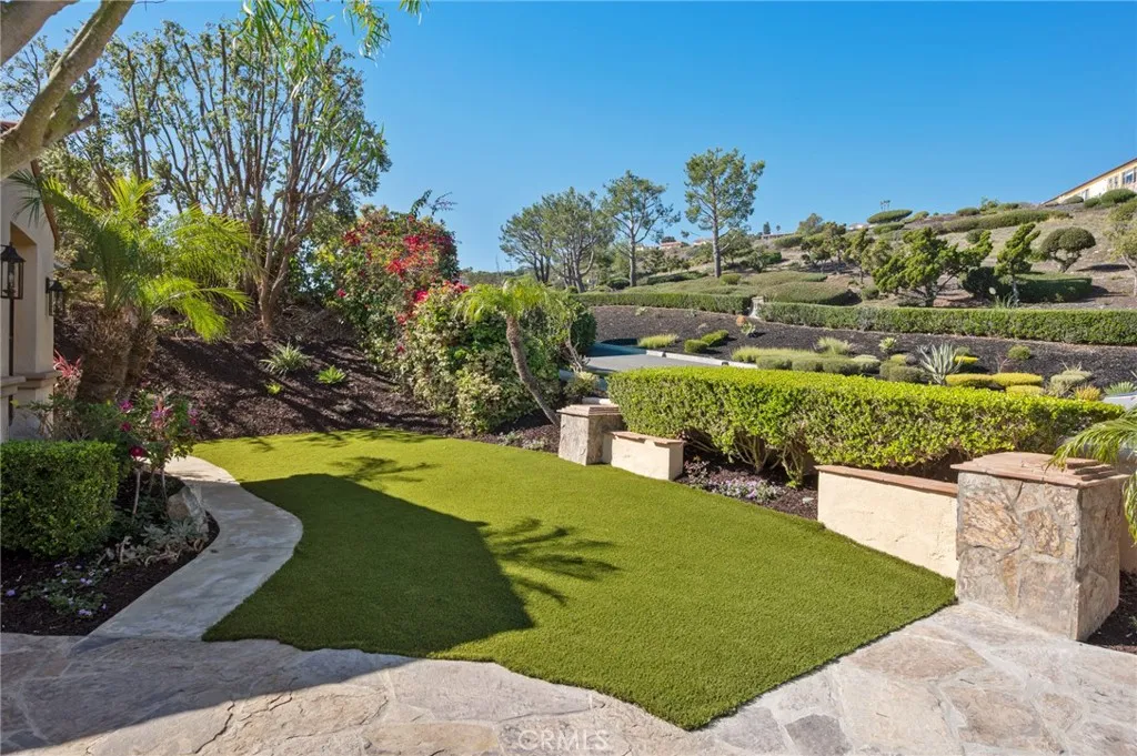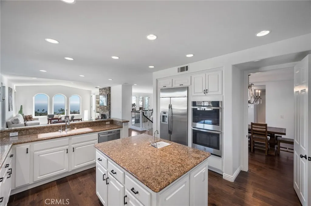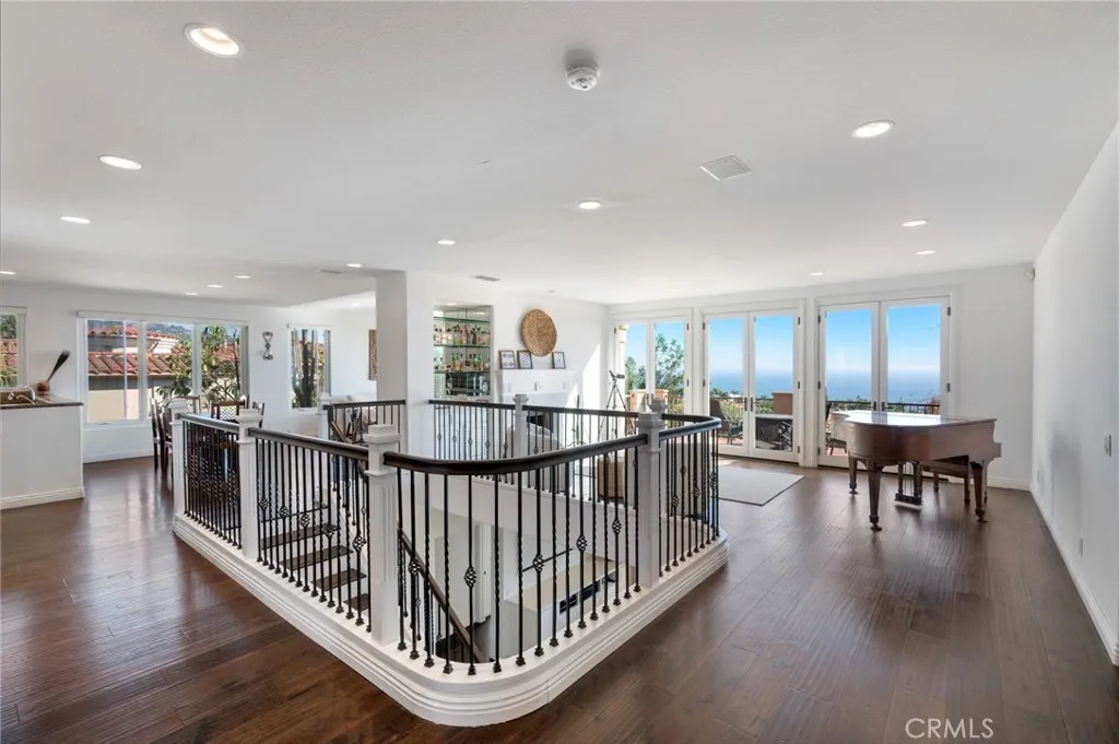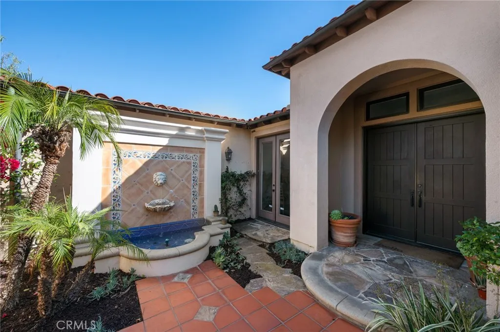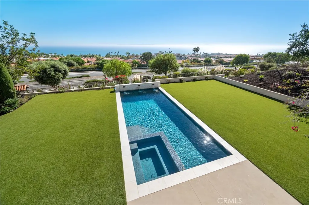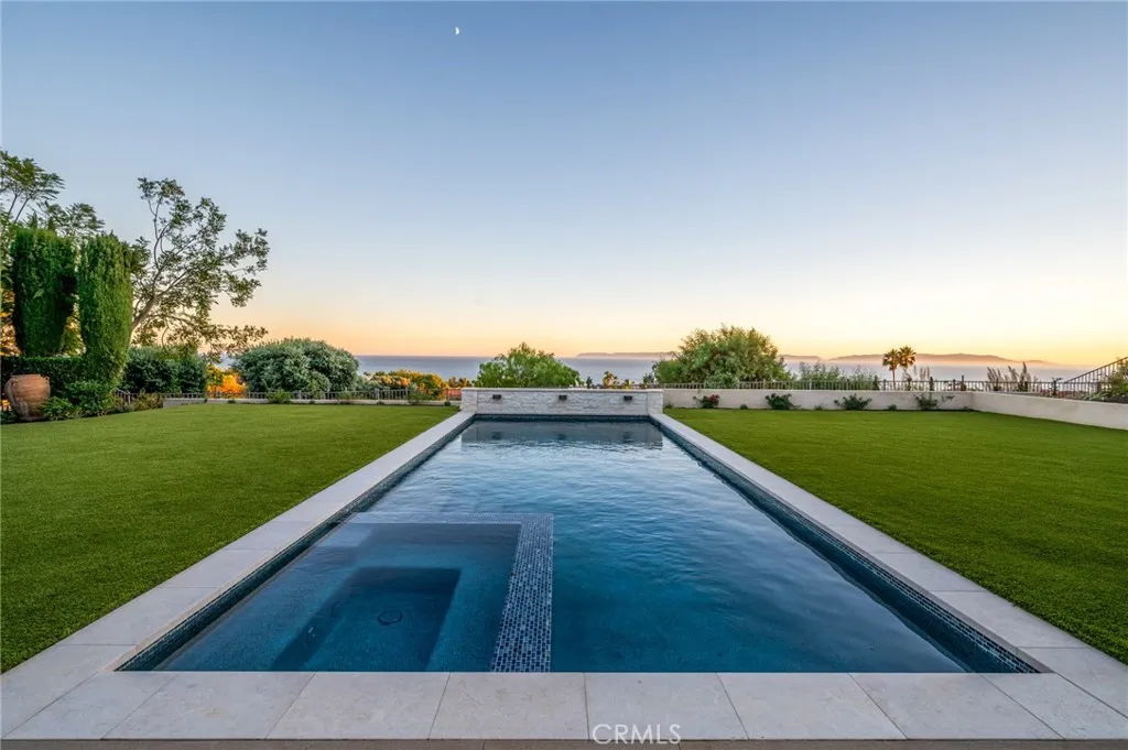 Perched above the Terranea Resort, this exquisite former model home captures breathtaking ocean and Catalina views from nearly every room. A tranquil courtyard and fountain welcome you into a bright, elegant interior where brand new windows and doors frame the stunning coastal panorama. The open living and family rooms extend to an expansive balcony, perfect for enjoying the sea breeze and endless views. The gourmet kitchen is a showpiece, featuring granite countertops, a large island, new stainless steel appliances, and a sunny breakfast area. The formal dining room shines with a coffered ceiling and chandelier, while the living rooms custom stone fireplace and wet bar create a warm, refined ambiance. The main-level primary suite offers a serene retreat with ocean views and a recently renovated spa-inspired bath complete with a tub, separate vanity sinks, and walk-in shower. A stately office opens to the front courtyard, and a stylish powder room completes the upper level. Downstairs includes two bedroom suites, plus two additional bedrooms with a Jack-and-Jill bath, a spacious family room, dedicated laundry room, and wine cellar. Outdoors, enjoy brand new landscaping, a turf backyard, and a sparkling new saltwater poolall set against the gorgeous ocean and Catalina backdrop, perfect for entertaining or relaxing in luxury. Additional highlights include a brand new HVAC system, hardwood floors, wrought iron accents, and Tuscan-inspired finishes that blend timeless elegance with modern comfort. Conveniently close to top-rated PV schools, shops, and the coast.