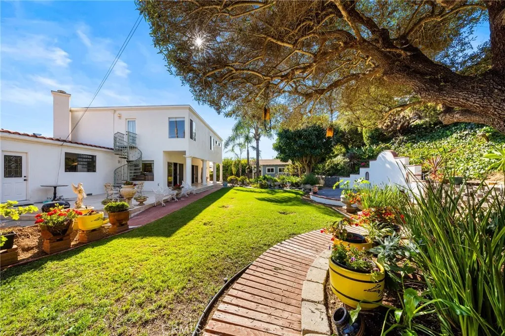 This VIEW home truly has it all! From the moment you pull up, youll notice the amazing curb appeal, a spacious three-car garage, and over 3,300 sq. ft. of thoughtfully designed living spaces. The floor plan flows beautifully throughout, and the property sits on a large, private lot with panoramic ocean, Catalina, and coastline VIEWS from every upstairs room. Lovingly cared for and cherished for decades, this 4-bedroom and beautifully appointed 5 bath home welcomes you with a dramatic formal living room featuring a massive fireplace. The oversized dining room is perfect for hosting gatherings, while the upgraded kitchen shines with custom cabinetry, lovely garden window and stainless steel appliances. With two primary suites one upstairs and one downstairs this home offers flexibility and comfort for all lifestyles. Upstairs, a huge family room and primary suite open to a large patio, where you can soak in breathtaking views. Step outside into the lush backyard, complete with manicured landscaping, perfect lawn, beautiful garden, and plenty of privacy. This is more than a home its a retreat. Close to award winning PV schools, endless ocean trails and easy access to the city and major roads.