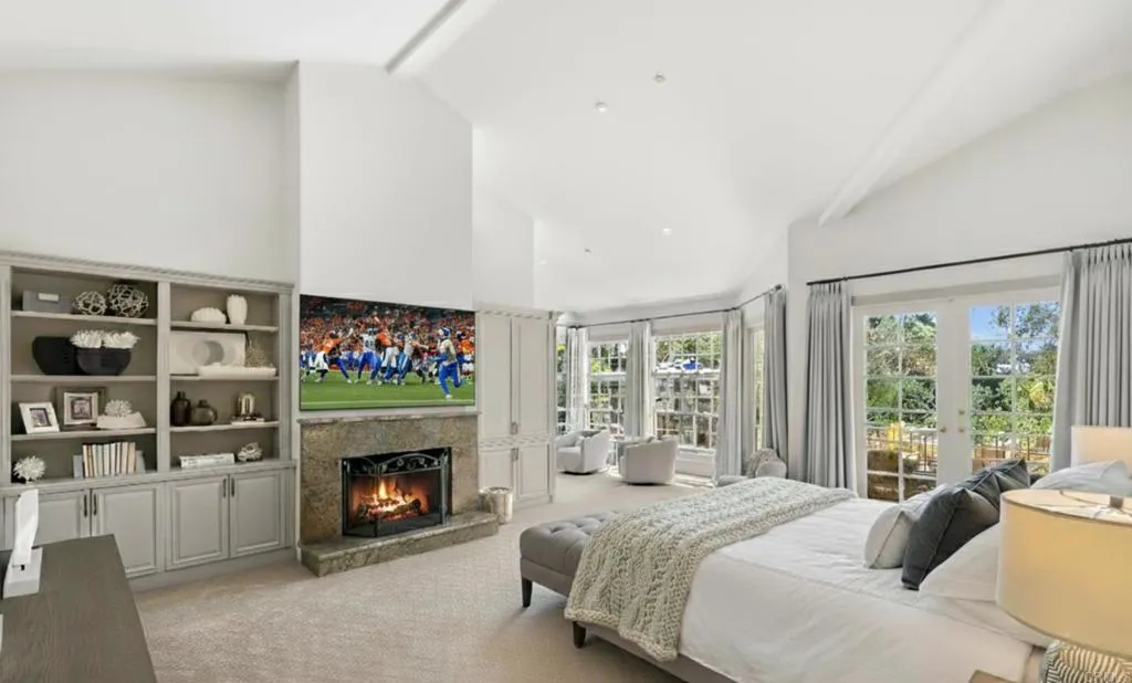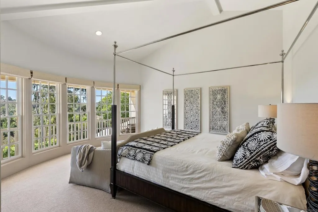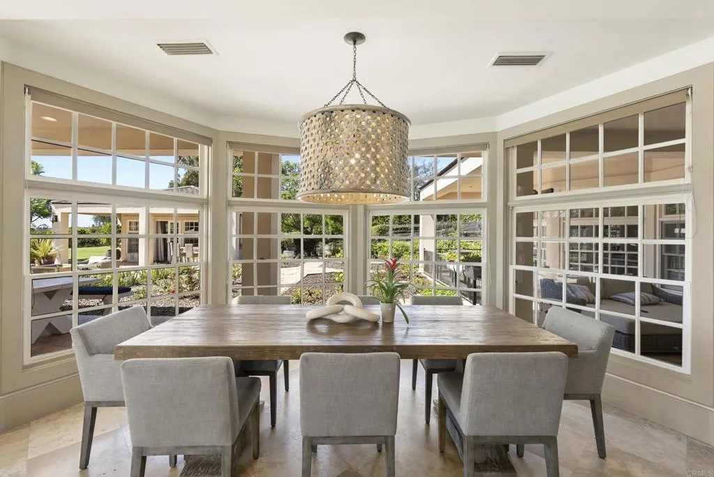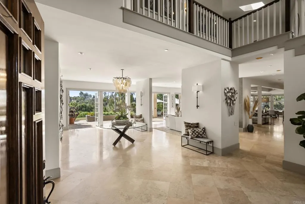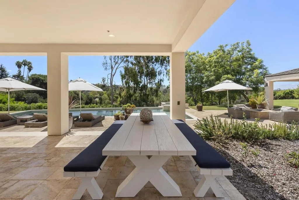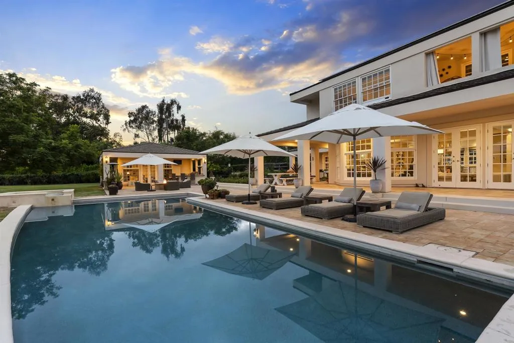 Behind private gates in the heart of the Rancho Santa Fe Covenant, this timeless estate offers the perfect blend of sophistication, comfort, and resort-style living on two pristine acres. With 7,717 square feet of living space, the property encompasses a 5-bedroom, 5.5-bath main residence and a detached 1bed/1bath guest casita, surrounded by lush landscaping and expansive grounds designed for both privacy and entertaining. Inside, the homes modern traditional design combines classic craftsmanship with warm, inviting spaces. Soaring ceilings and an open floor plan create a natural flow, while large-scale windows and French doors frame garden views and bring the outdoors in. Formal living and dining spaces are balanced by casual gathering areas, including a game room with a bar, designed for effortless entertaining. The gourmet chefs kitchencomplete with butlers pantry, multiple ovens, and a sunny breakfast nookopens to the family room, where mornings and evenings alike are centered around connection. The first-floor primary suite commands its own private wing, featuring a sitting area with fireplace, French doors to a covered loggia, dual dressing rooms, and a spa-inspired bath. Upstairs, three additional en-suite bedrooms are joined by generous lounge areas and a bonus room, creating the ideal retreat for family or guests. Outdoors, the property transforms into a private resort. A sparkling pool and spa are complemented by multiple firepits, a covered outdoor living/dining room, and an outdoor kitchen. Olive trees strung with lights create enchanting spaces to gather, while