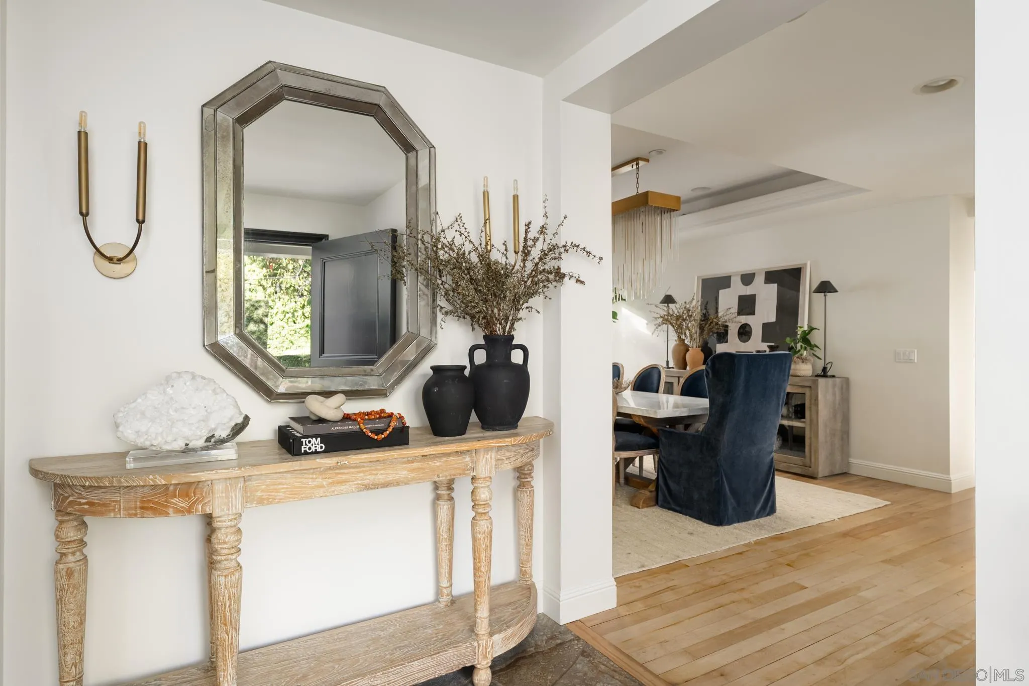 Ideally located on one of the most sought-after streets in the renowned Rancho Santa Fe Covenant, this enchanting single-level home seamlessly combines charm, sophistication, and functionality. Your private oasis awaits with an expansive backyard that borders acres of open space, impeccably groomed trails, and just a short walk to the Rancho Santa Fe Village, the acclaimed Roger Rowe Elementary and Middle schools and the Rancho Santa Fe Golf and Tennis clubs. You will immediately fall in love with the beauty of the lush landscape and the inviting private courtyard entry. The home boasts a freshly remodeled kitchen, and exquisite reclaimed maple floors throughout. It has a sun-drenched great room, and a gourmet eat-in kitchen, that seamlessly open onto the pool and entertaining areas with westerly views and gentle ocean breezes. The interior design includes 5 bedrooms, 4.5 baths and floor-to-ceiling windows and French doors that seamlessly caters to the indoor/outdoor living you can enjoy year-round in San Diego.